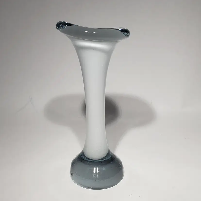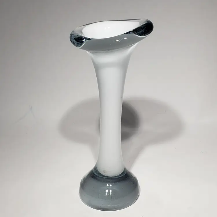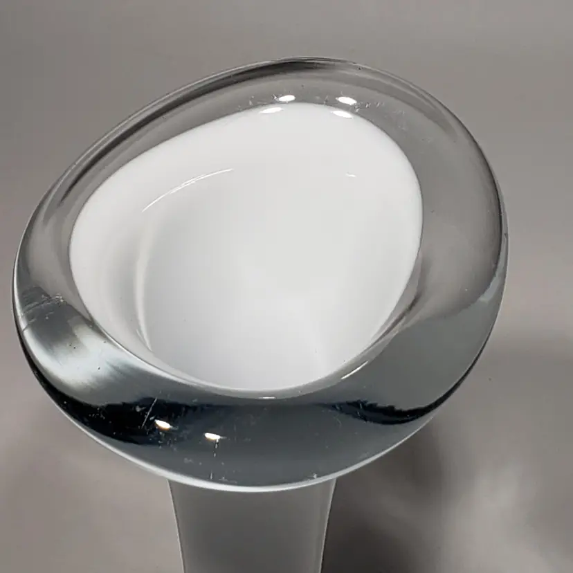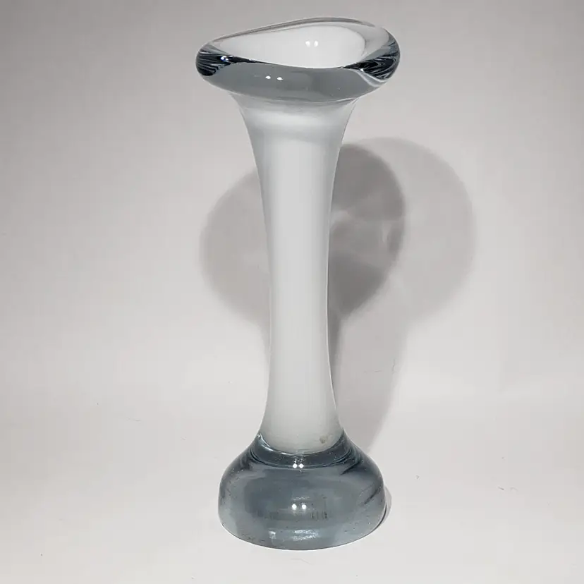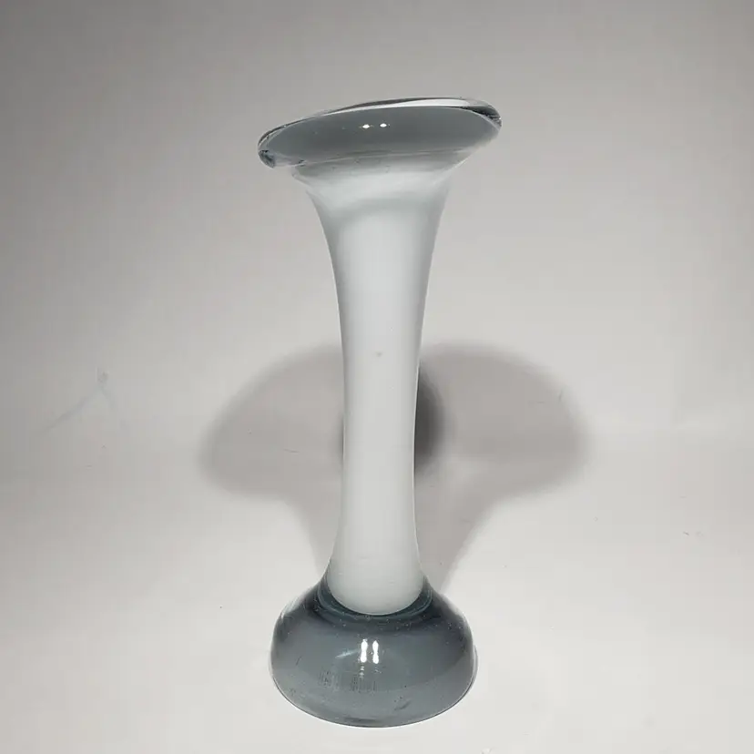 Hand Blown Cased White Clear Stretch Swung Glass Art 8" Bud Vase Measures: 3" x 2.25" x 8" Pre-owned. No cracks. Flea bites and small chip on base edge. See Photos.