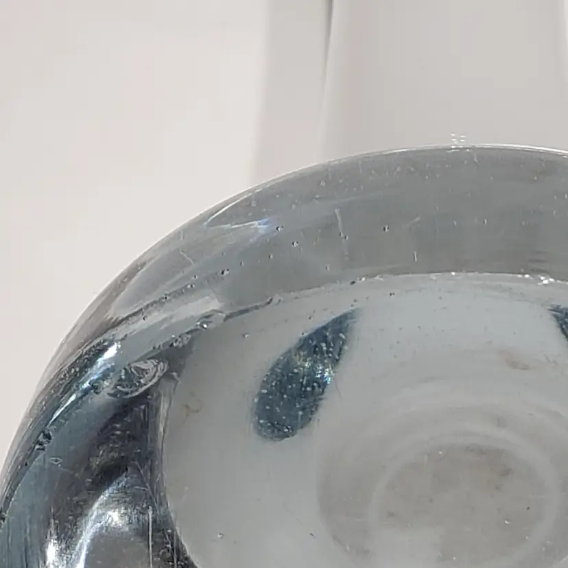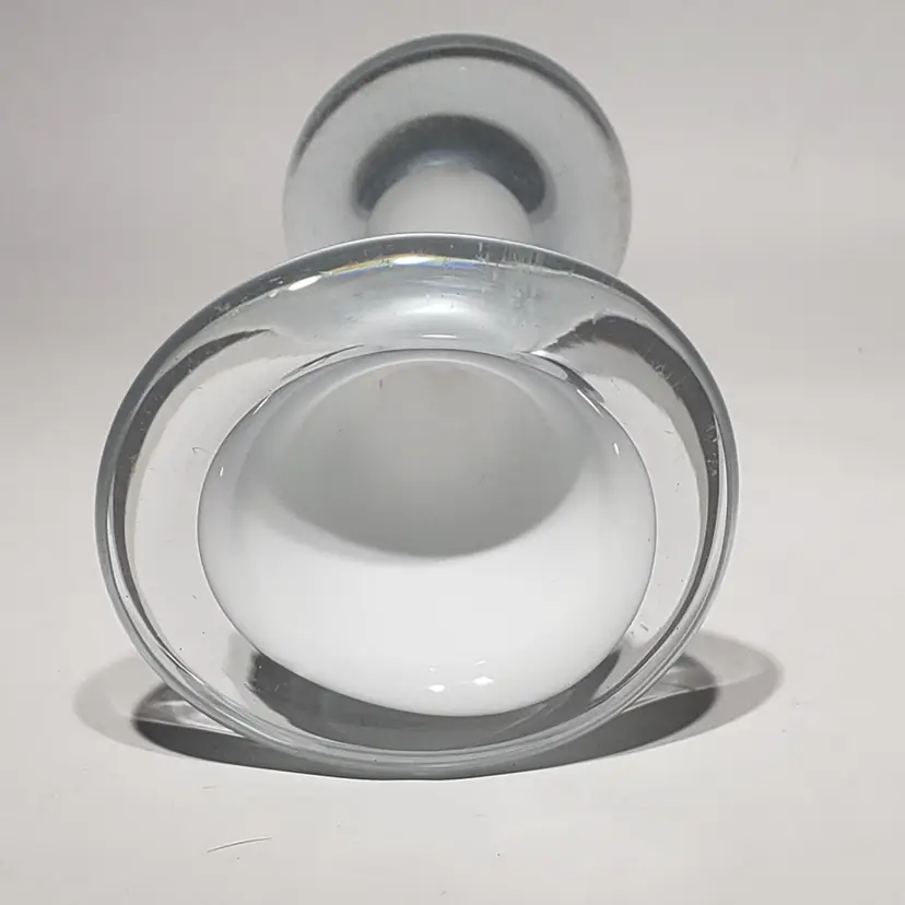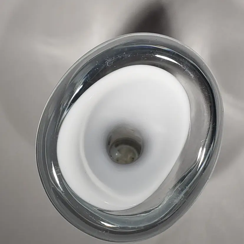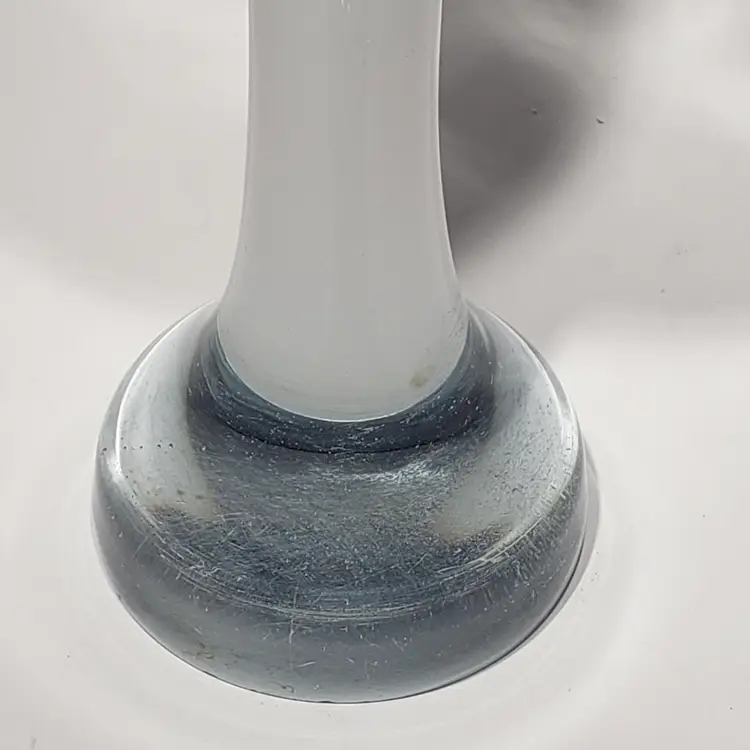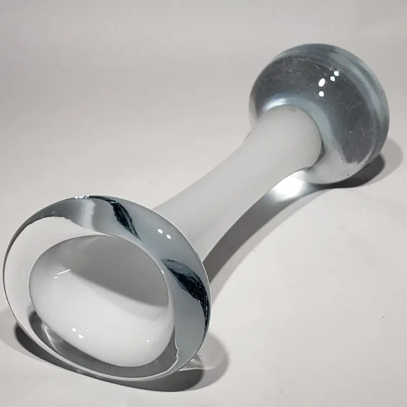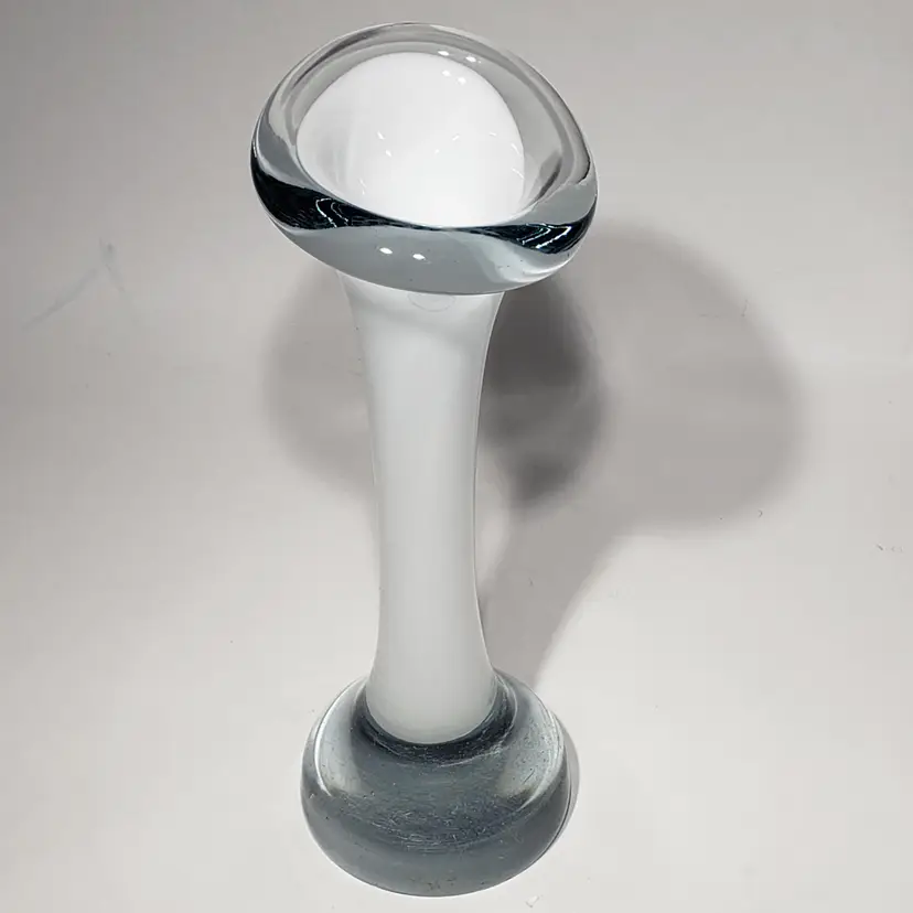 Hand Blown Cased White Clear Stretch Swung Glass Art 8" Bud Vase Measures: 3" x 2.25" x 8" Pre-owned. No cracks. Flea bites and small chip on base edge. See Photos.