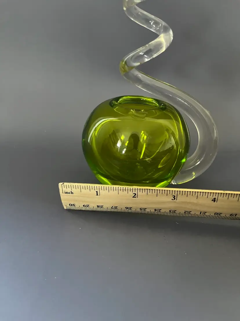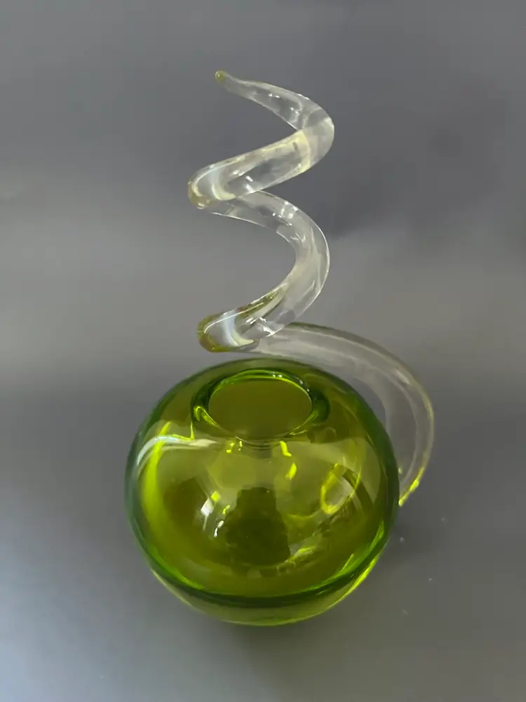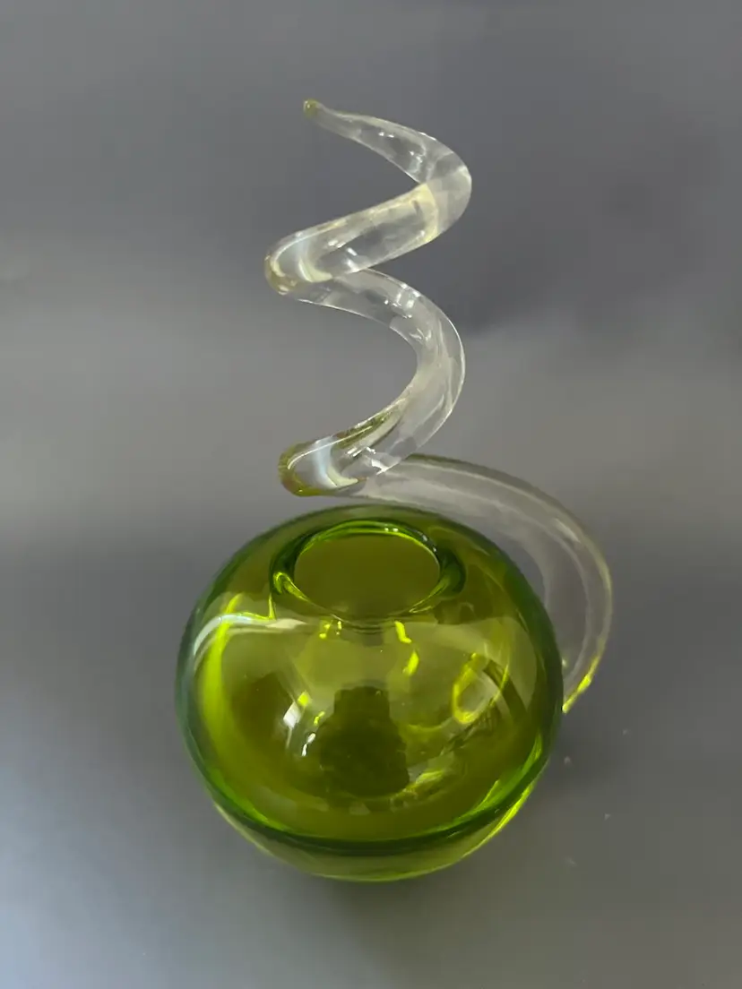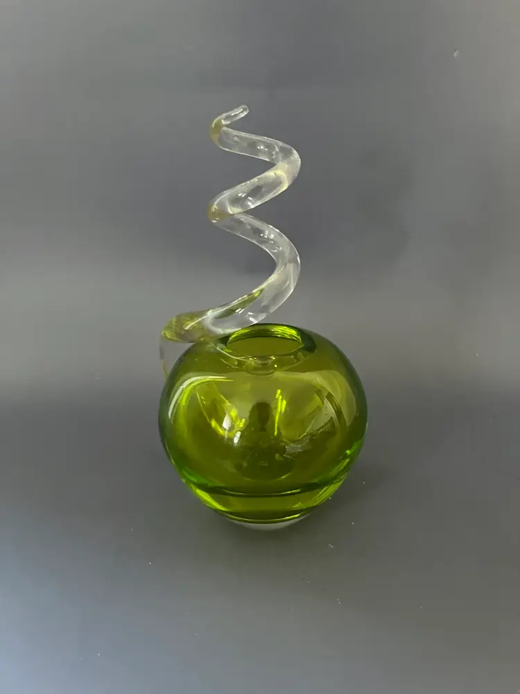 This circular apple-form green vase with a swirling clear glass spire above, is signed by the artist.This delicate and unique piece is crafted using a traditional production technique of hand-blown glass, making it a one-of-a-kind decorative item for any space. The signature adds a personal touch to the overall aesthetic, enhancing its appeal as a stylish and artistic addition to any collection of pottery and glassware.