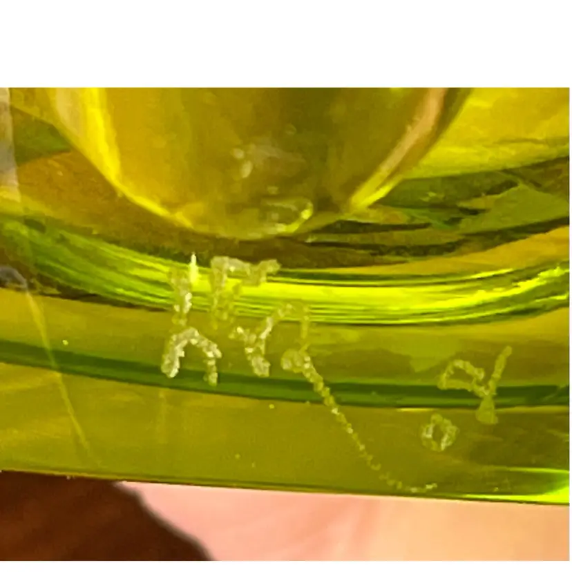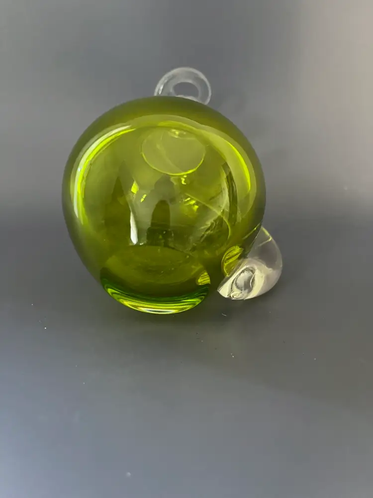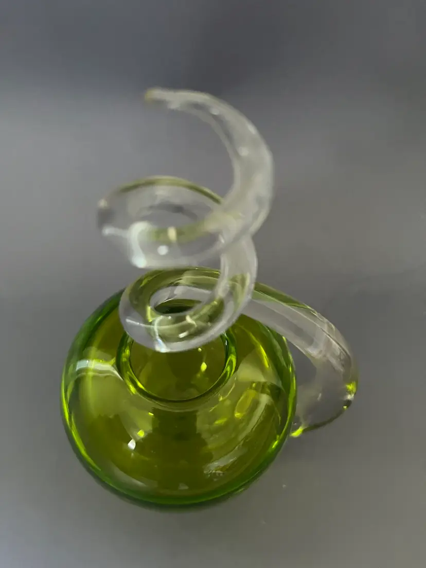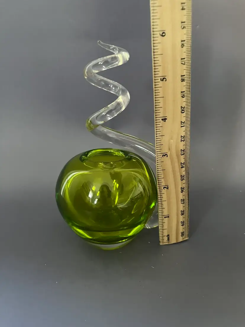 This circular apple-form green vase with a swirling clear glass spire above, is signed by the artist.This delicate and unique piece is crafted using a traditional production technique of hand-blown glass, making it a one-of-a-kind decorative item for any space. The signature adds a personal touch to the overall aesthetic, enhancing its appeal as a stylish and artistic addition to any collection of pottery and glassware.