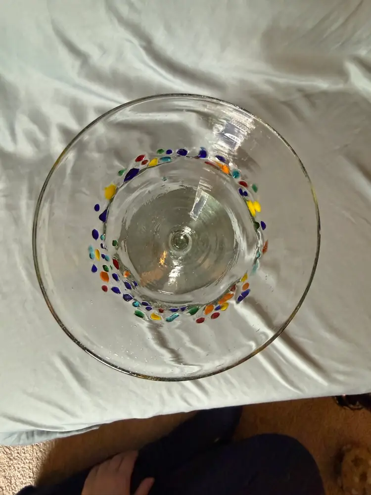 Hand blown Mexican glass colorful tutti-frutti/confetti glass. Thick glass with recycled glass “confetti”. 7.25”H x 5.5” W No chips or cracks