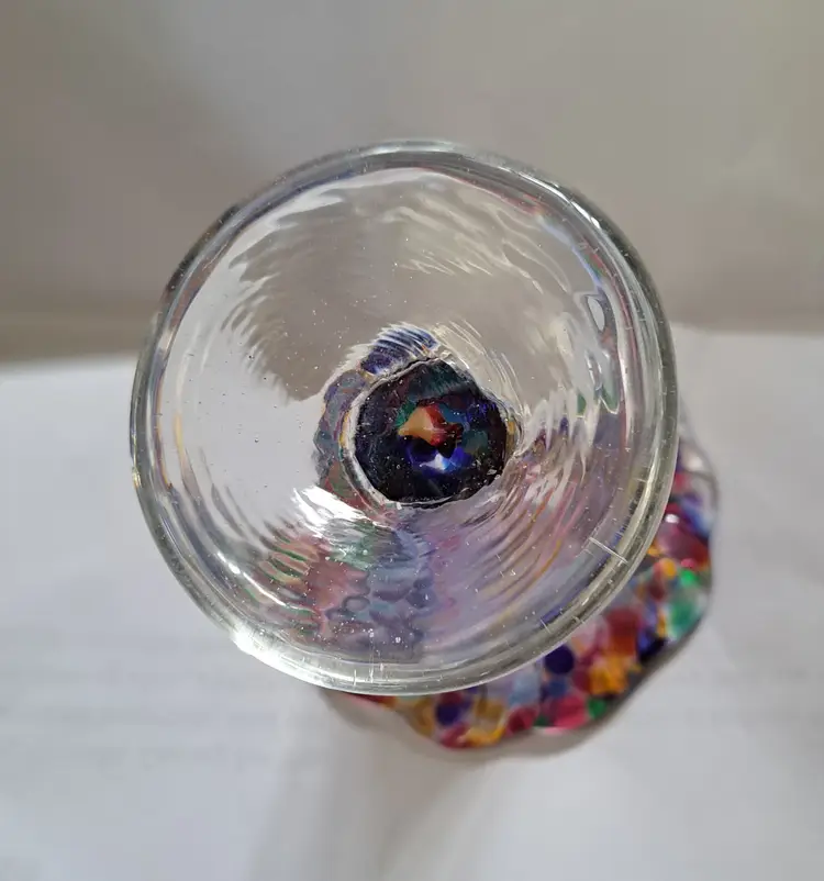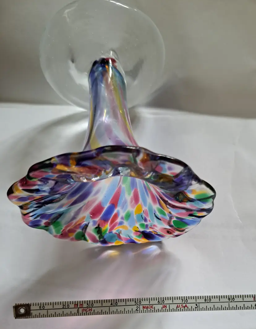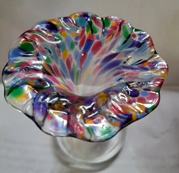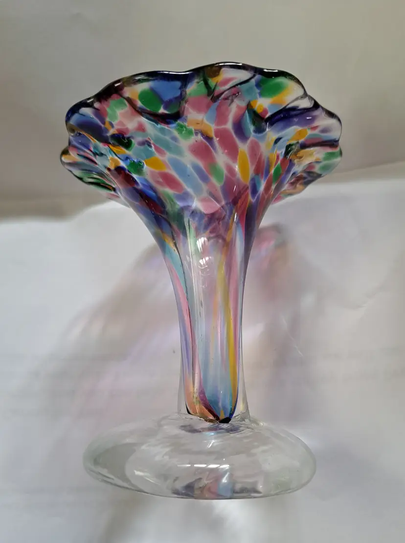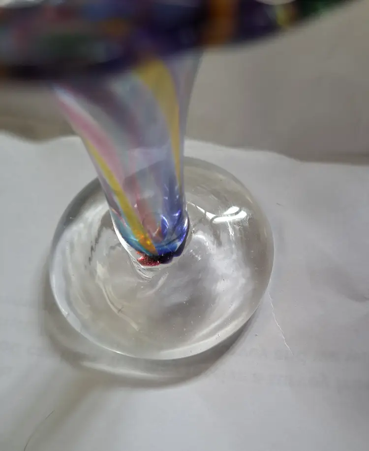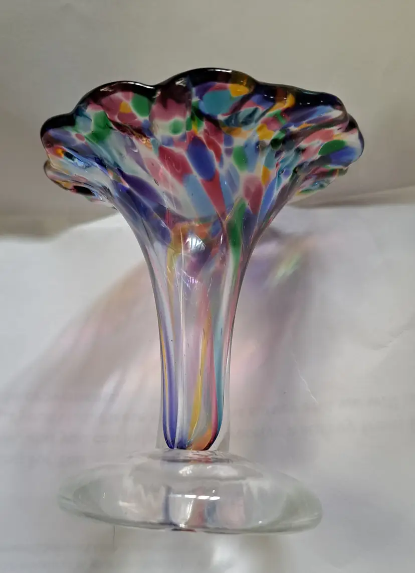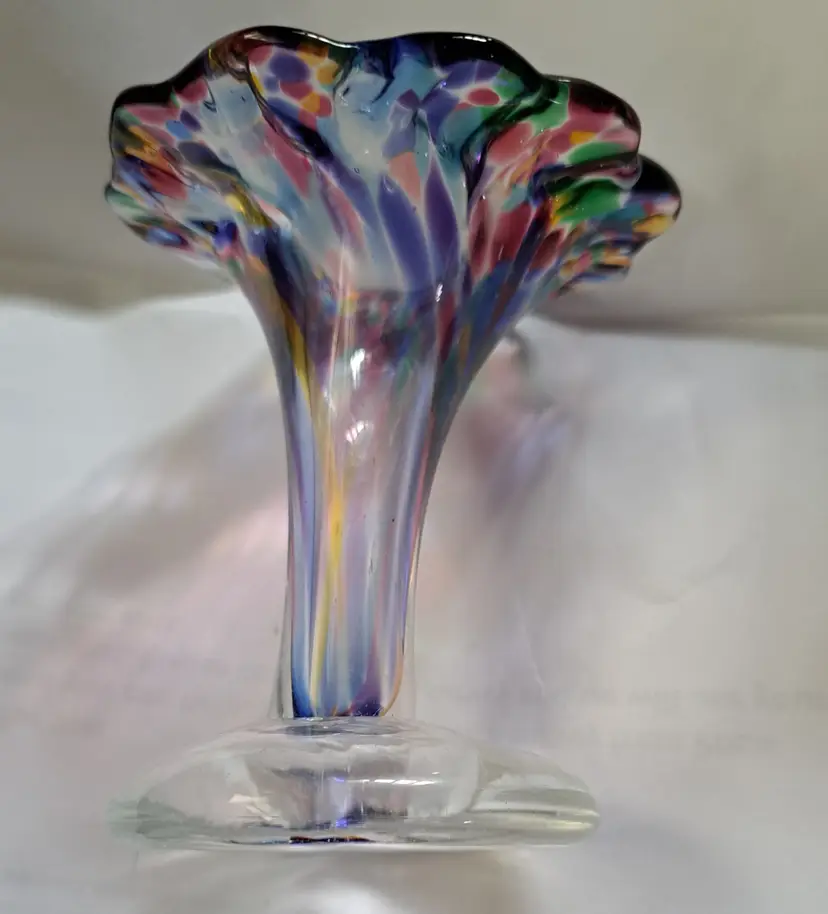 Up for sale we have this hand-blown glass bud vase in vibrant, beautiful colors. I believe this was made by Chris A Smith but is not signed. This vase is from my personal collection and in excellent condition. There are no makers marks on this vase. This bud vase measures 3-3/4 inches tall. Indeed a lovely addition to you home decor. Thank you for looking!