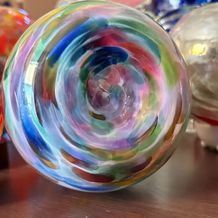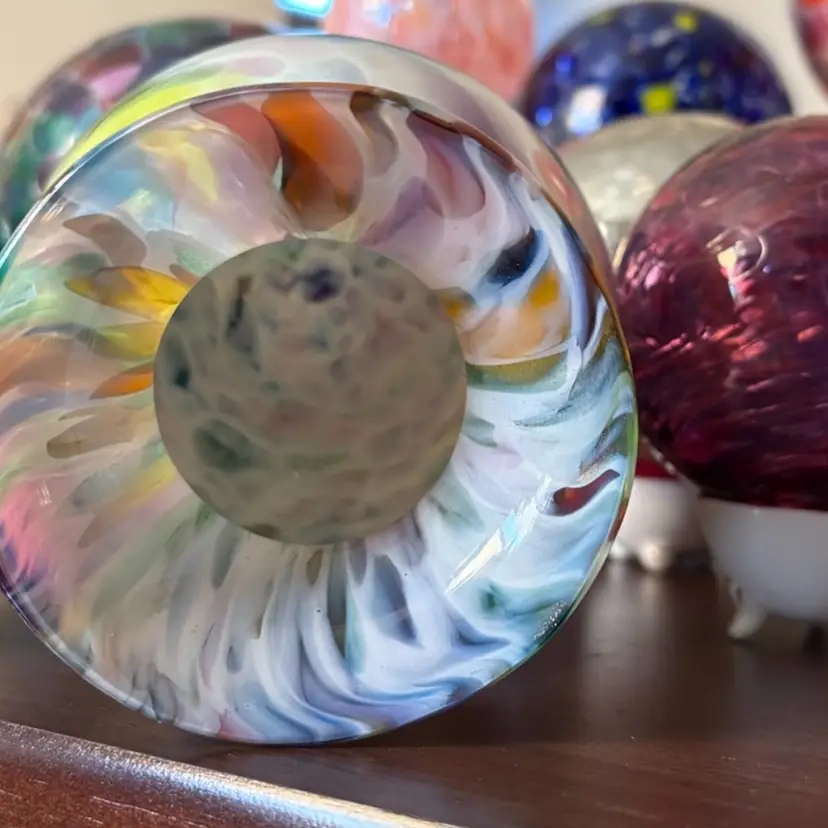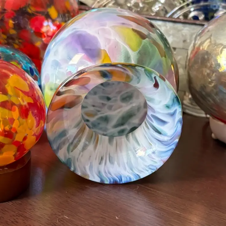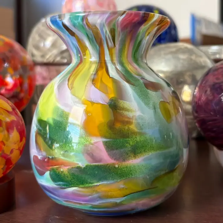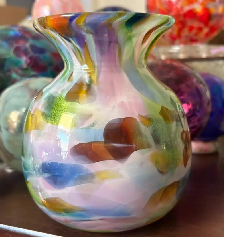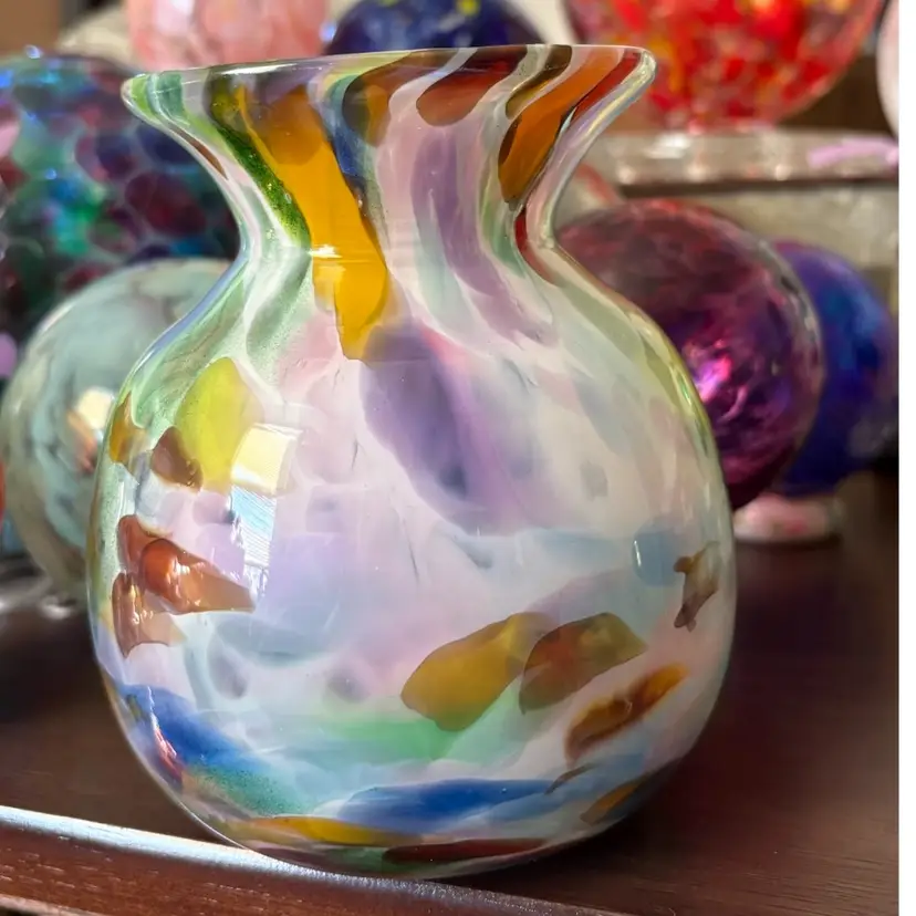 Hand Blown Colorful Art Glass Vase Very pretty with lots of colors Mostly white on inside, pontel is not ground and I do not think this has a lot of age but it is a very nice piece of glass 5 x 3.5