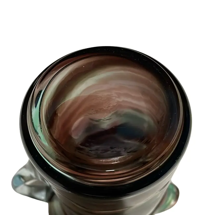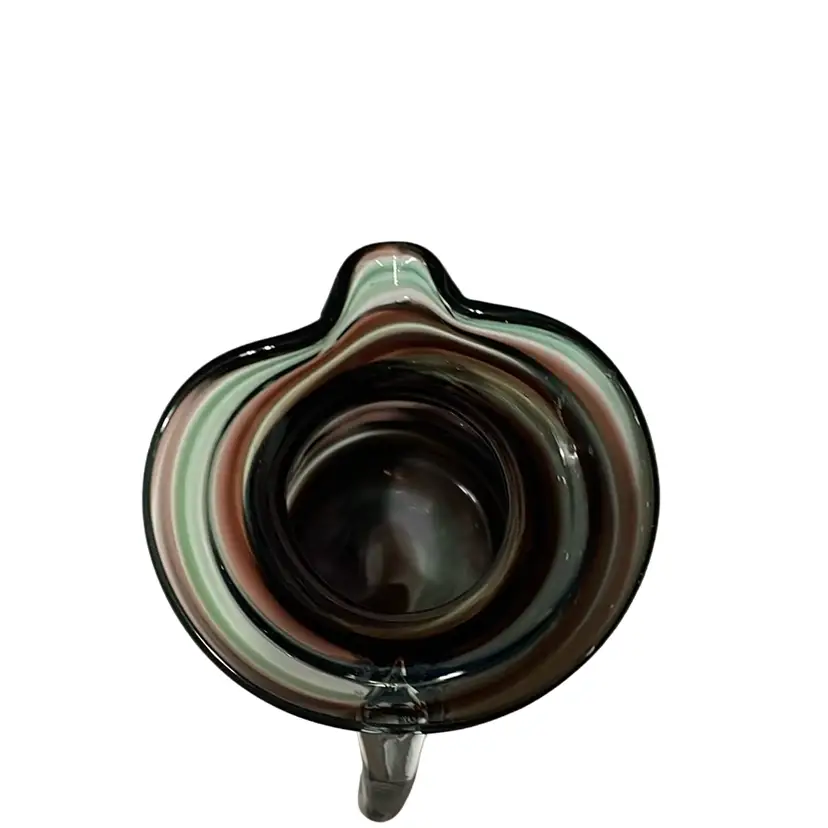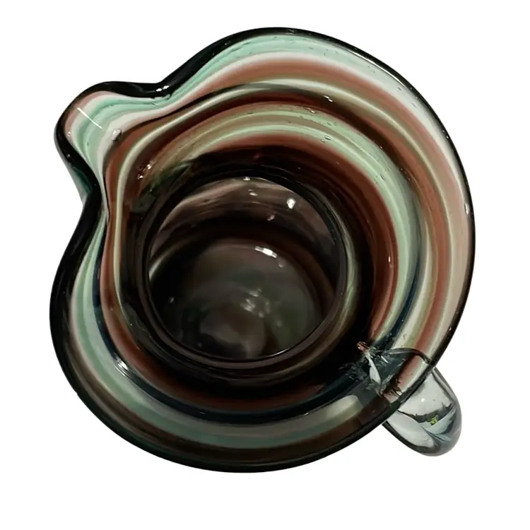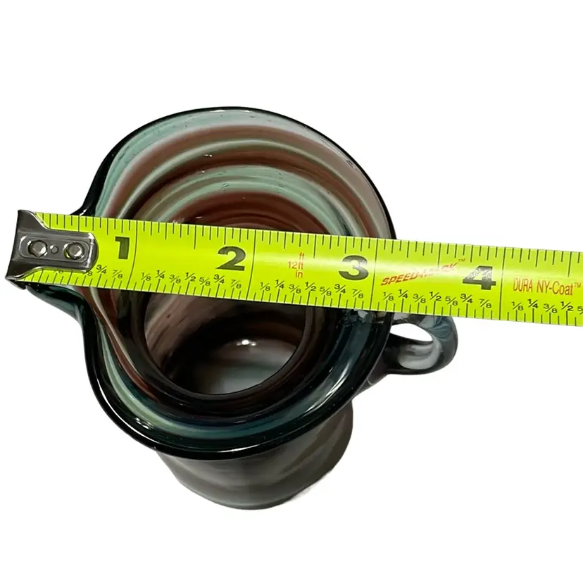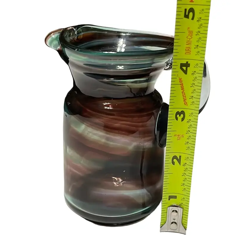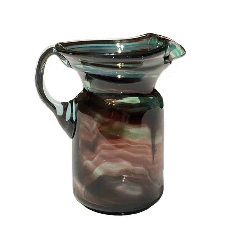 This item is a small, twist hand blown pitcher or creamer. It is clear glass in aqua/turquoise and amethyst/purple. There are no chips or cracks. It stands 4 3/8 inches tall.