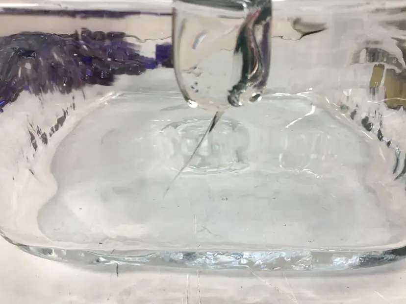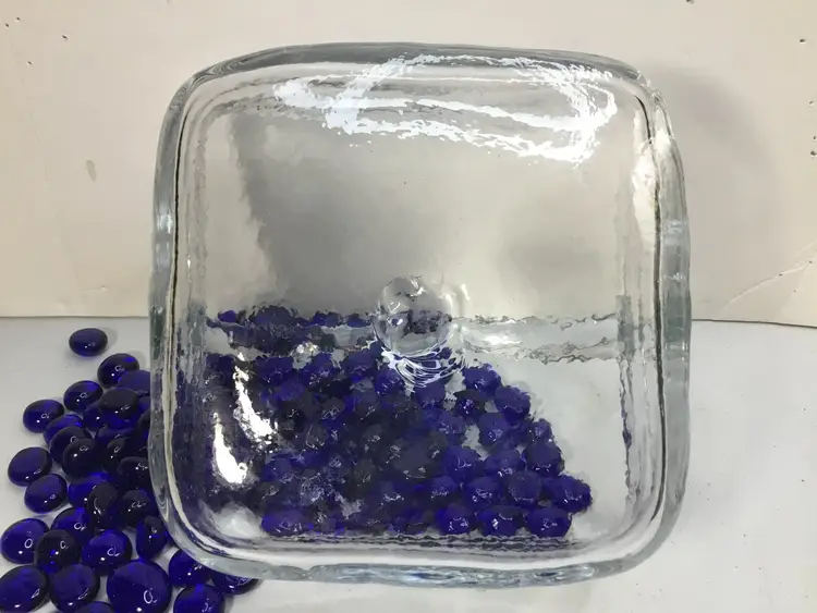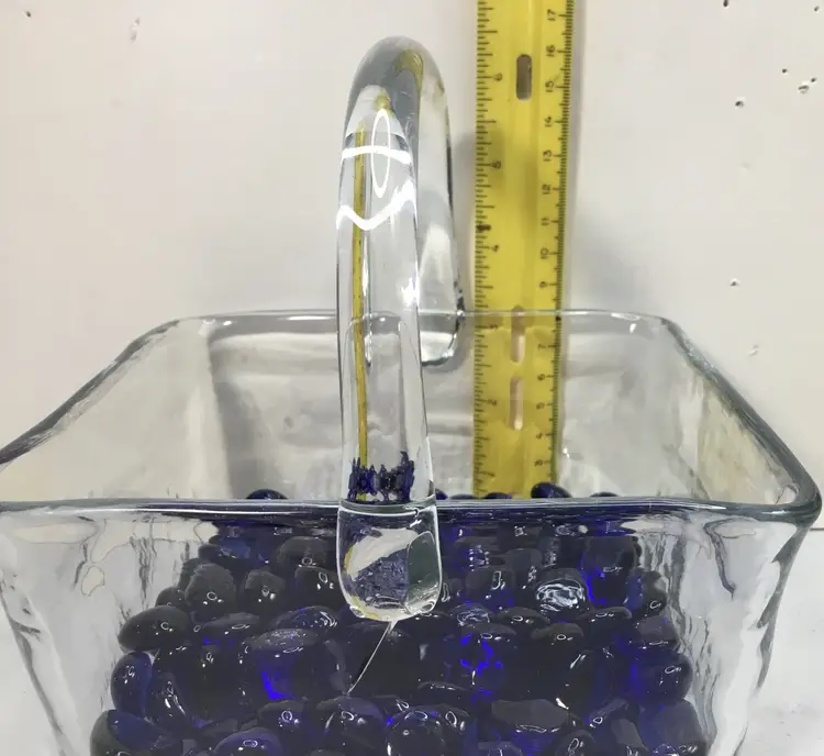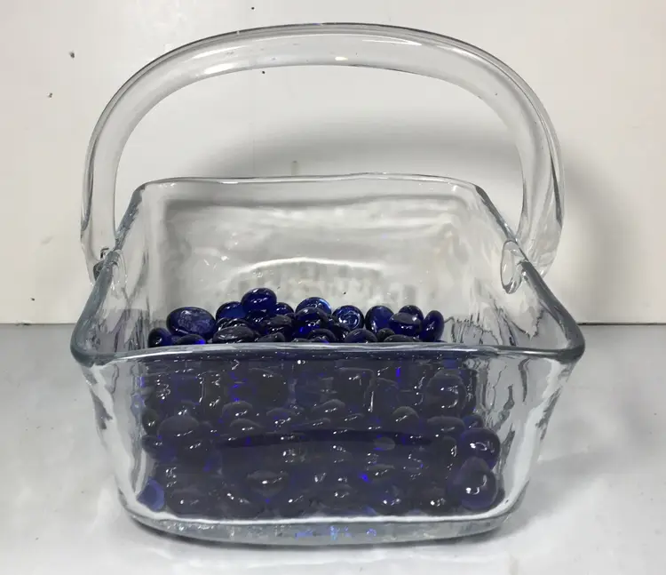 6 inches square by 3 inches high, with 3 more inches height in handle, clear glass basket, hand blown. Includes 14 oz of cobalt blue glass nuggets.