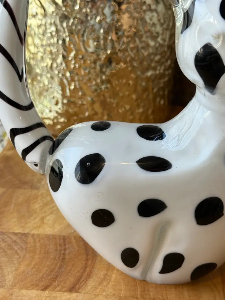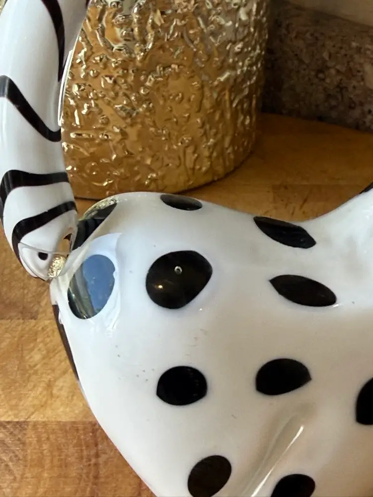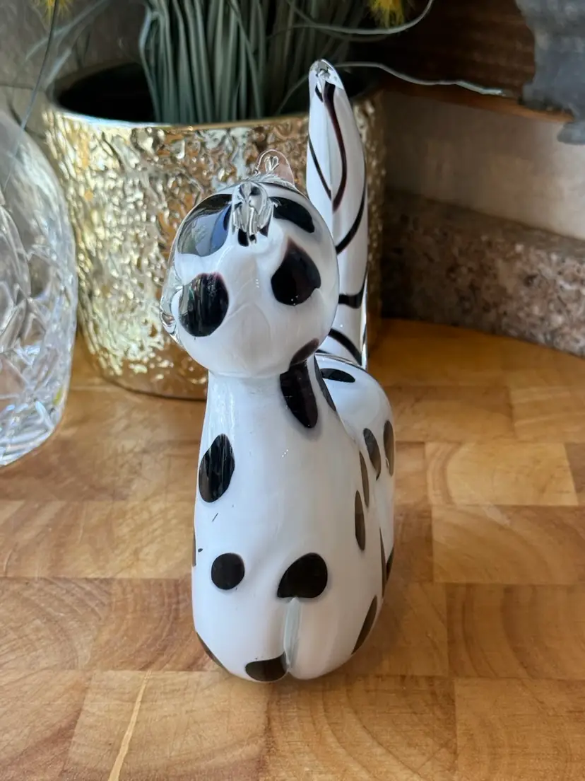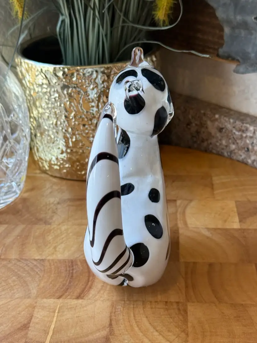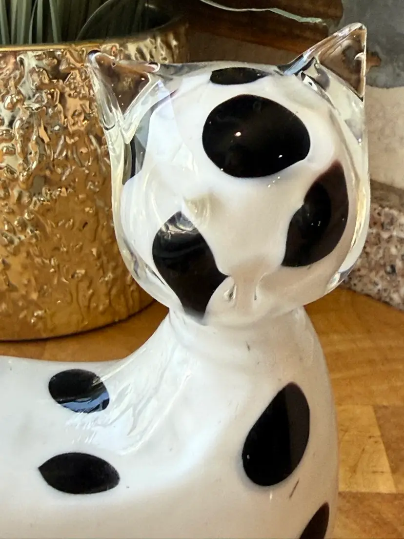 Hand blown art glass cat figurine featuring a white milk glass body with black spotted detailing and clear glass accents on the ears and tail. • Approx size: 6.5” • Condition: Excellent vintage condition • No chips, cracks, or repairs