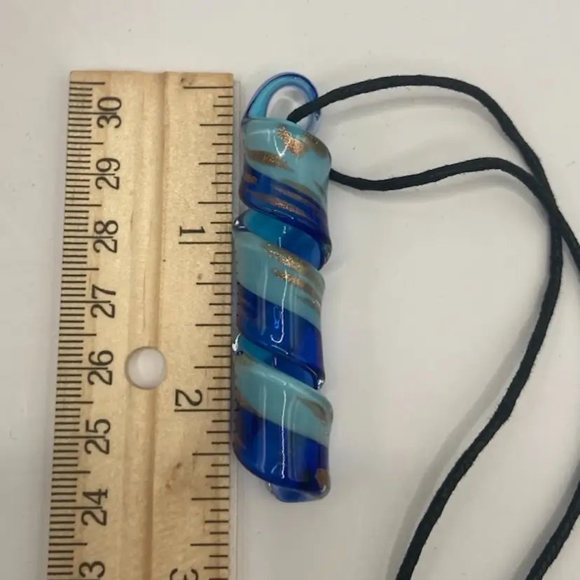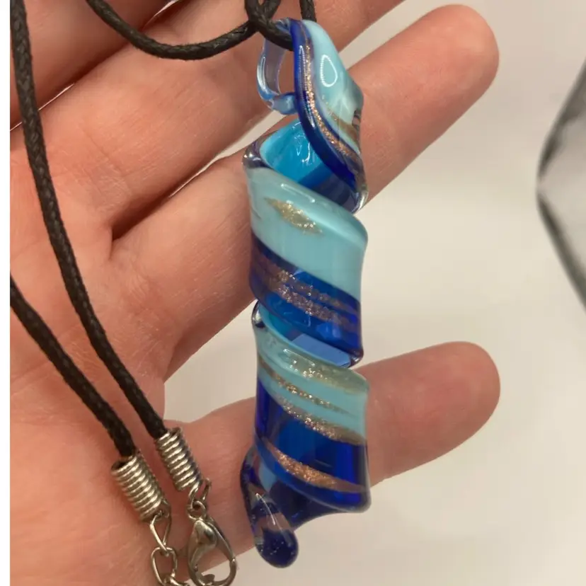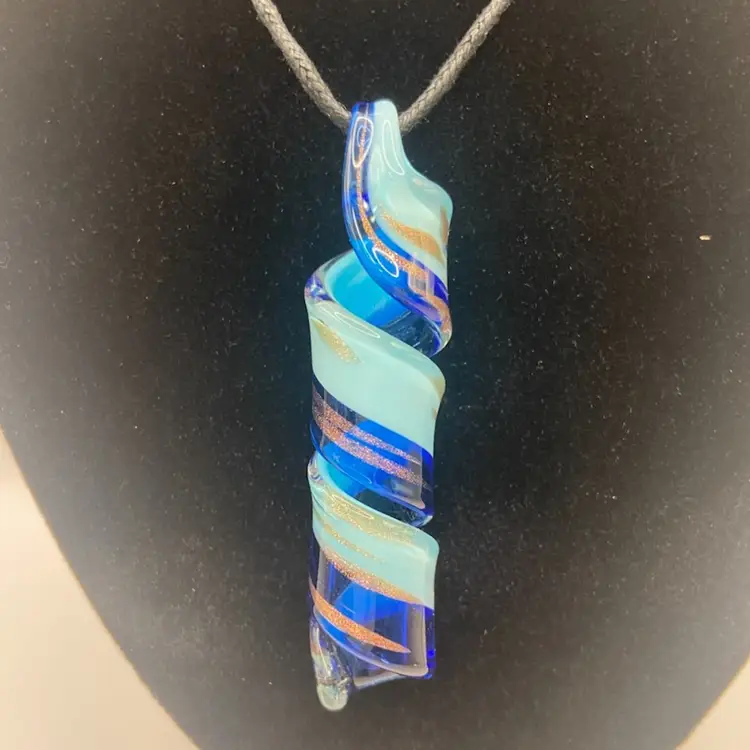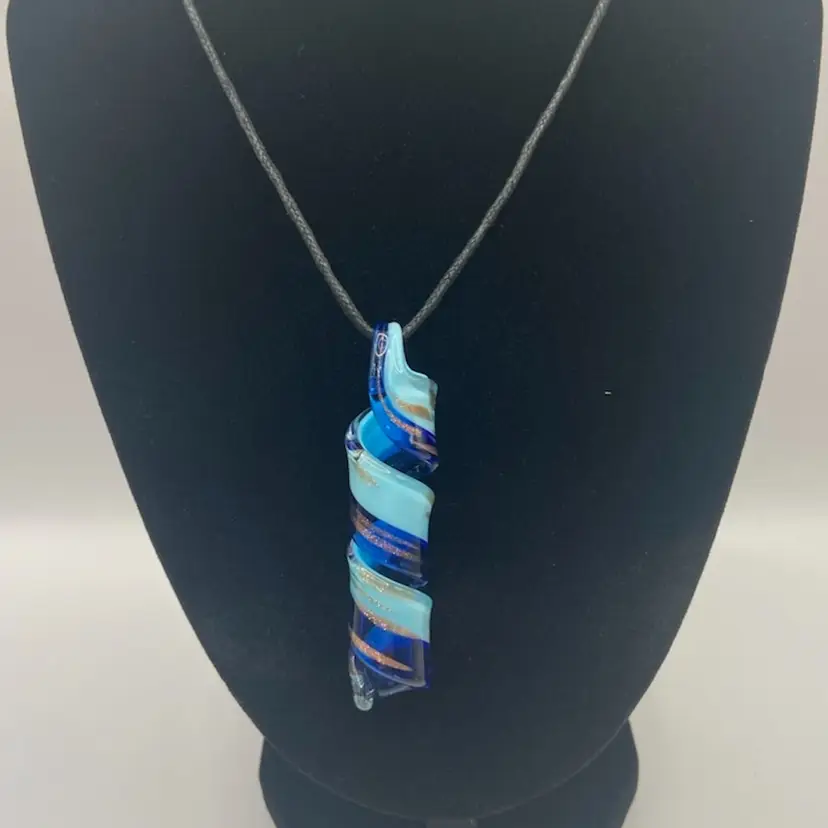 This beautiful glass pendant has hues of blue, copper, and gold running throughout. It is 2 1/2” long and is attached to a corded necklace. It is very pretty with no damage noted.