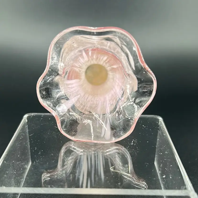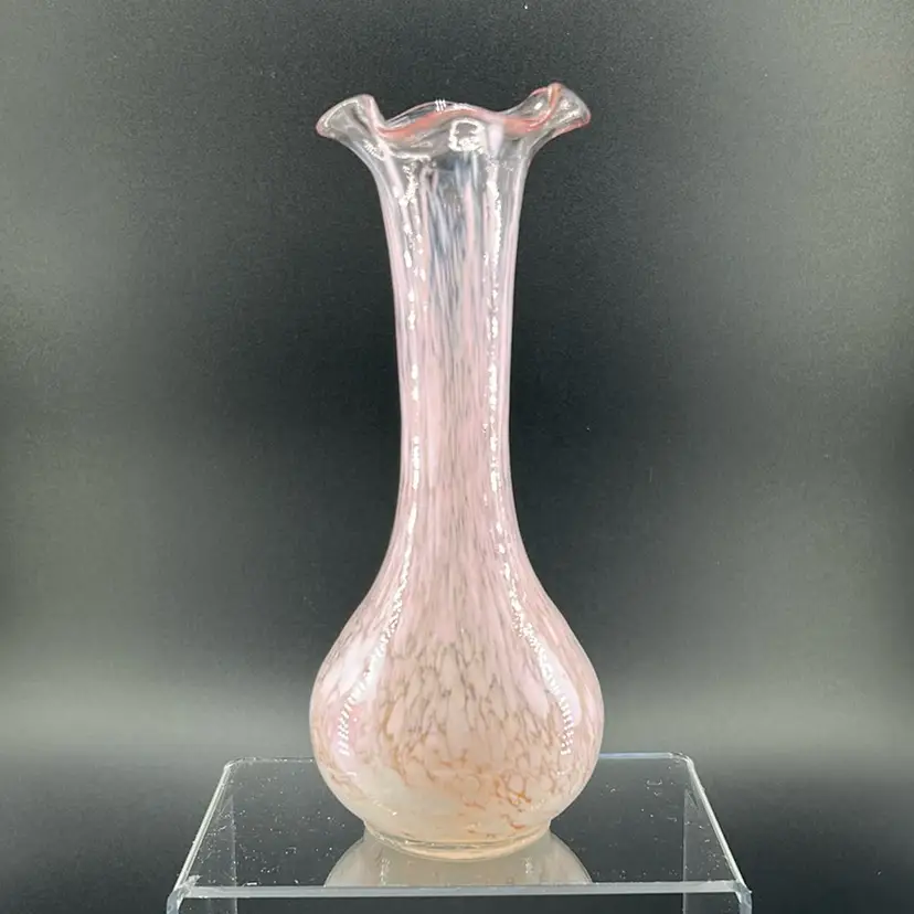This is a pink and white ruffle vase made from hand blown glass. It stands 6 inches tall and 2 inches across.