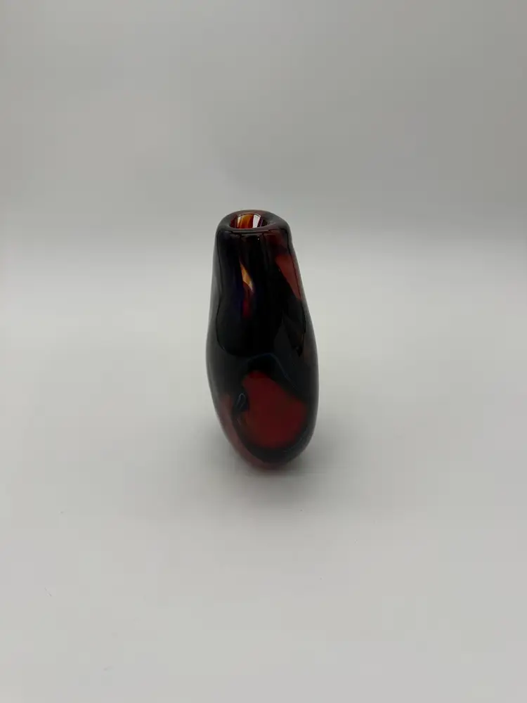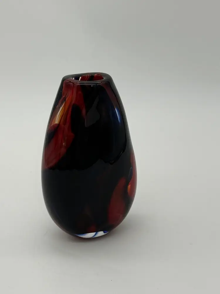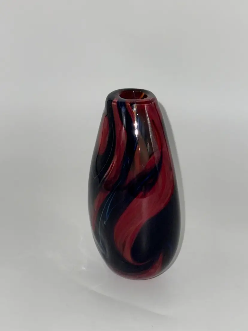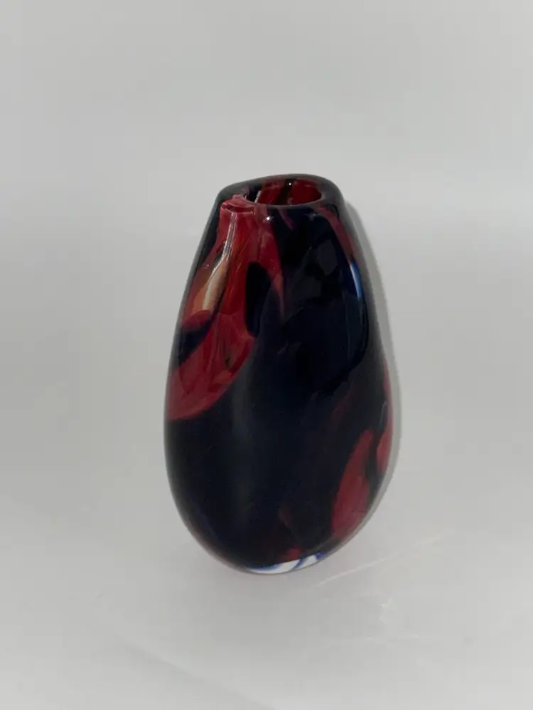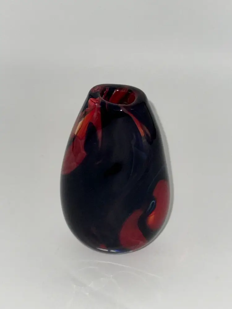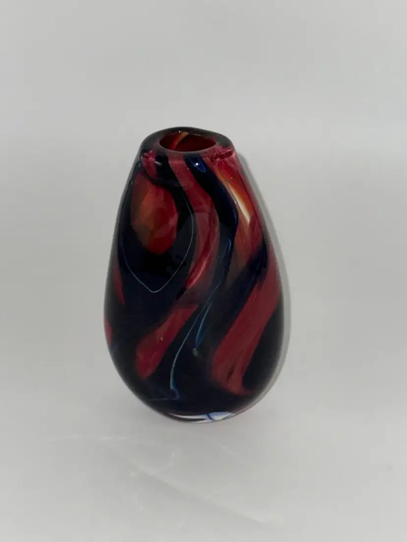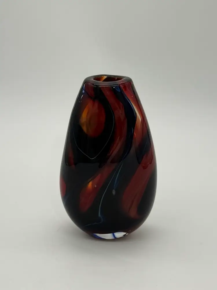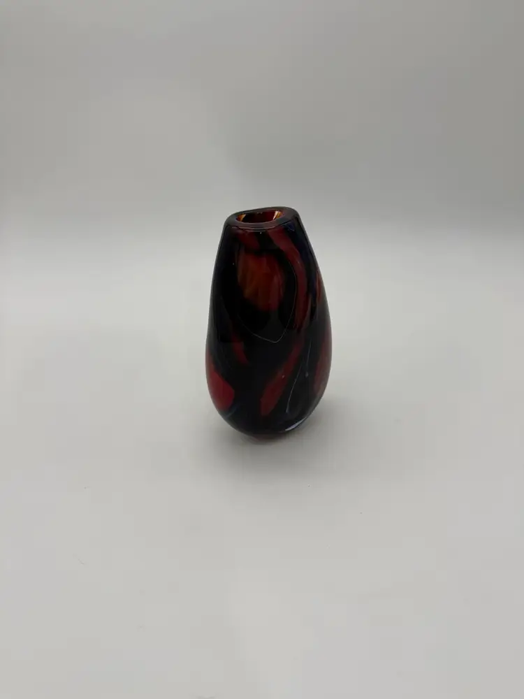 This hand-blown glass vase features a vibrant red, blue, violet, and black swirl pattern, making it a unique and eye-catching piece for any occasion. The ovoid shape and heavy design add an artistic touch to its abstract art style. Standing at 5.5" tall, 1-1/2” X 1-1/4” diameter, and 3.5" wide, this small vase is made of high-quality glass with a glossy finish, ensuring easy care and maintenance. Handmade with a hand-blown production technique, this original piece is sure to enhance any home decor with its colorful and translucent design that changes with the lighting.