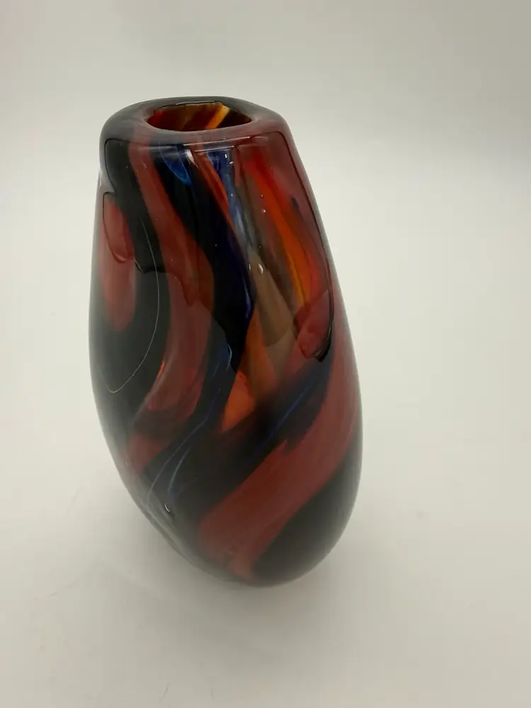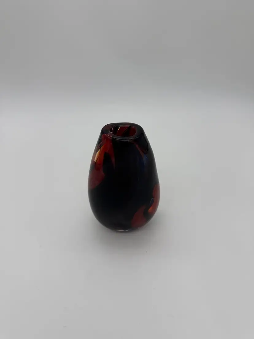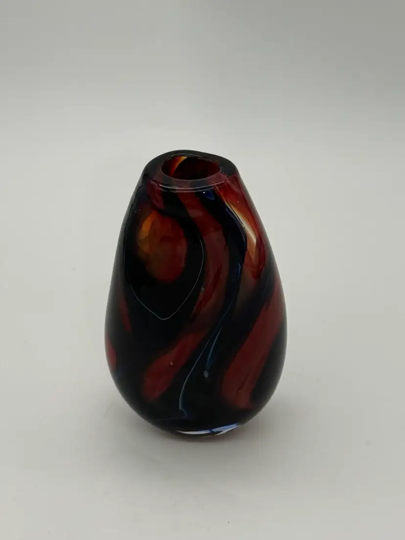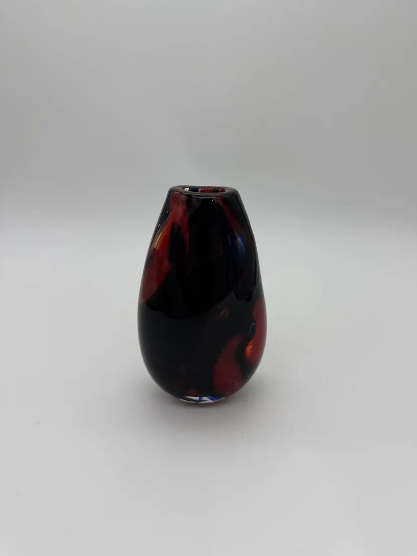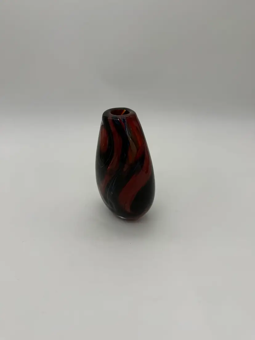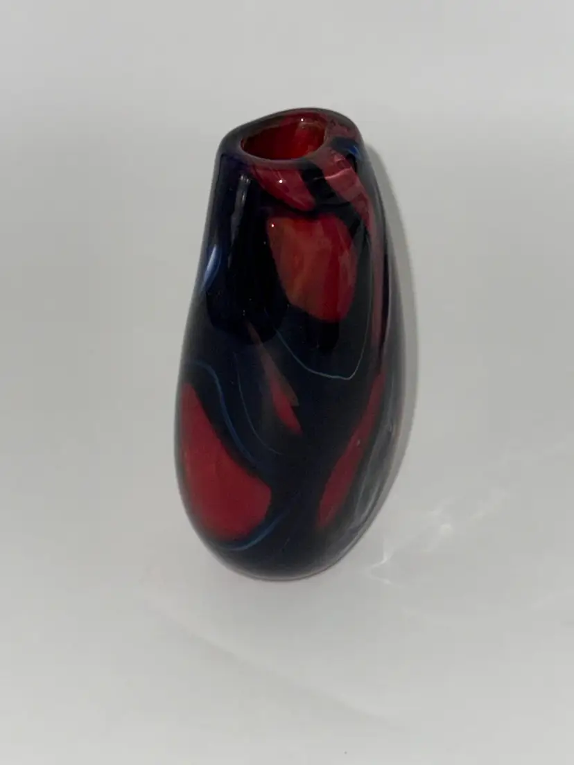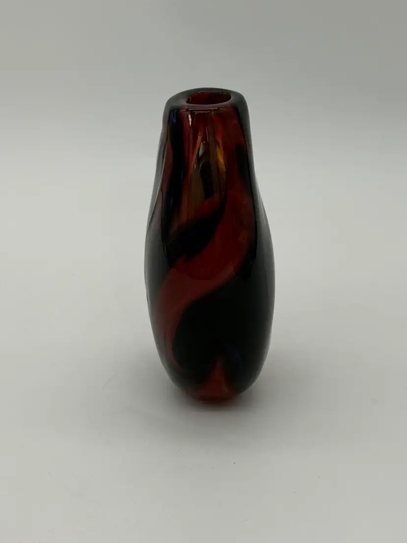 This hand-blown glass vase features a vibrant red, blue, violet, and black swirl pattern, making it a unique and eye-catching piece for any occasion. The ovoid shape and heavy design add an artistic touch to its abstract art style. Standing at 5.5" tall, 1-1/2” X 1-1/4” diameter, and 3.5" wide, this small vase is made of high-quality glass with a glossy finish, ensuring easy care and maintenance. Handmade with a hand-blown production technique, this original piece is sure to enhance any home decor with its colorful and translucent design that changes with the lighting.