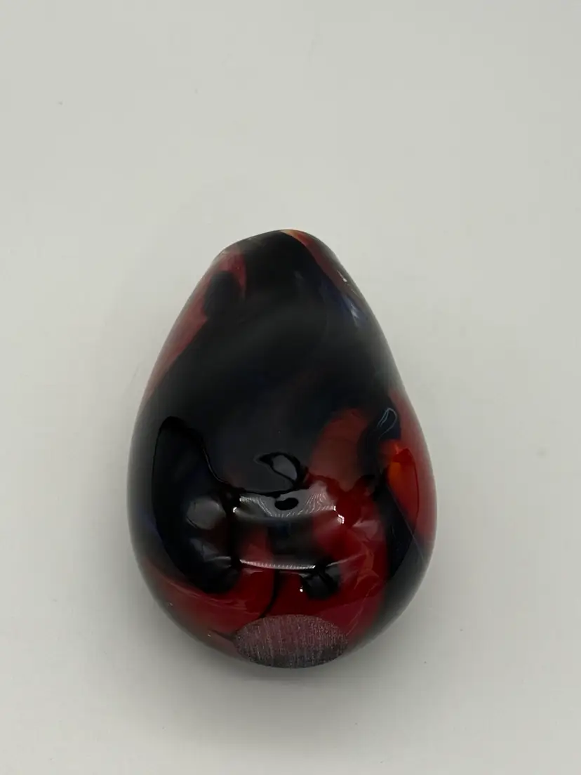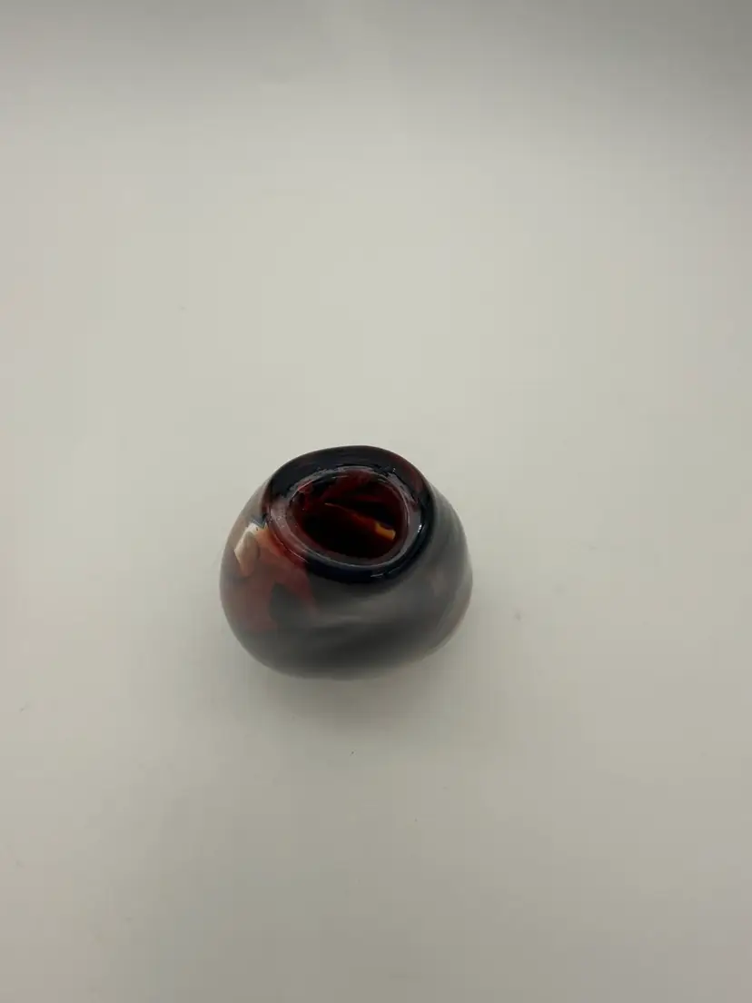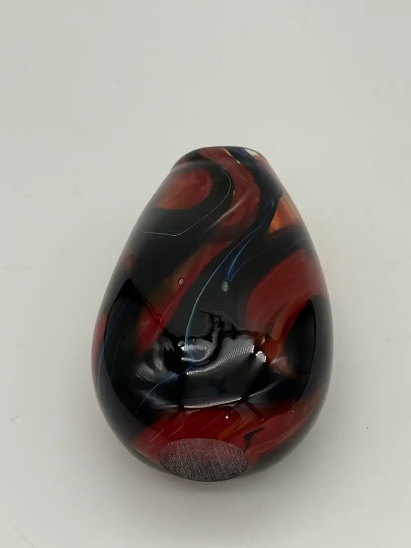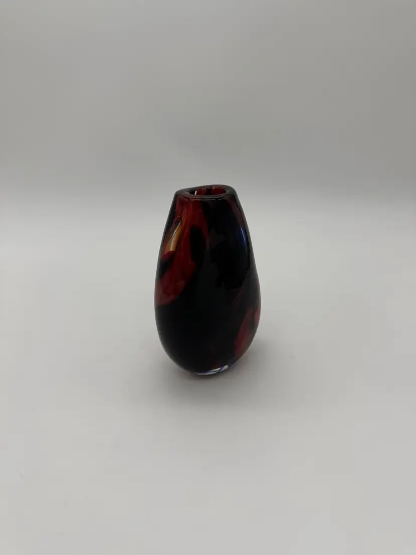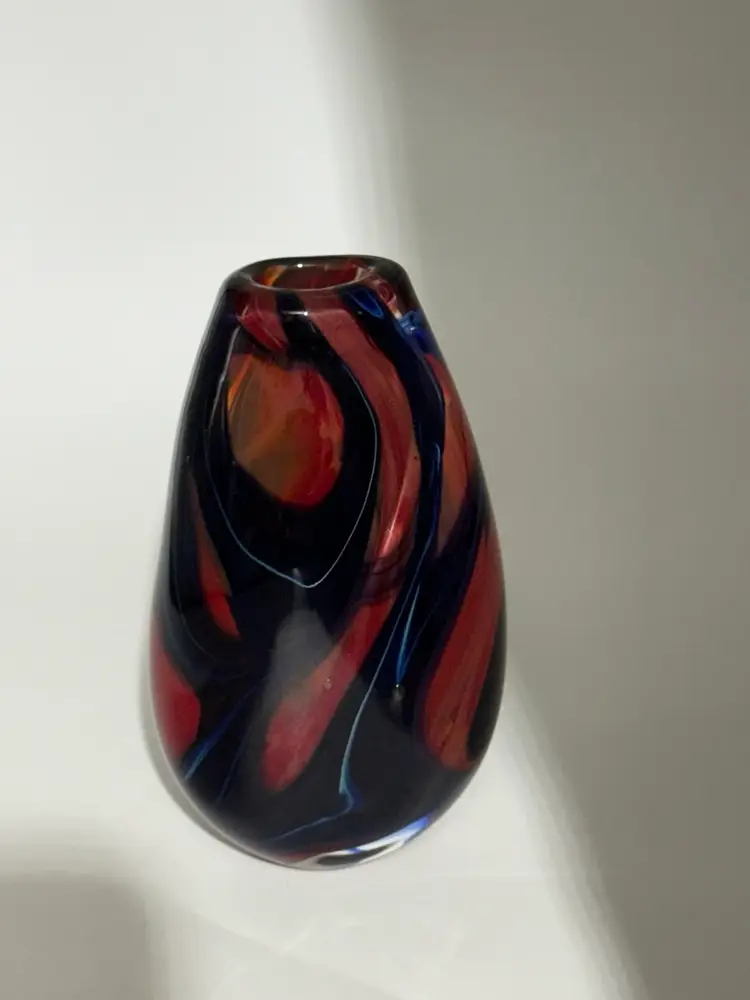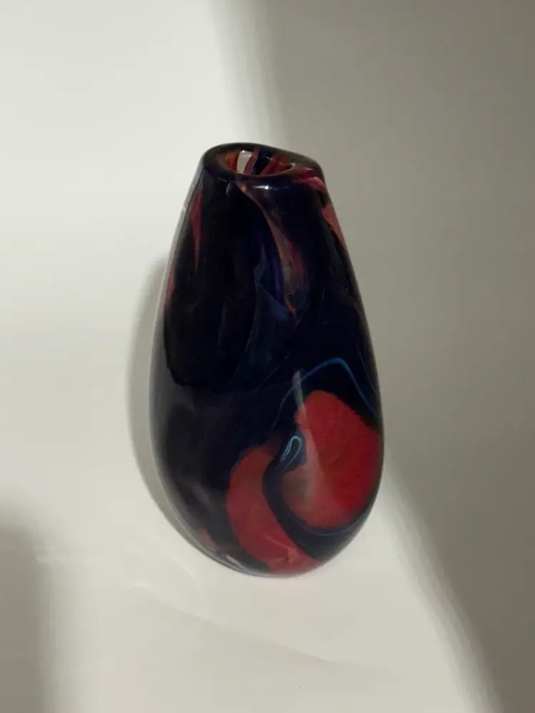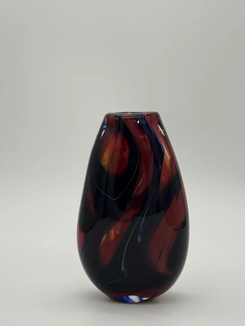 This hand-blown glass vase features a vibrant red, blue, violet, and black swirl pattern, making it a unique and eye-catching piece for any occasion. The ovoid shape and heavy design add an artistic touch to its abstract art style. Standing at 5.5" tall, 1-1/2” X 1-1/4” diameter, and 3.5" wide, this small vase is made of high-quality glass with a glossy finish, ensuring easy care and maintenance. Handmade with a hand-blown production technique, this original piece is sure to enhance any home decor with its colorful and translucent design that changes with the lighting.