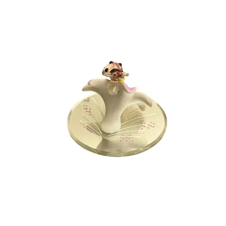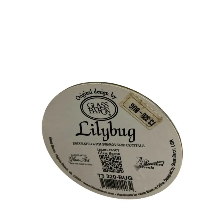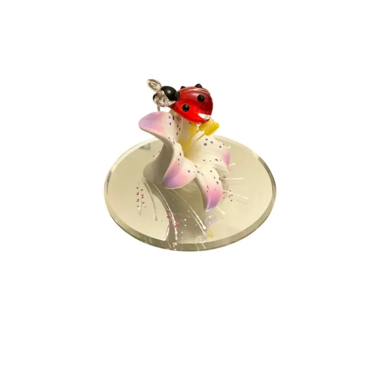 Glass Baron ladybug on lily attached to mirror. Just the right size for a trinket shelf or place in a planter for decor. Hand blown item. Original sticker on bottom.