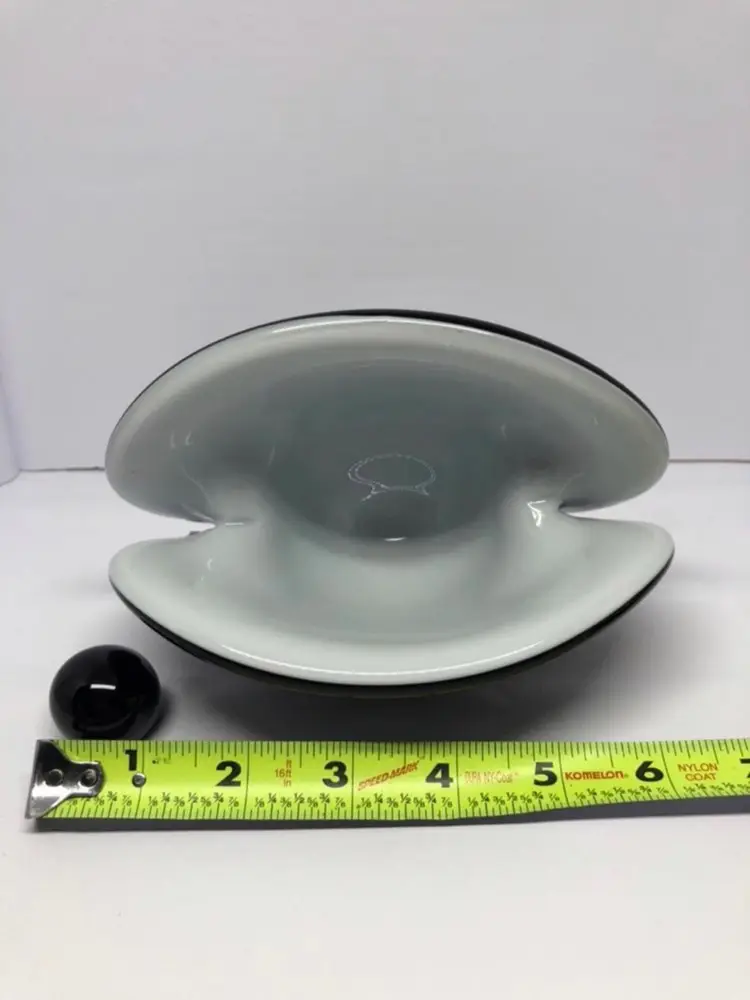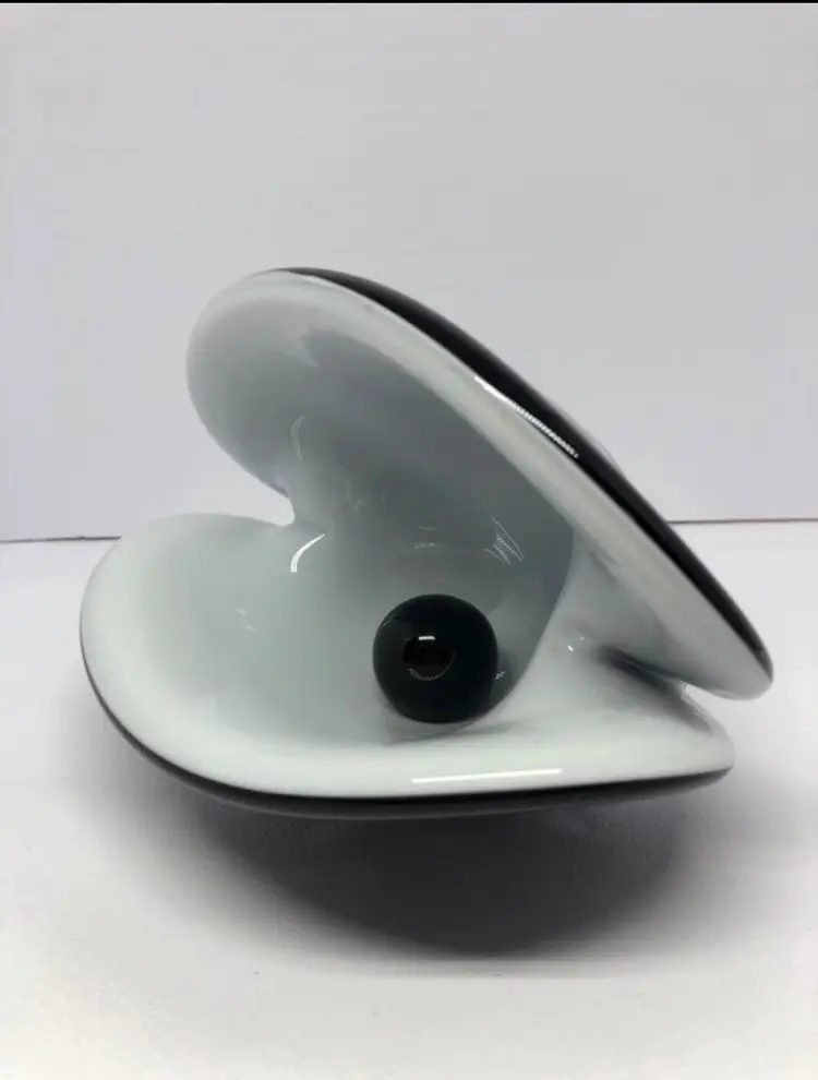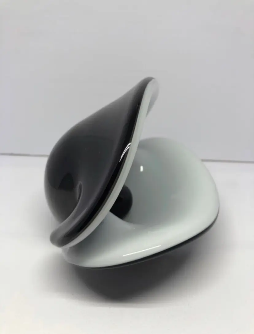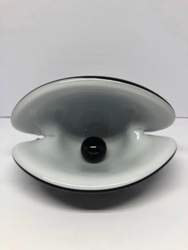 Absolutely stunning No cracks or chips Can be sat two ways. It has two flat spots I’m unsure if this is made by AVEM or Alfredo Barbini Beautiful black and white Comes with a black glass Pearl Great for glass collectors, Murano collectors, a sea themed home, and many many more