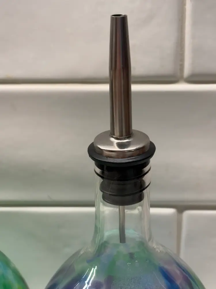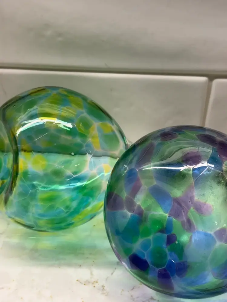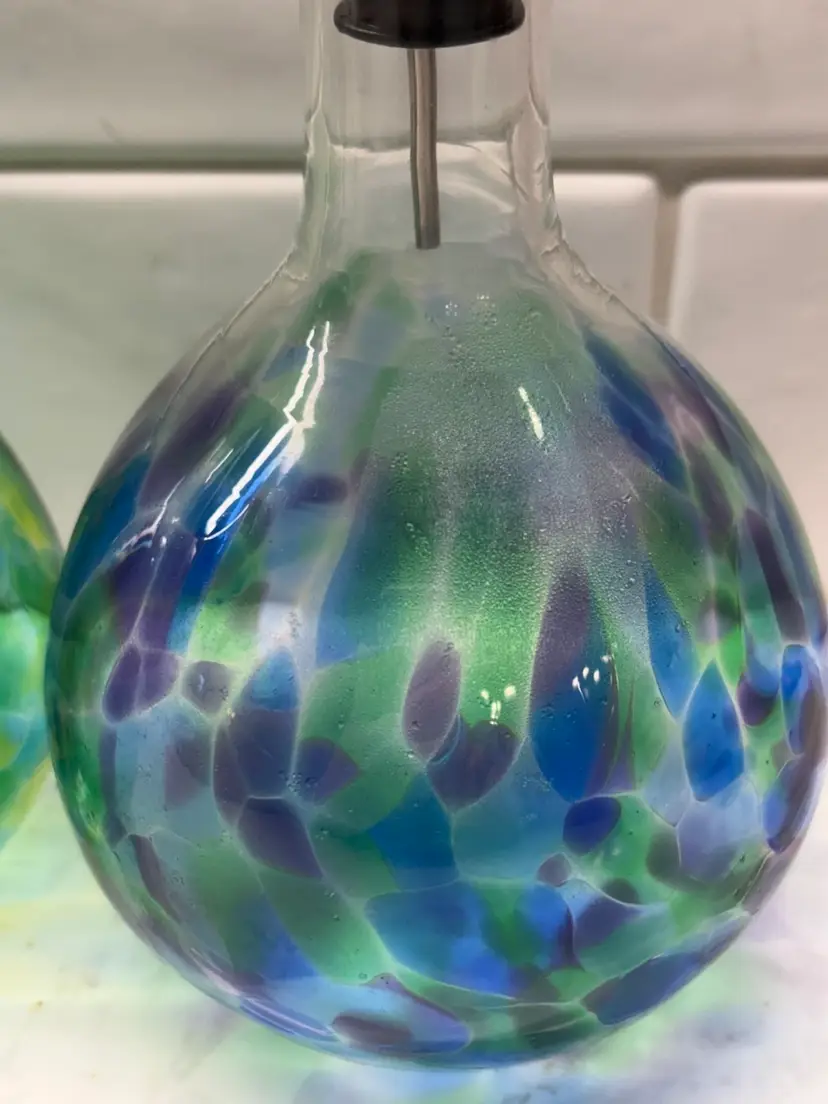 This hand-blown oil and vinegar cruet set is a unique and stylish addition to any dining table. The set features a vibrant blue and green color palette, adding a pop of color to your kitchen decor. Made of glass and produced with an art glass style, this cruet set is sure to catch the eye and enhance the aesthetic of your dining experience. The unmarked brand adds a touch of mystery and craftsmanship to this functional and decorative piece.