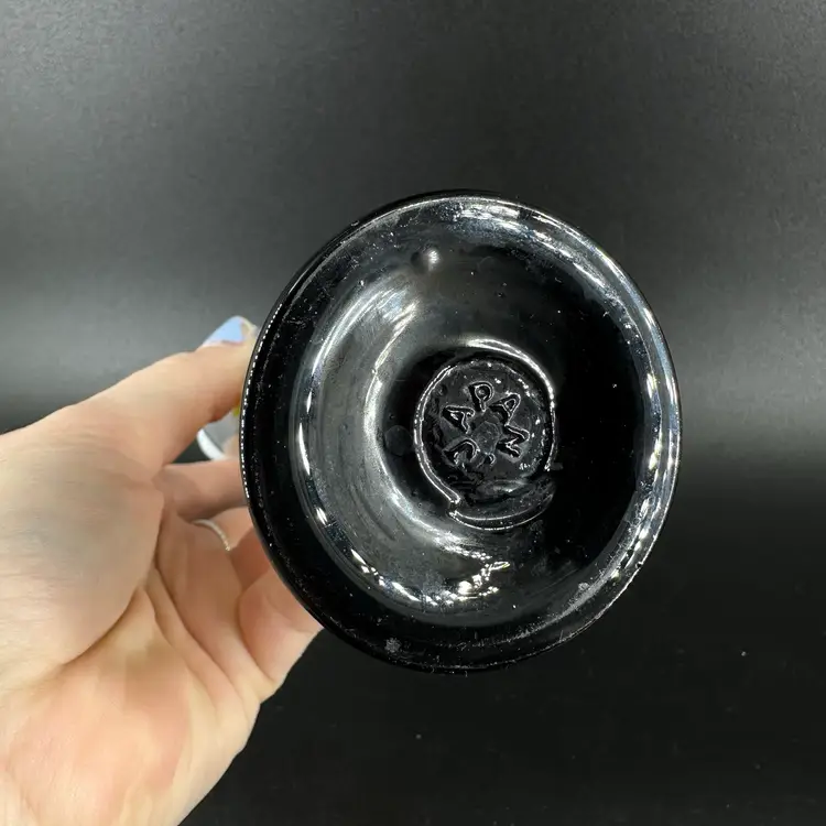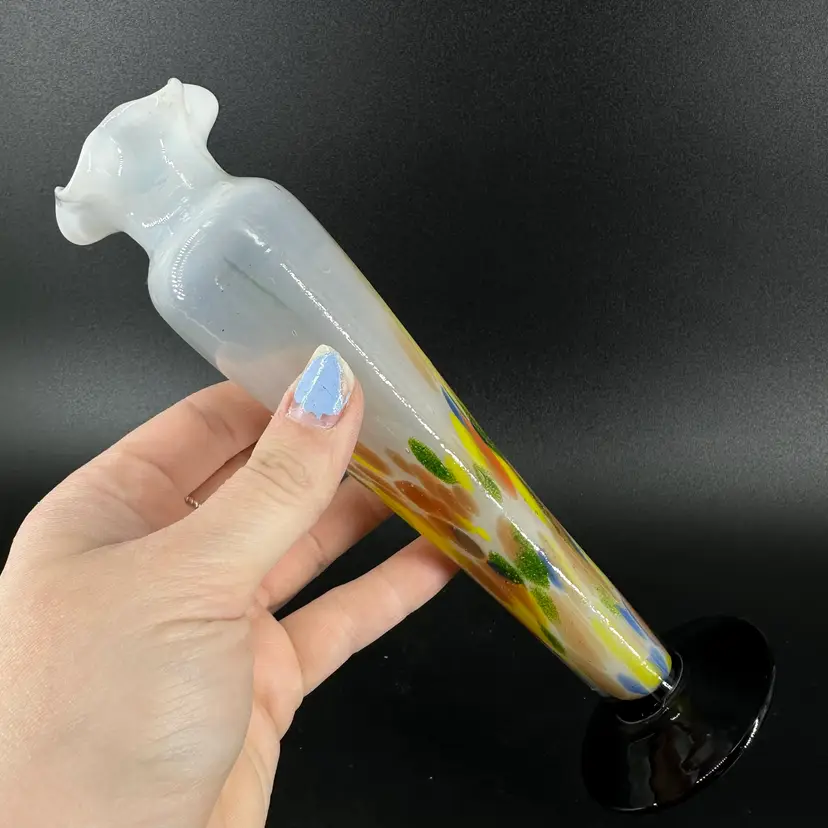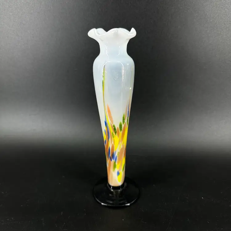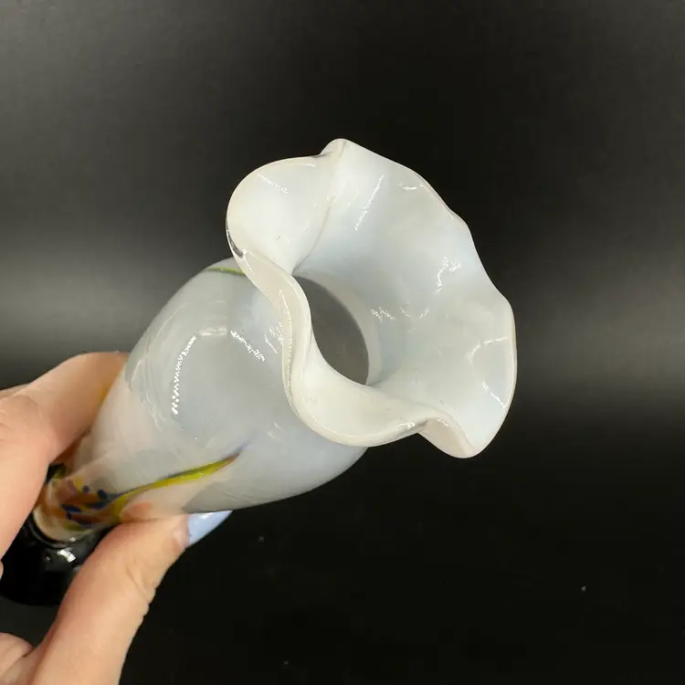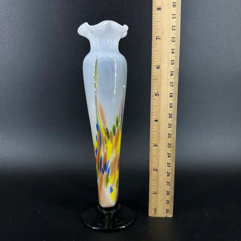 Hand blown art glass small vase featuring an opalescent glass among colorful designs and a black glass bottom. No chips or cracks. Some scratching on bottom. Marked “JAPAN” on bottom. Measured approximately 7.5” tall.