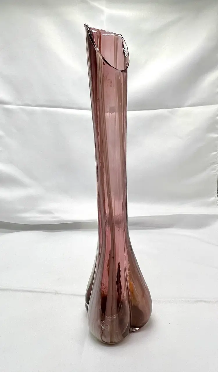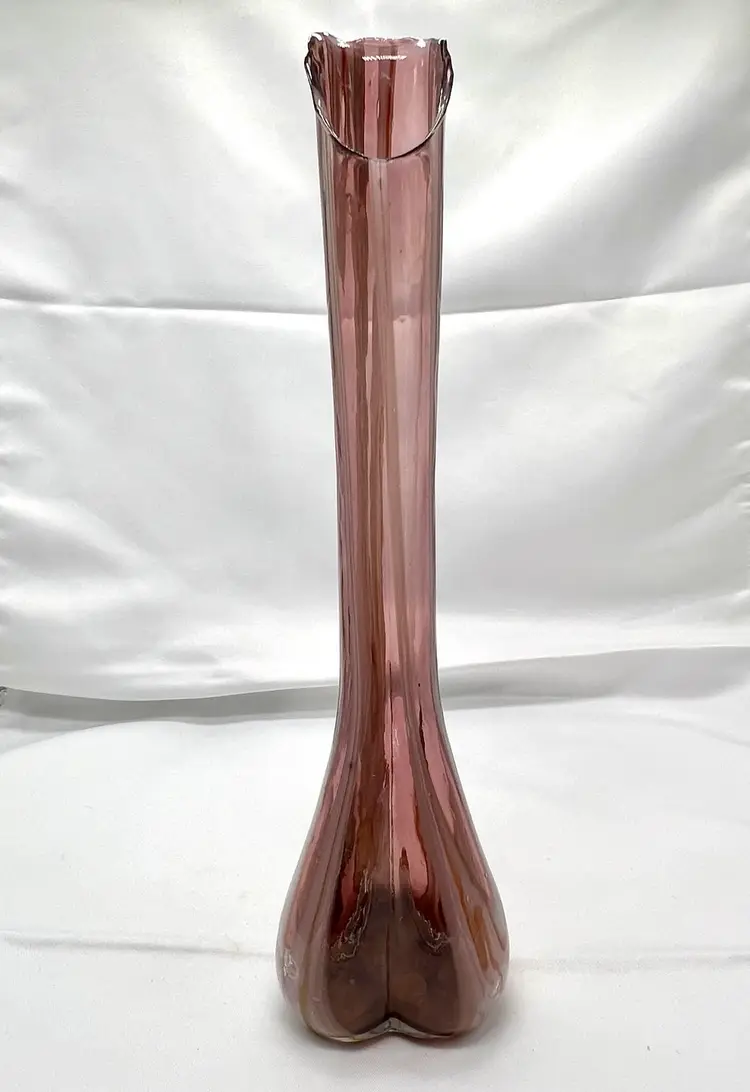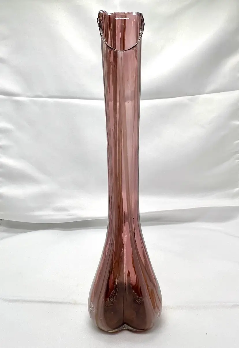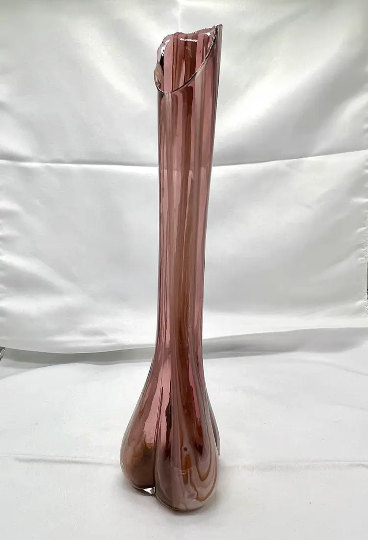 Add a touch of elegance to your home decor with this stunning Hand Blown Purple Slag Glass Swung Vase. The abstract art design and decorative style make it a perfect fit for any room in your house. The vase stands tall at 10 1/2” and features a unique striped pattern that adds to its charm. The brand is unmarked, but the quality of the vase speaks for itself. This beautiful vase is a must-have for collectors of art glass and decorative pottery. Condition is used but appears to be in good shape. A few bubbles in the glass as pictured. Please review all pictures.