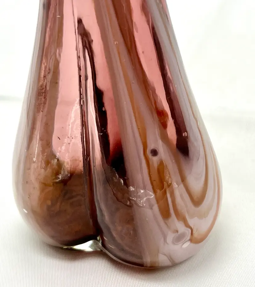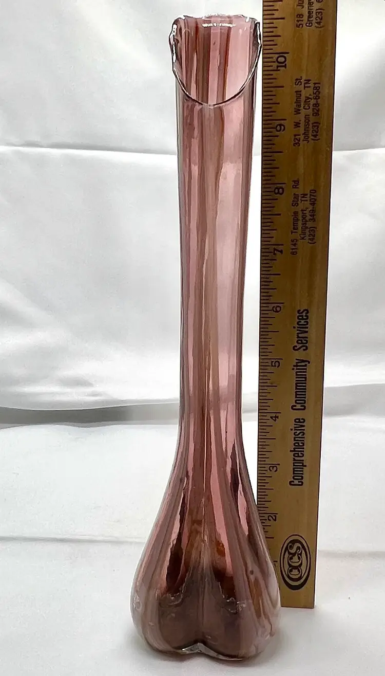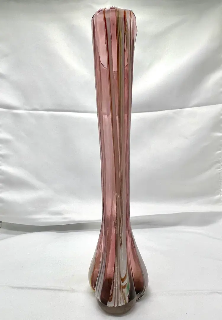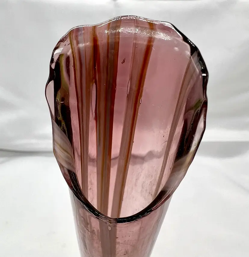 Add a touch of elegance to your home decor with this stunning Hand Blown Purple Slag Glass Swung Vase. The abstract art design and decorative style make it a perfect fit for any room in your house. The vase stands tall at 10 1/2” and features a unique striped pattern that adds to its charm. The brand is unmarked, but the quality of the vase speaks for itself. This beautiful vase is a must-have for collectors of art glass and decorative pottery. Condition is used but appears to be in good shape. A few bubbles in the glass as pictured. Please review all pictures.