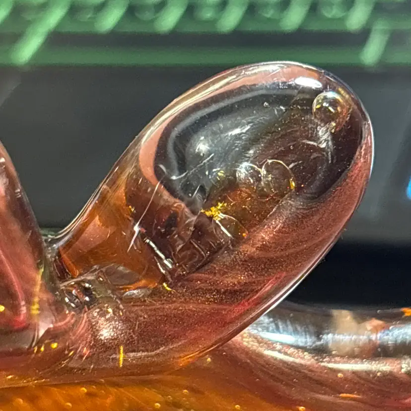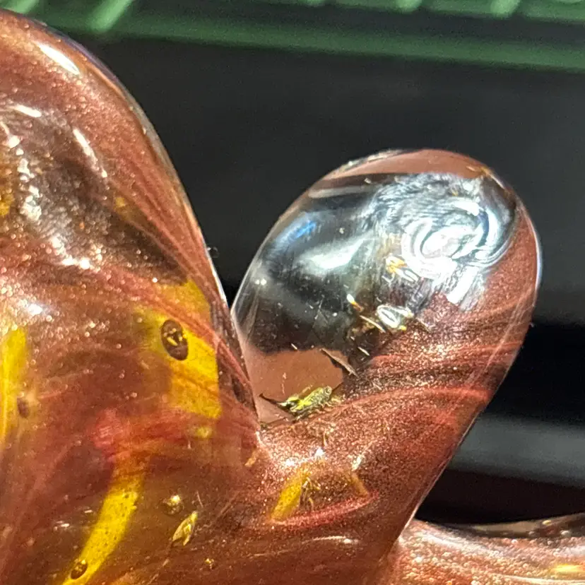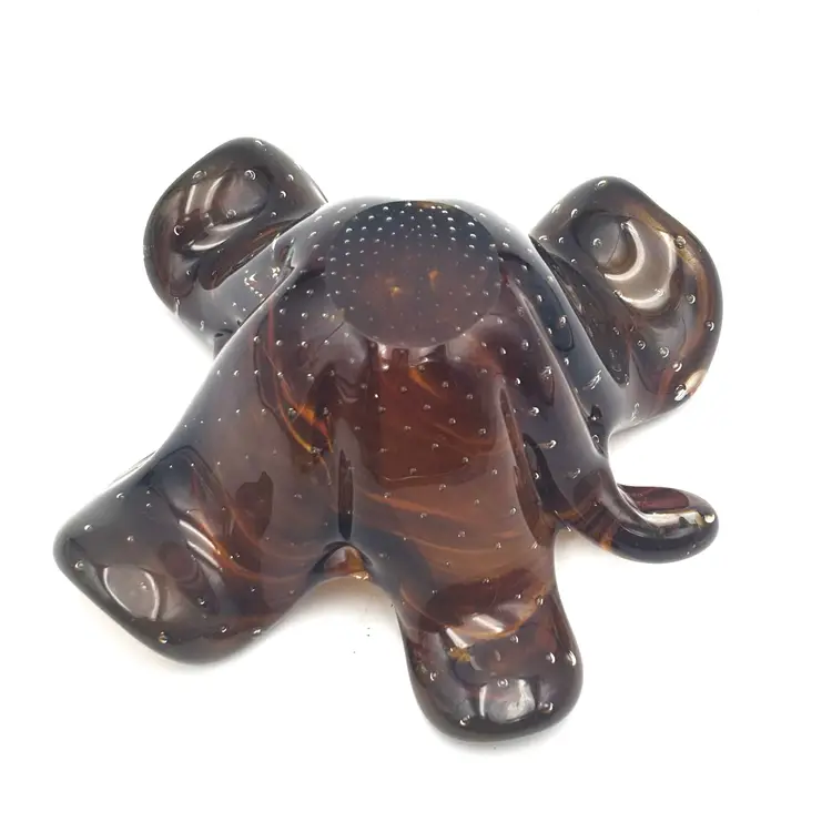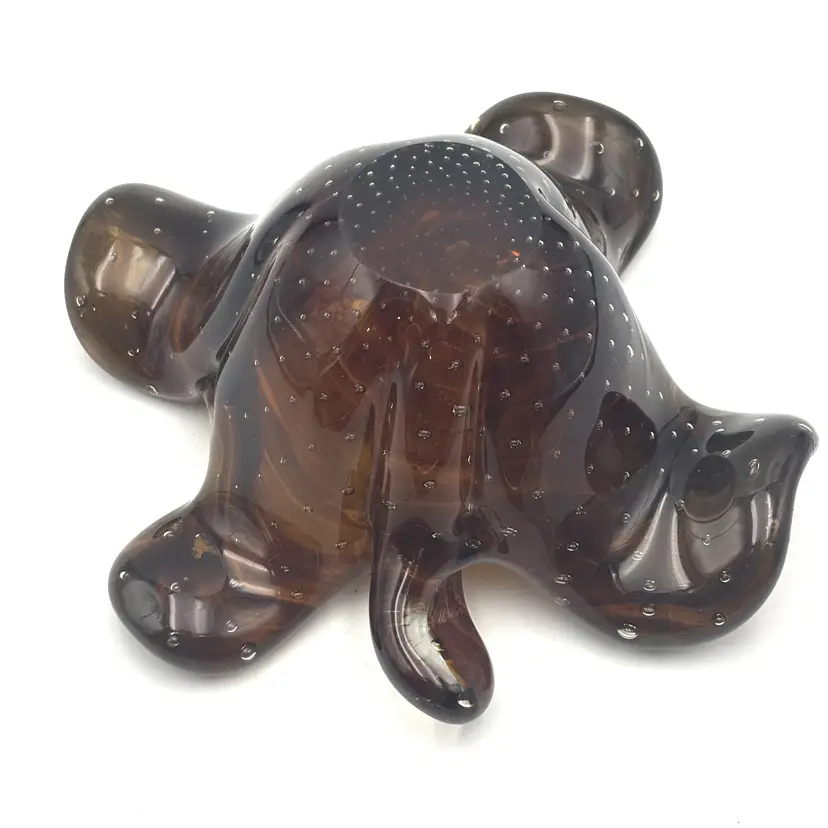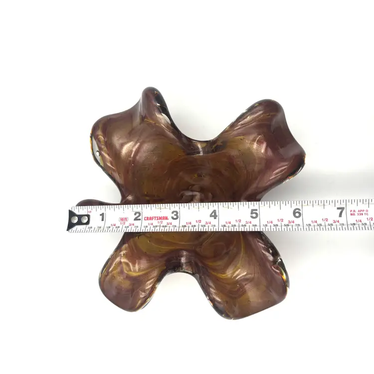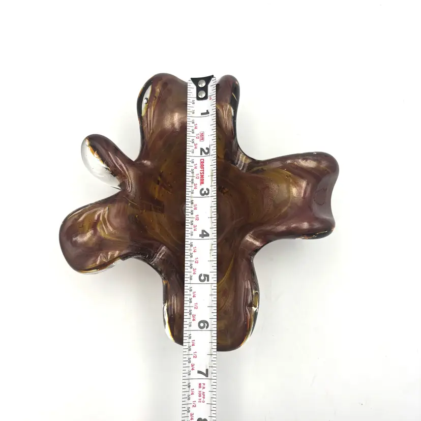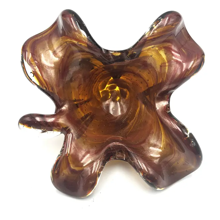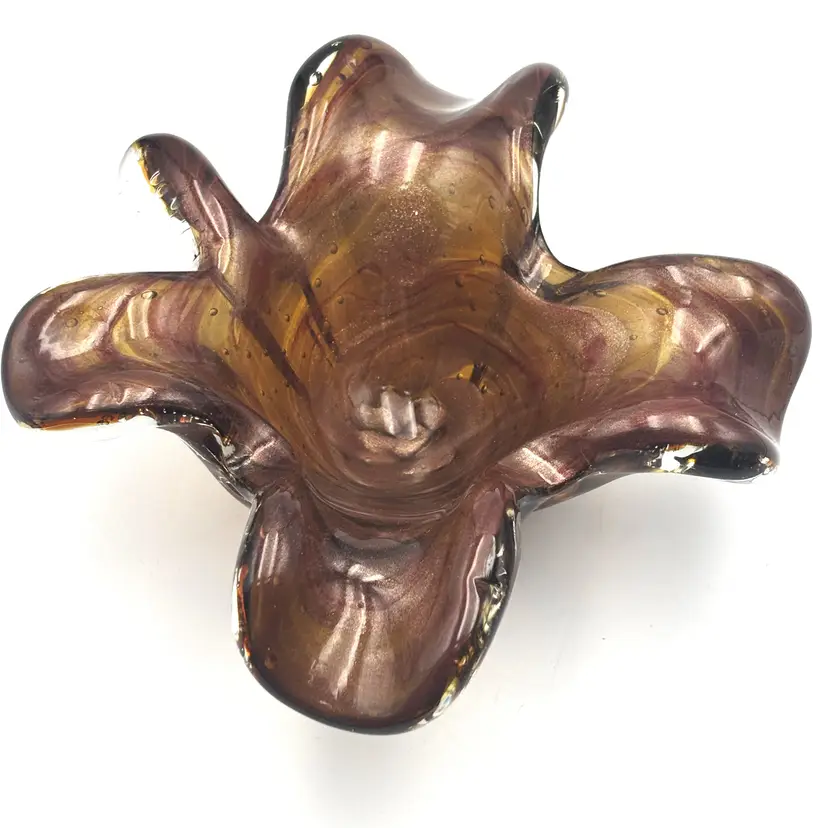 Features: free-form ruffled flower / star shape with five softly flared lobes. There are copper swirl inclusions that shimmers under the light and the bowl has controlled bubbles all over with a polished bottom.