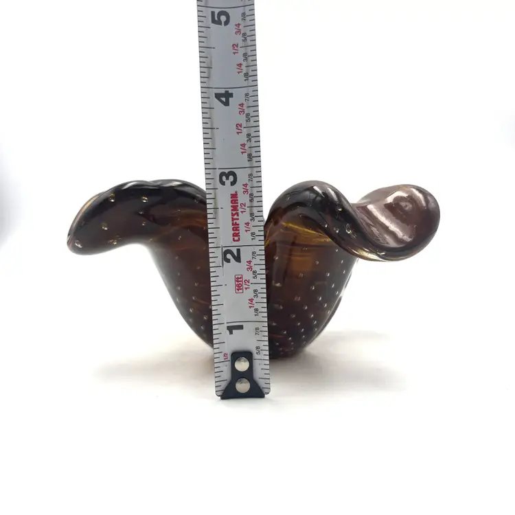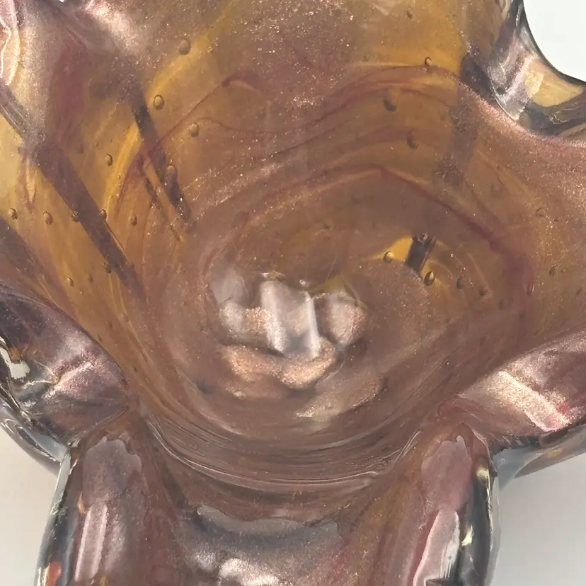For sale is a Hand Blown Studio Art Glass Ruffled Flower Bowl Amber Copper Swirls Bullicante