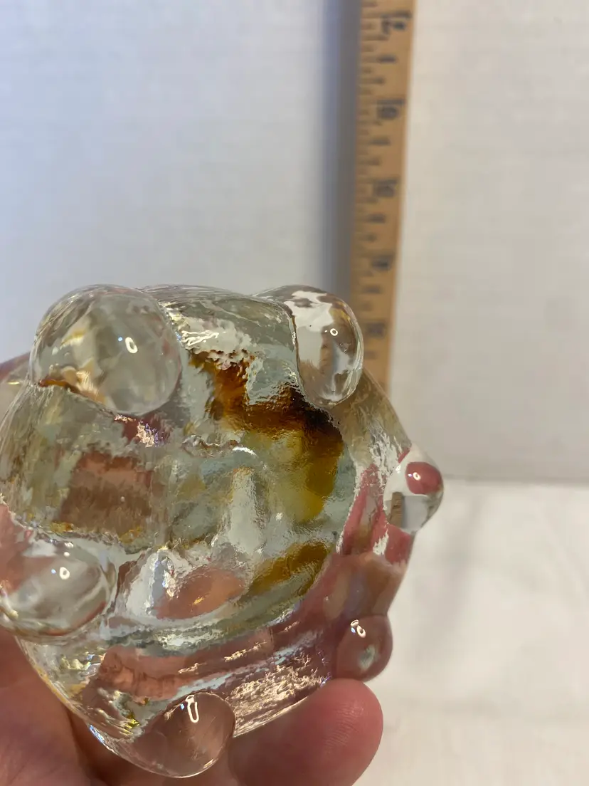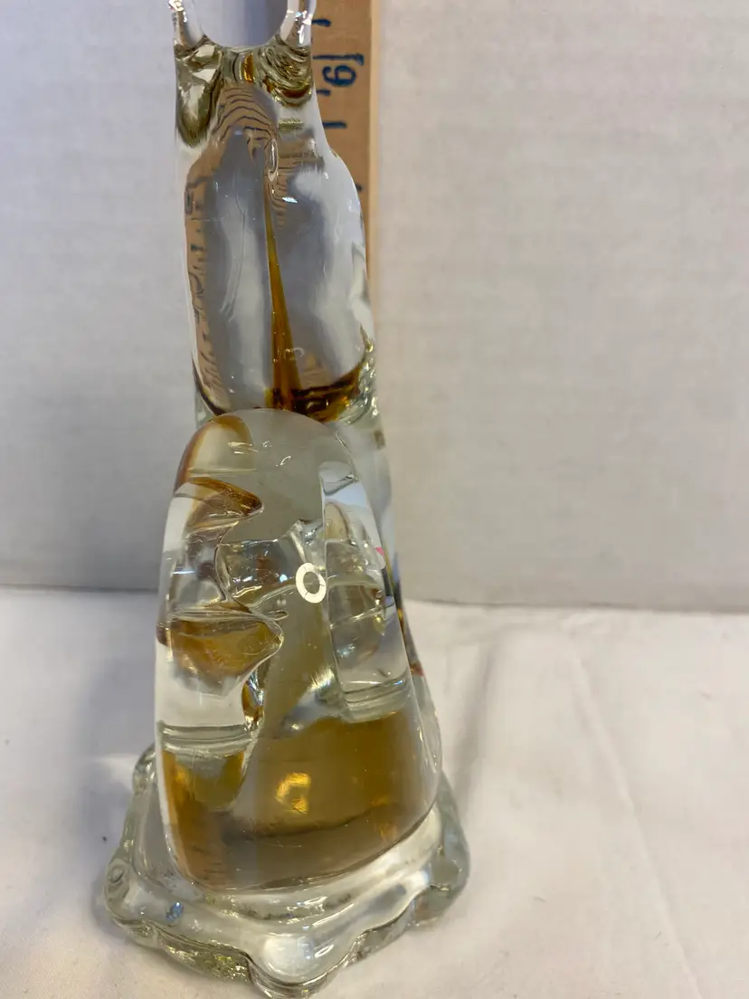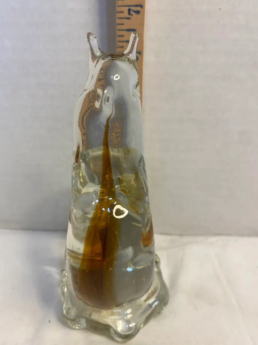 No chips or cracks in great condition, clear glass with Amber ribbon down middle. No signature or markings . Smooth bottom. Measurements are 6 1/2” tall x 3 1/2” wide x 2 3/4” thick.