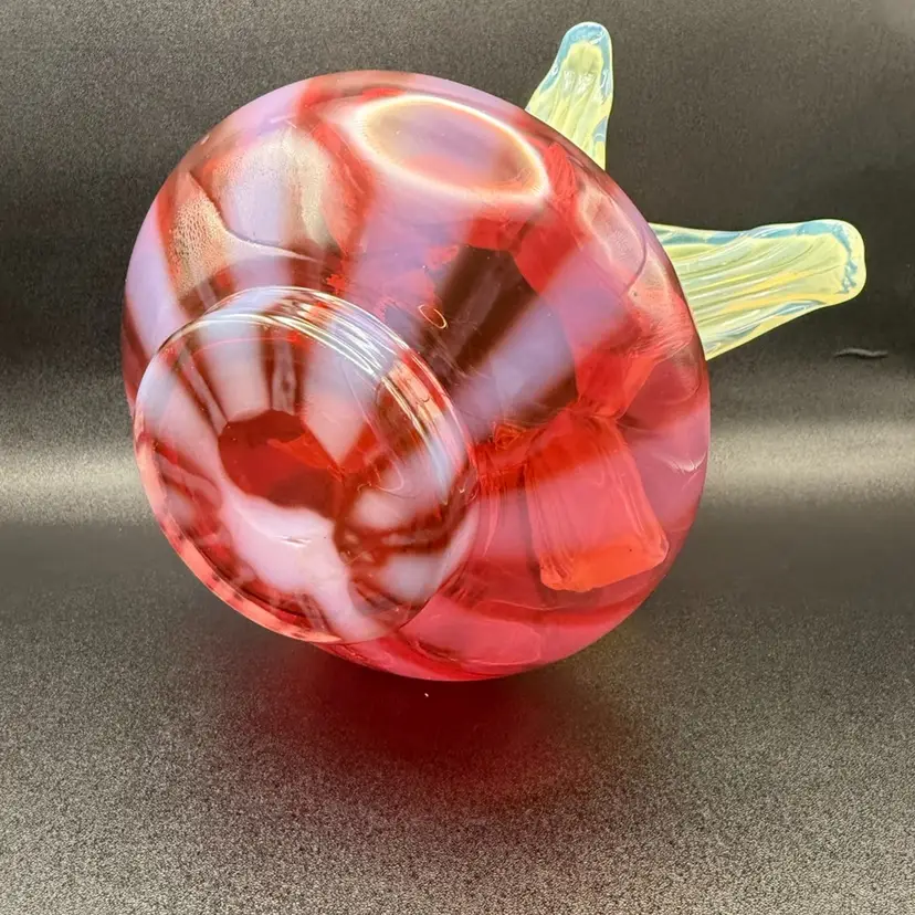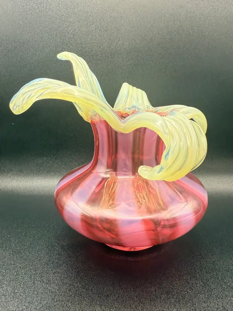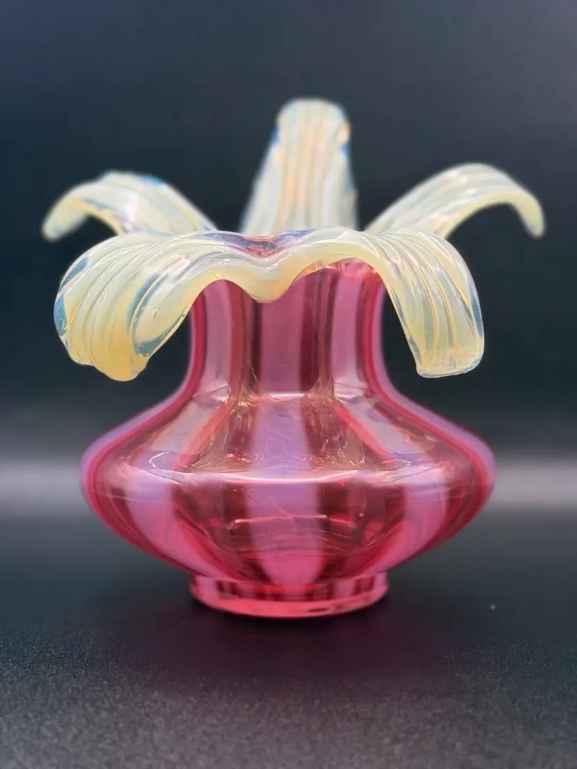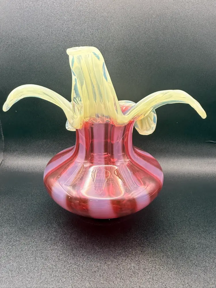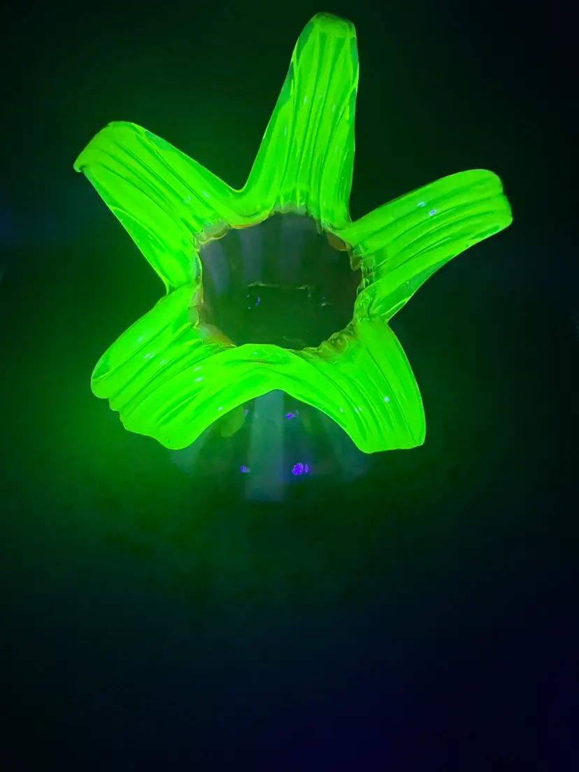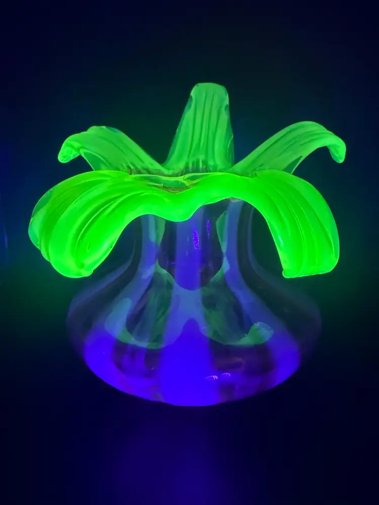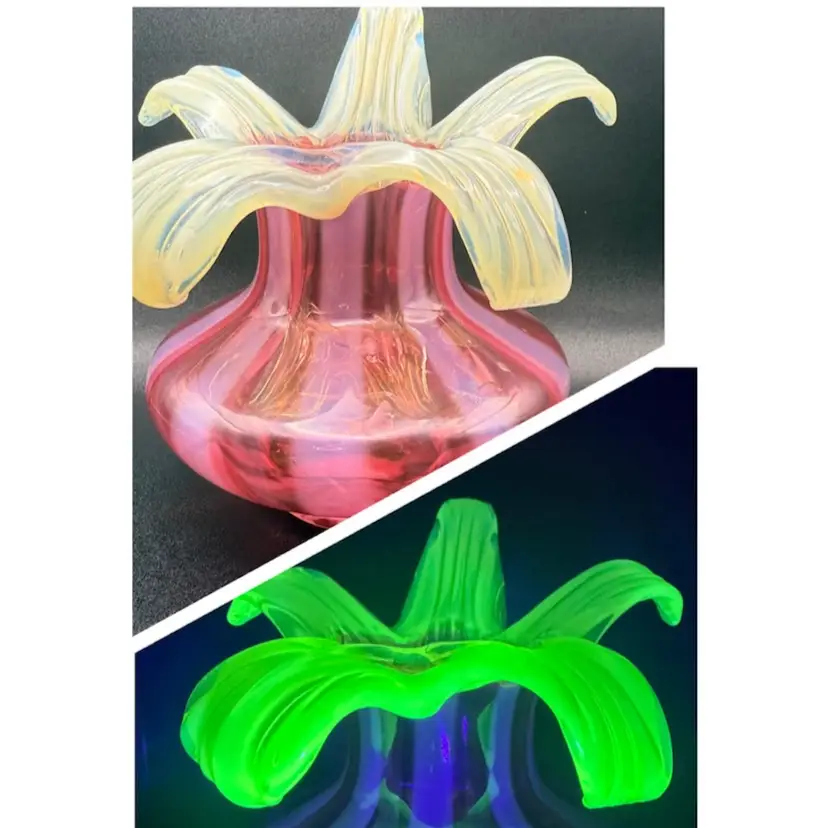 Love this combination of cranberry and Vaseline glass . Petals fully glow under black light. No chips or cracks 7” tall to highest petal 7” at widest