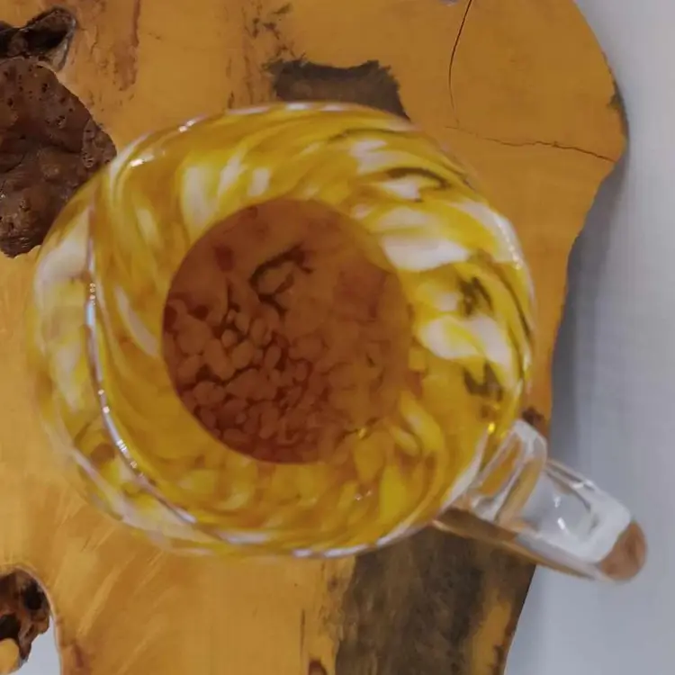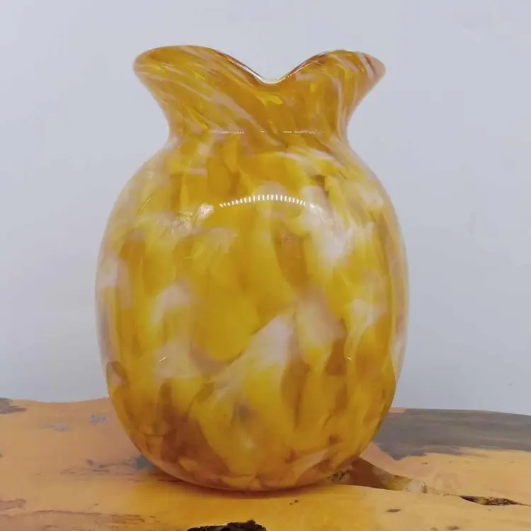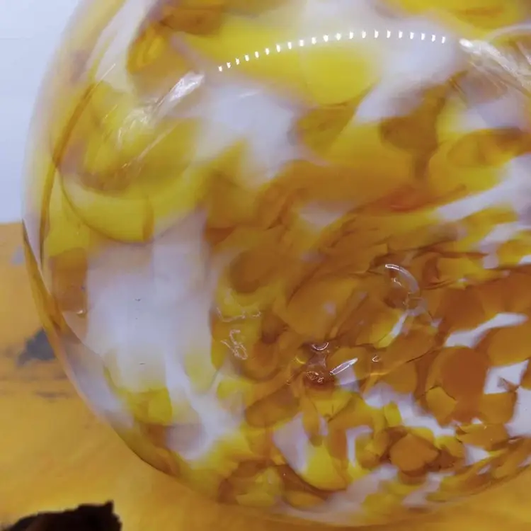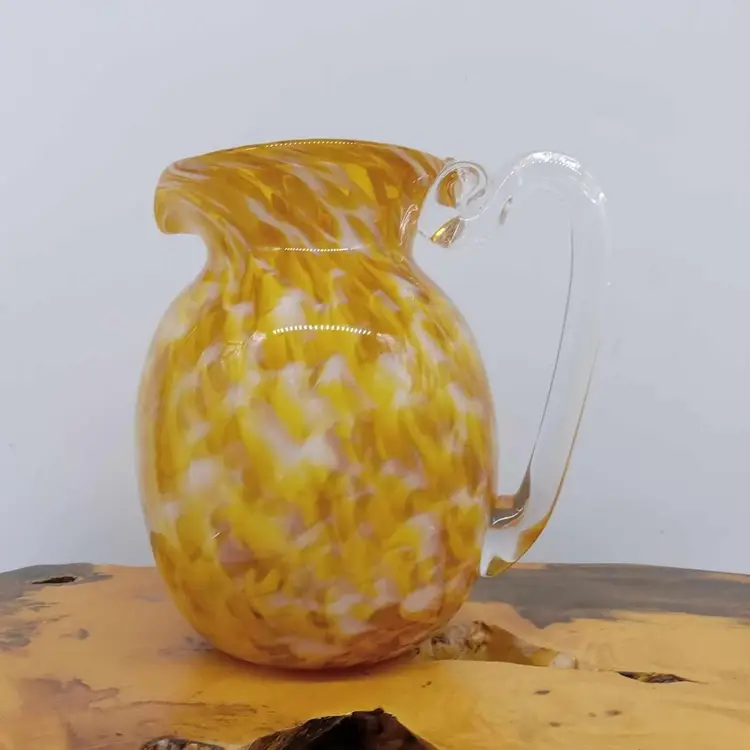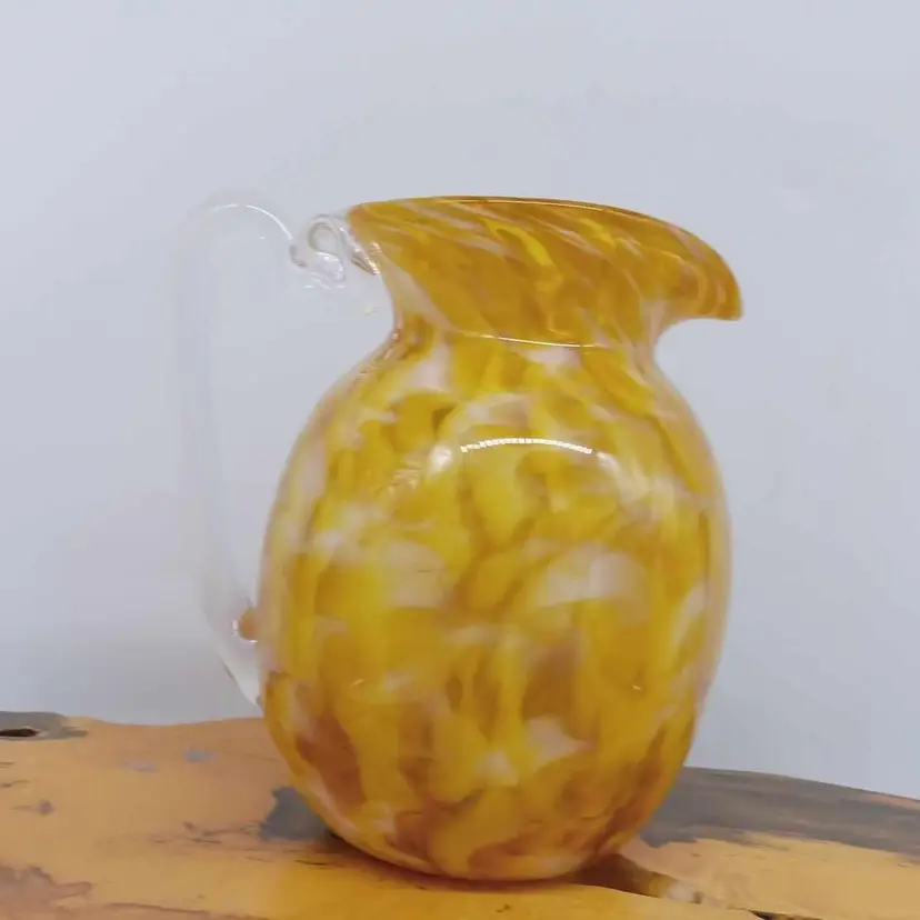 Here's a really pretty blown glass pitcher. It's yellow, white and clear and signed on the bottom with '09. It's 5.5 inches tall and 3 5/8 inches in diameter with no chips or cracks.