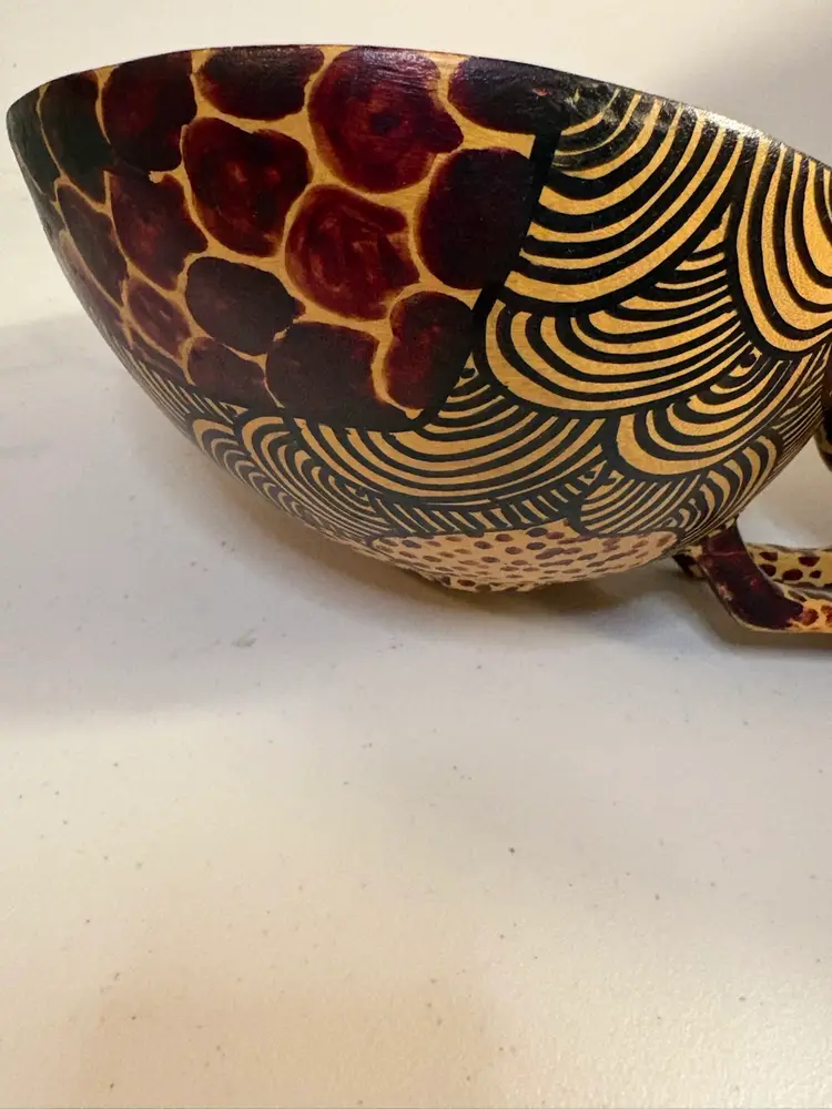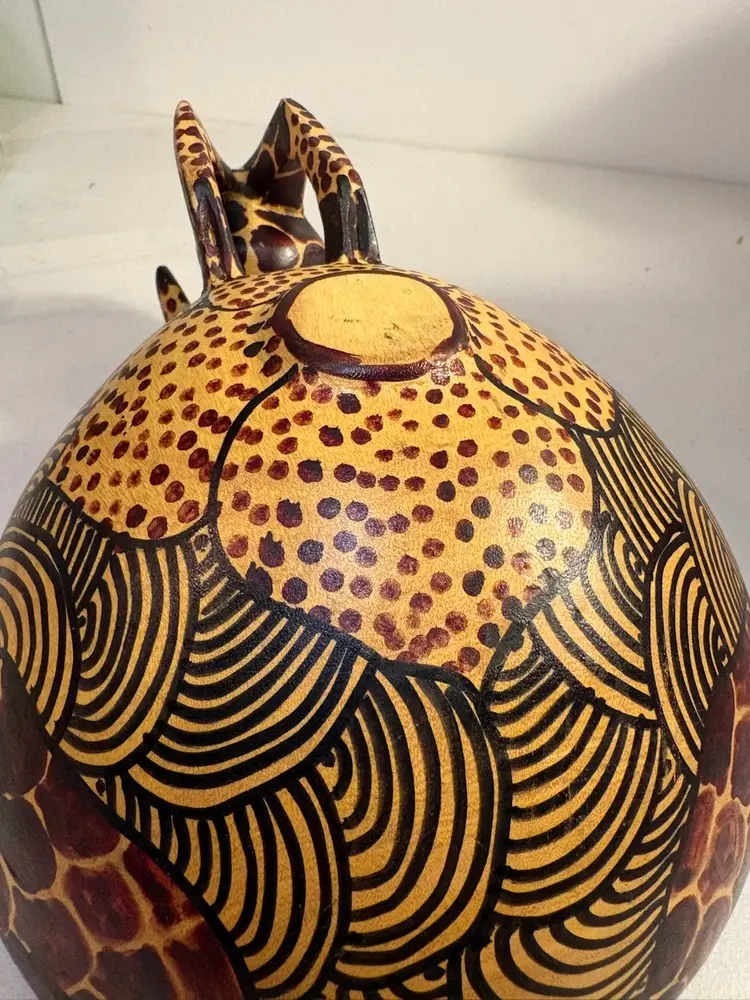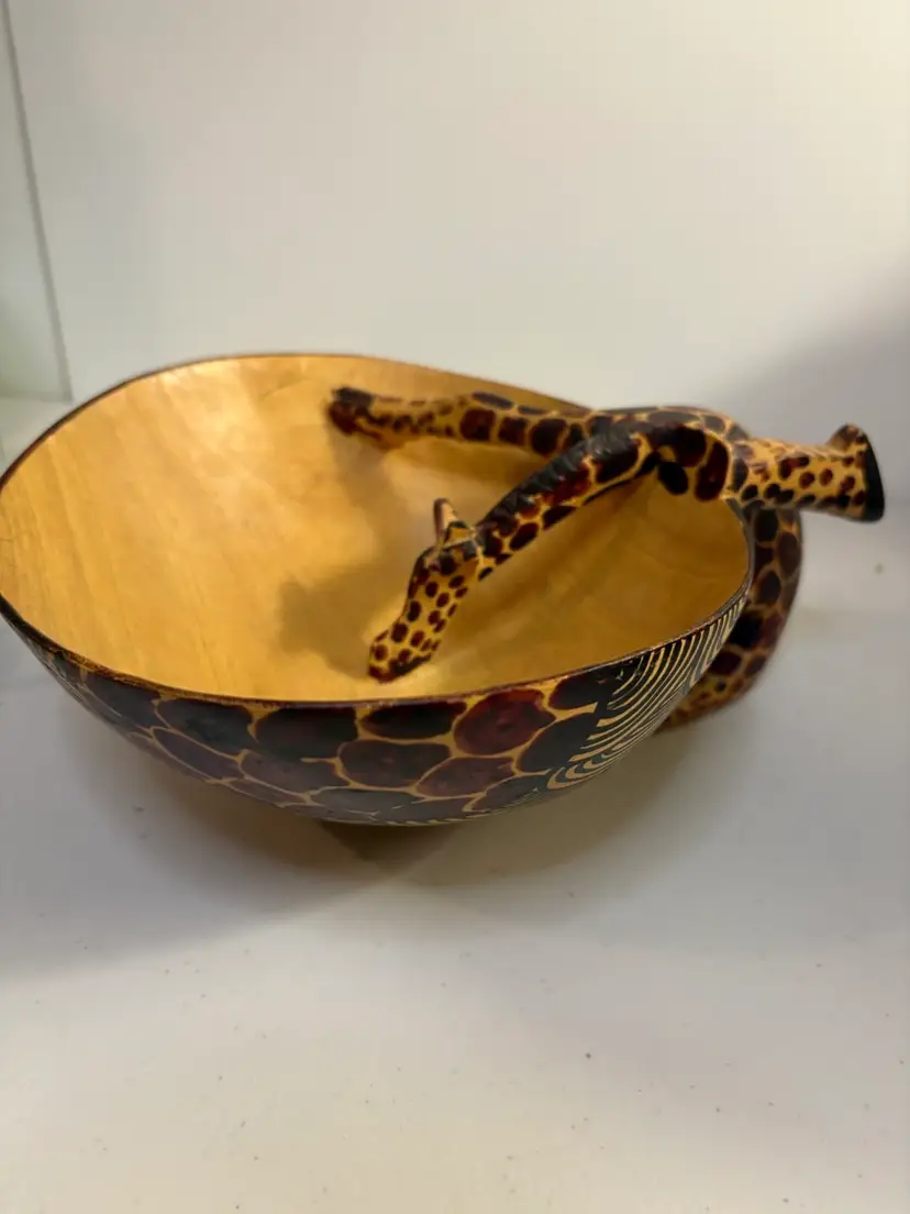 This hand-carved African wooden giraffe handle bowl features a unique design with a round shape and brown color. The bowl is made of wood and showcases a painted giraffe pattern, making it a perfect addition to any kitchen or home decor. With its ethnic style and handle feature, this original piece is ideal for all occasions and adds a touch of African culture to your space. Measuring 7 inches in length and diameter, this bowl is a collectible item that is sure to stand out in any collection.