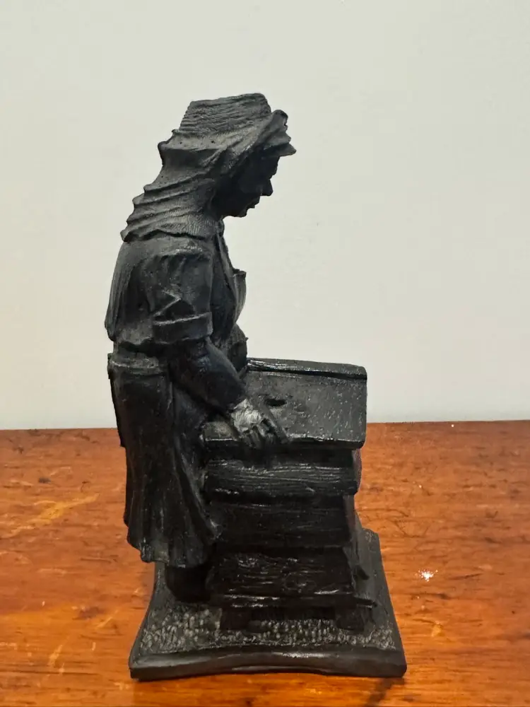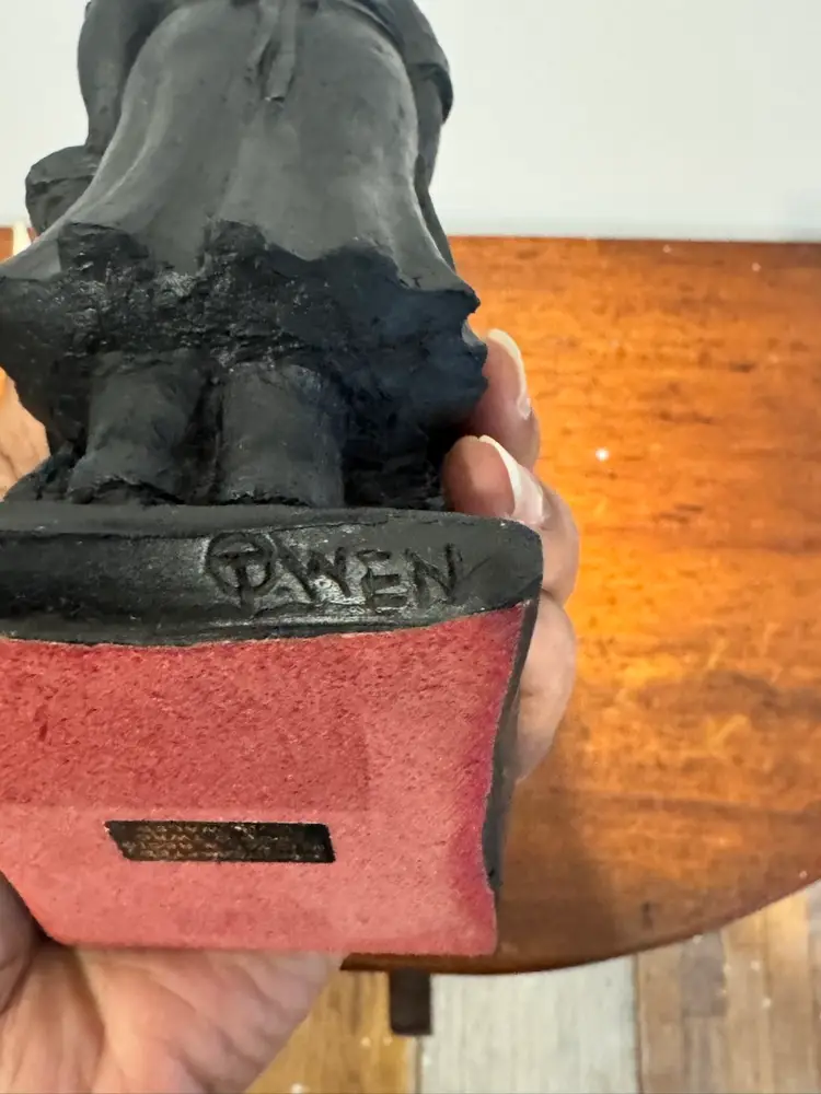 This vintage statue of a coal miner is about 7 inches tall, handcrafted with intricate carvings in black color. It is an original piece from the late 20th century, suitable for any room and all occasions. The figurine is signed.