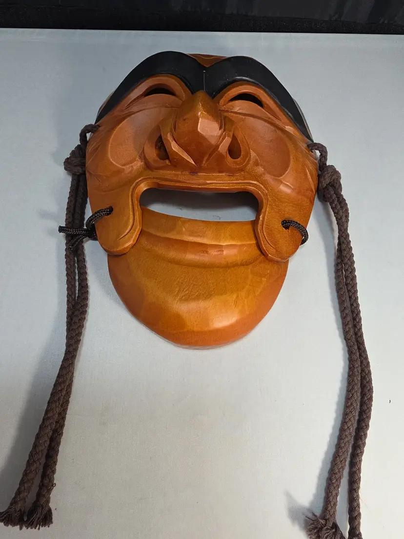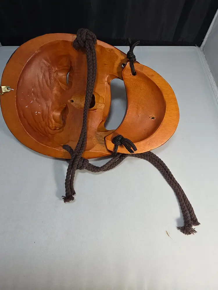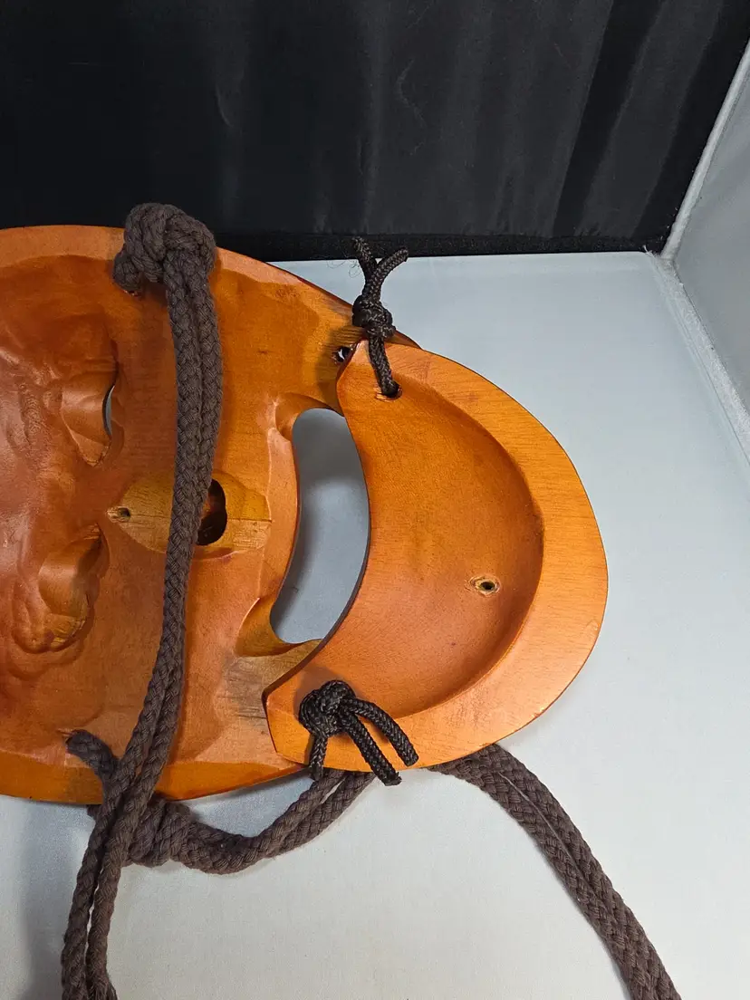 Description: Vintage Korean style carved wooden mask inspired by traditional Hahoe folk masks used in Korean theater and ceremonial performances. Features carved facial details with a dark brow, open mouth (mouth opens and closes), and cord ties on each side. The back includes a metal hanger for easy wall display. Great piece for Asian folk art collections, wall décor, or cultural display. Stored in a smoke and pet free home.