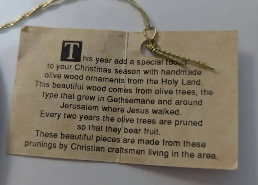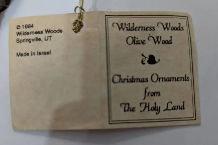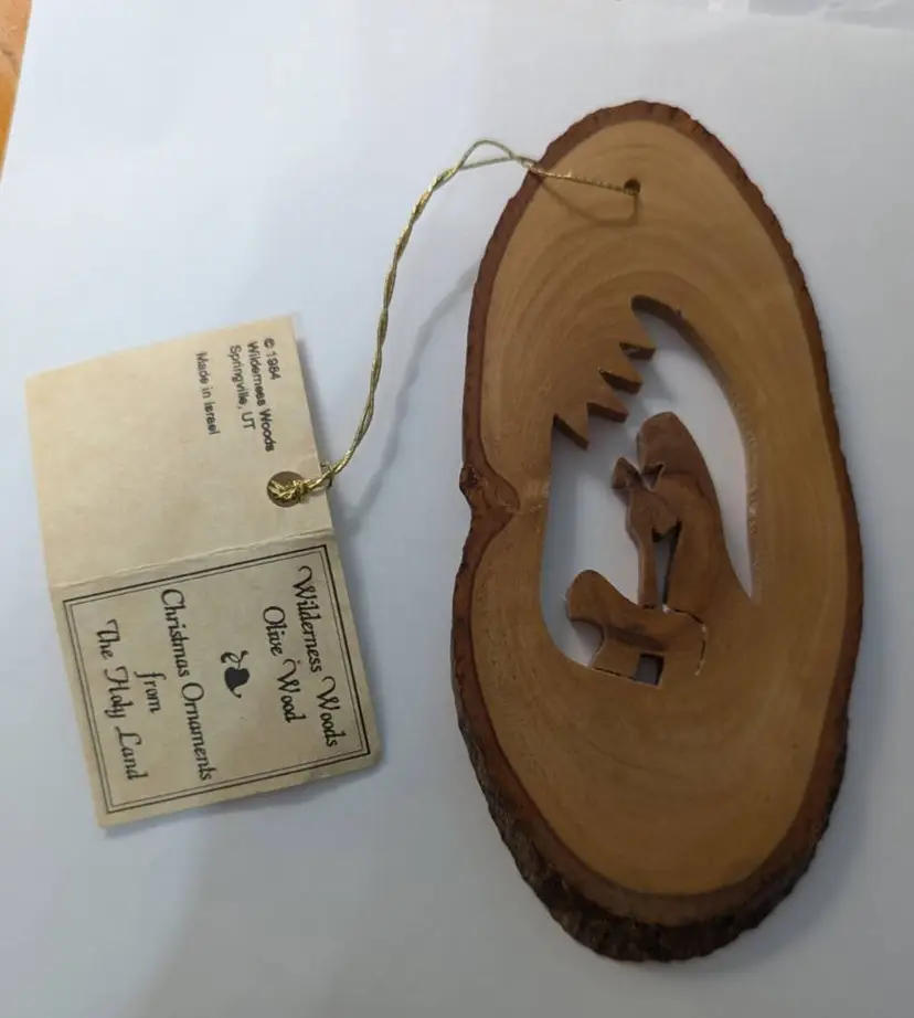 This is a beautiful handmade Christmas Ornament from the Holy Land. The Good Shepherd It is by Wilderness Woods- it is made from the Olive trees that were pruned in an around Gethsemane and Jerusalem The bark is still attached Christians craftsmen living in the area made these to support local economy. Dated 1984- appears to be the year they were starting to be made. Original tag still attached. Measures: 4.5 inches x 2 inches.
