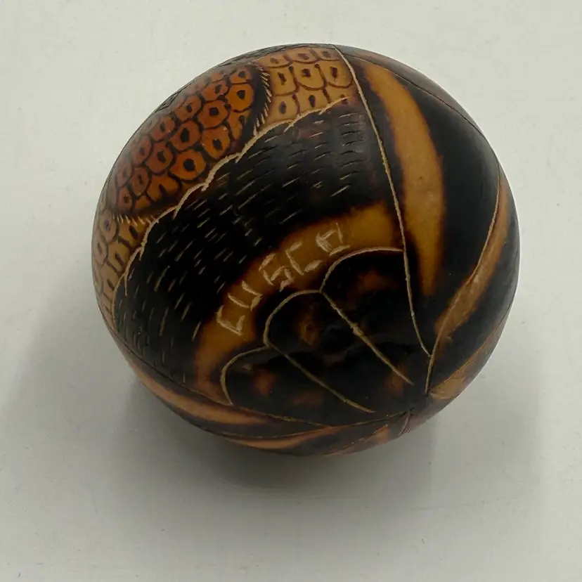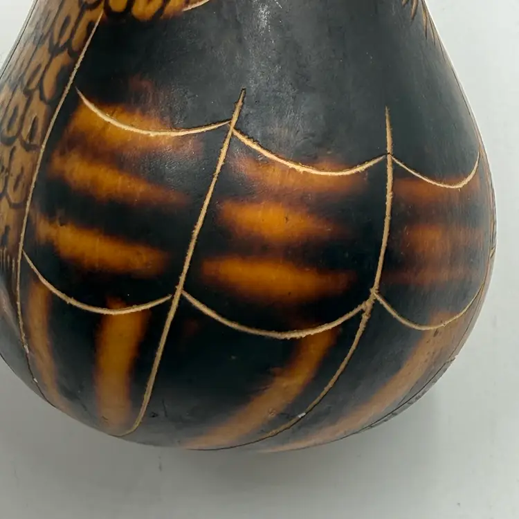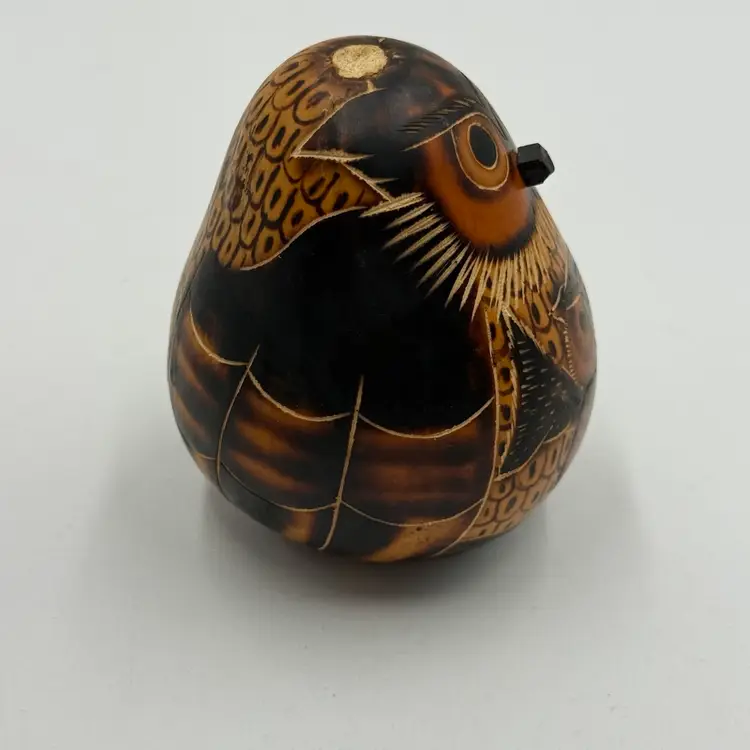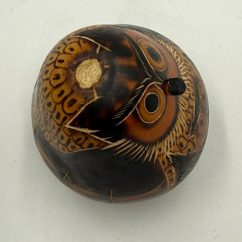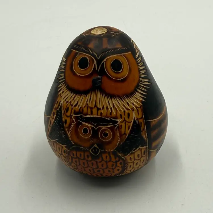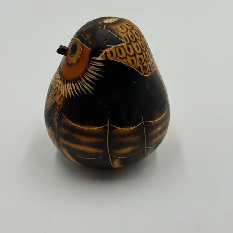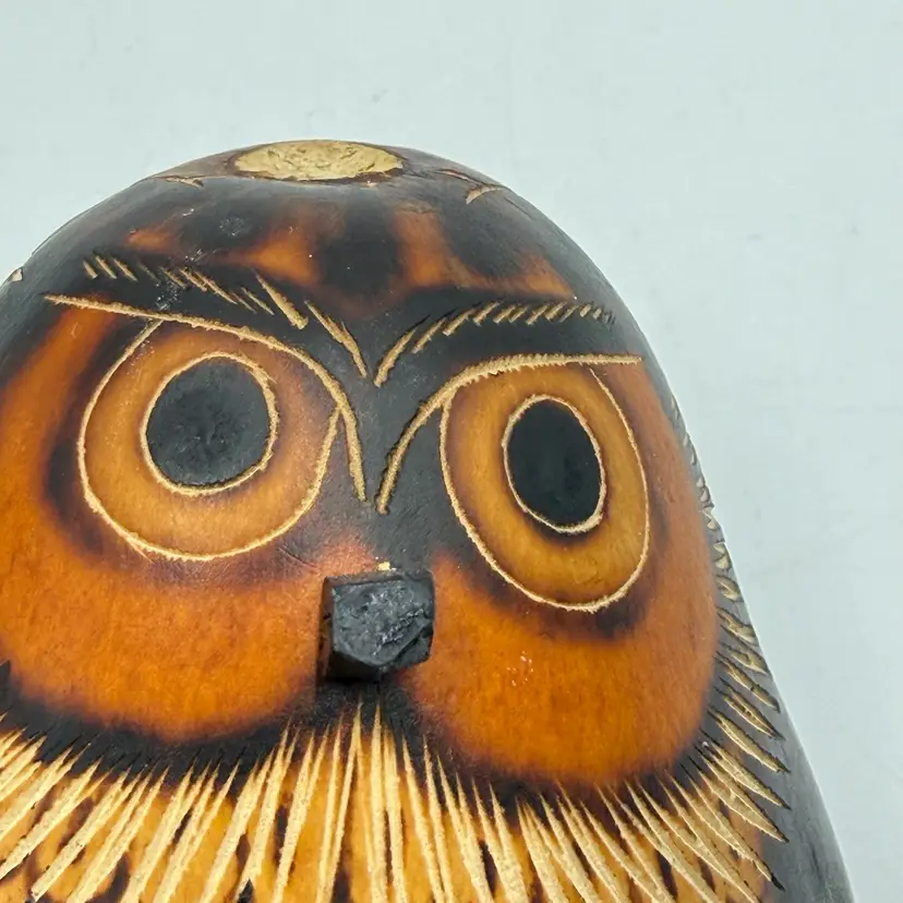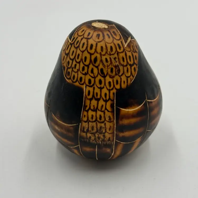 In good condition. The stem is broken off on the top of the head but otherwise has no other damage. Has seeds inside and rattles. Measures 3 1/2 inches tall and 3 inches wide.