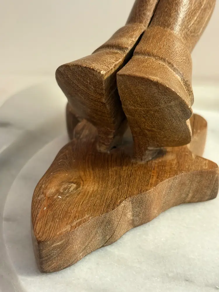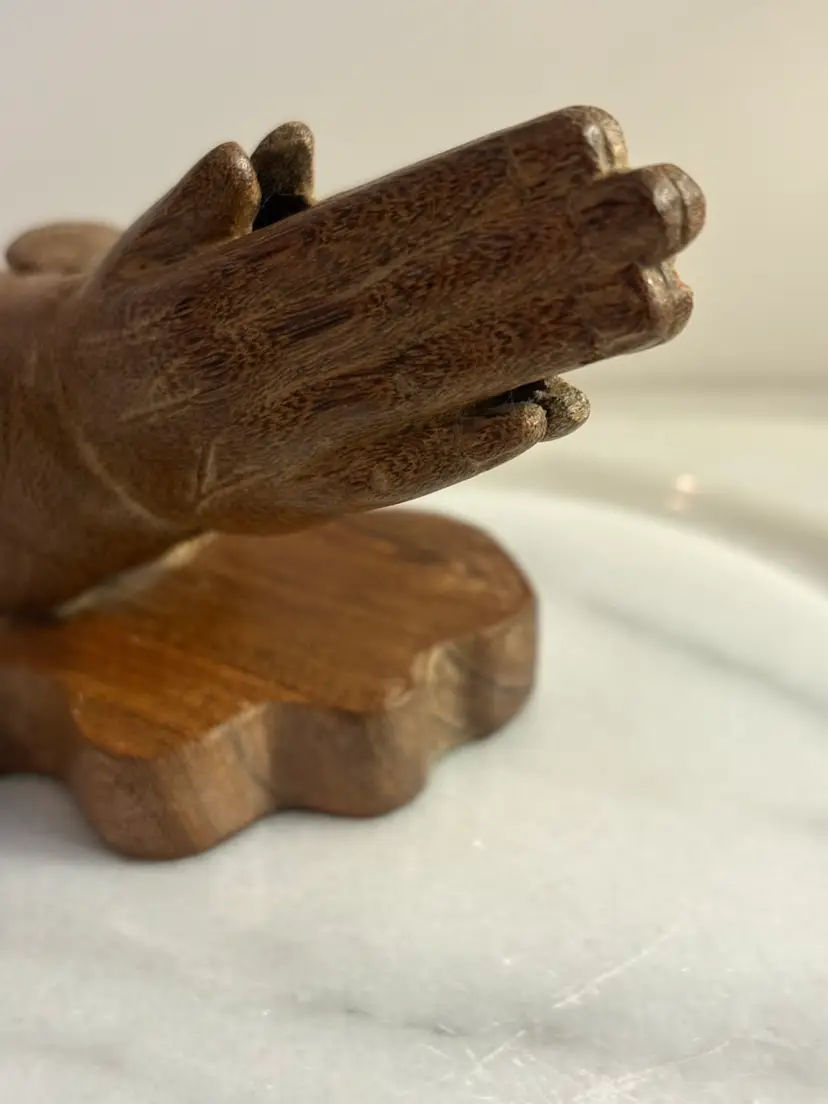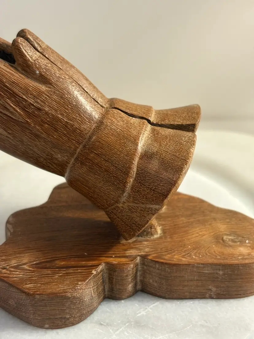 The product is a hand-carved statue of praying hands that measures 6 inches in length. This collectible item is inspired by Christianity and depicts a religious symbol of devotion and faith. Perfect for those who appreciate religious art and spirituality, this statue would make a meaningful addition to any collection or decor related to Christianity.