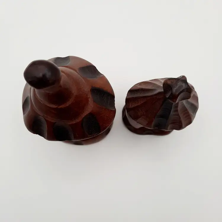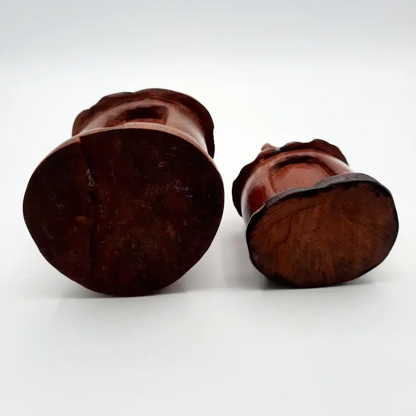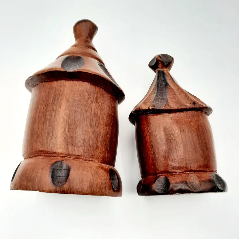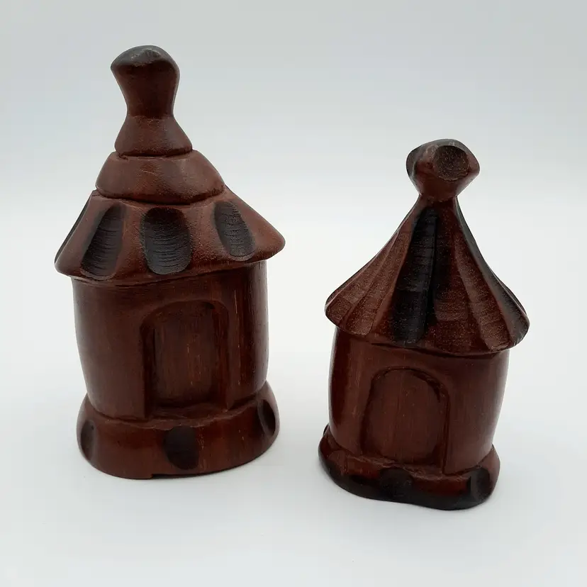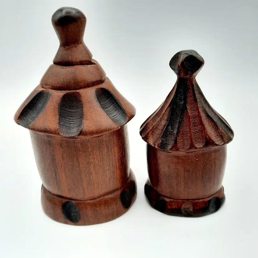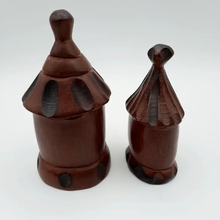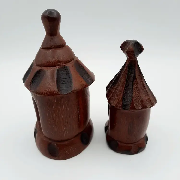 Not sure what type of structure these unique figures are, purchased at an estate sale from an owner who traveled the world and collected many things, she had these labeled as coming from Liberia. Large is 5 1/4"H, small is 4 1/4"H.