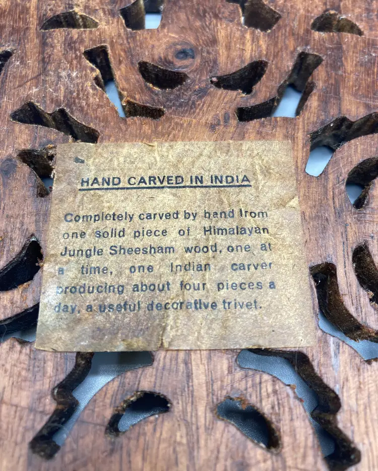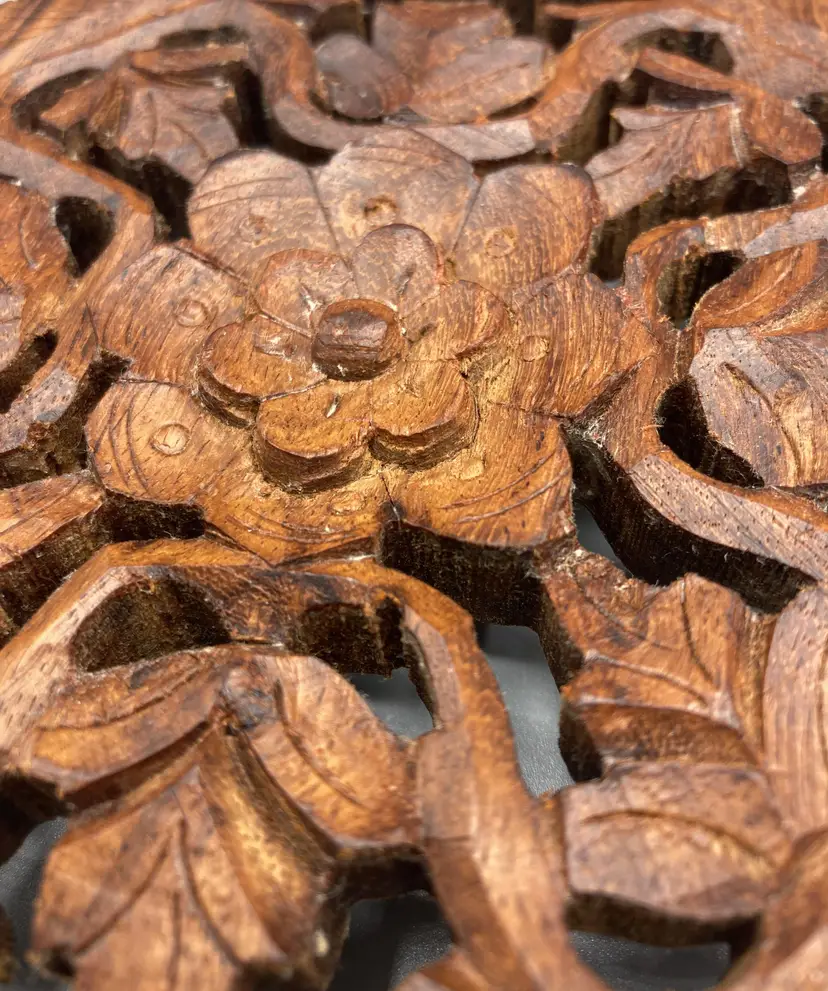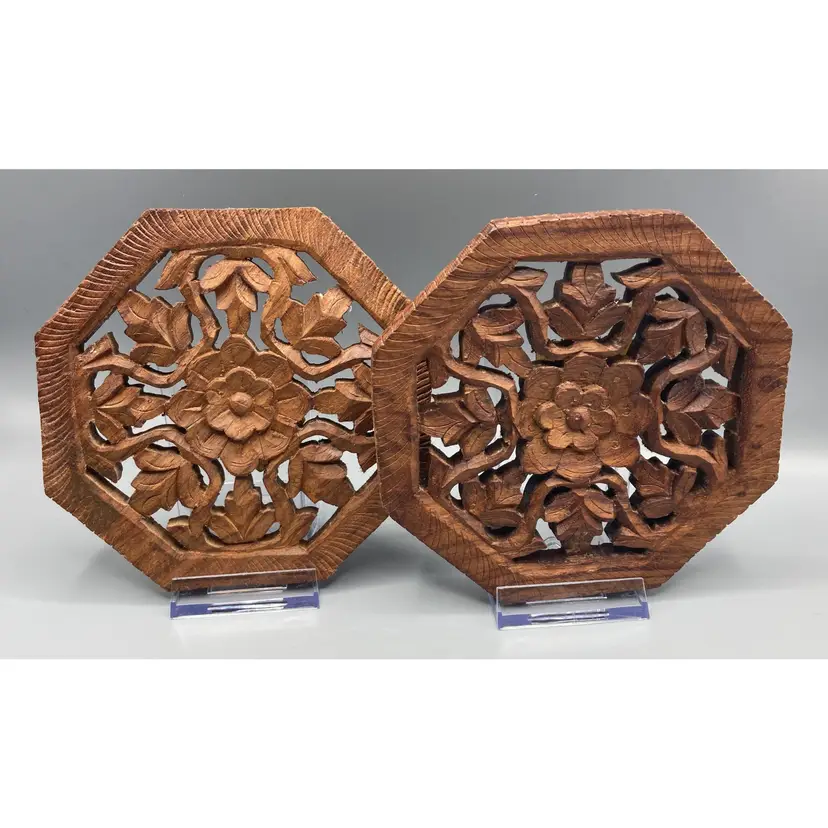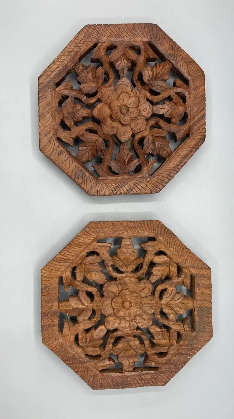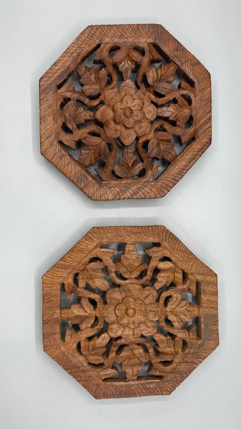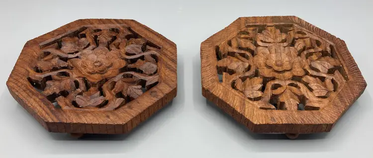 These trivets are in excellent condition. Carving is very detailed. The trivets measure approximately 6" across.