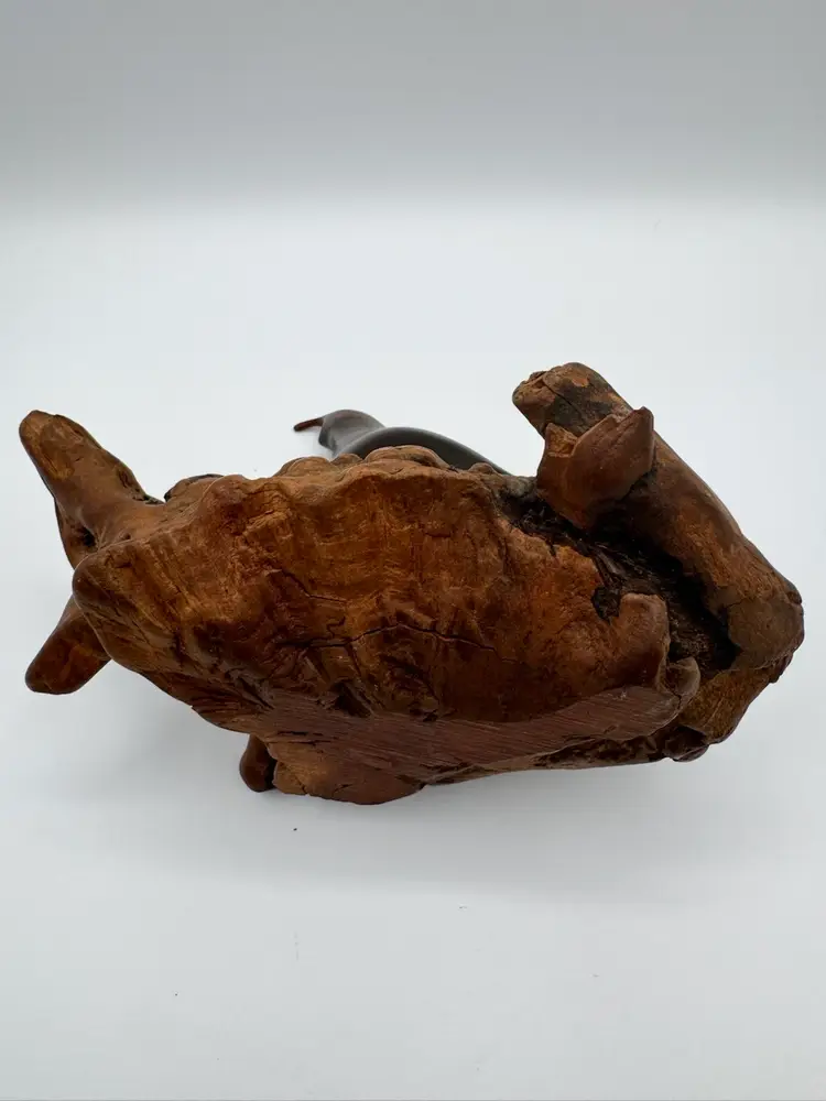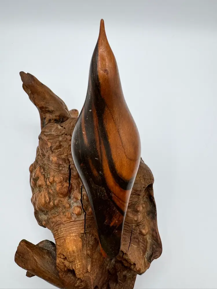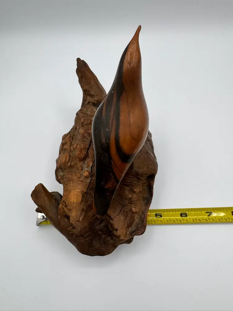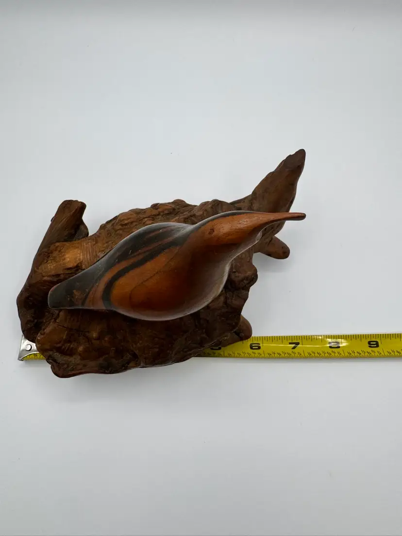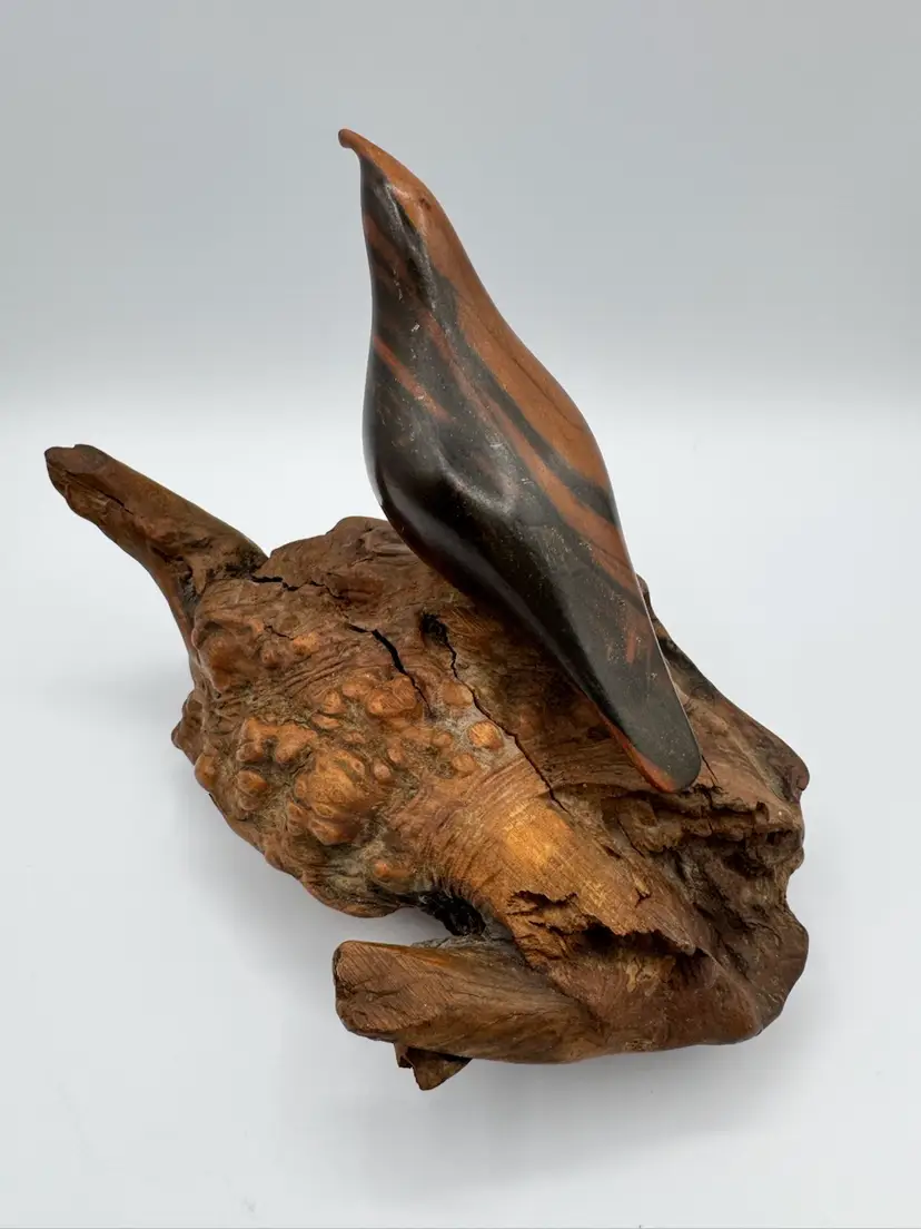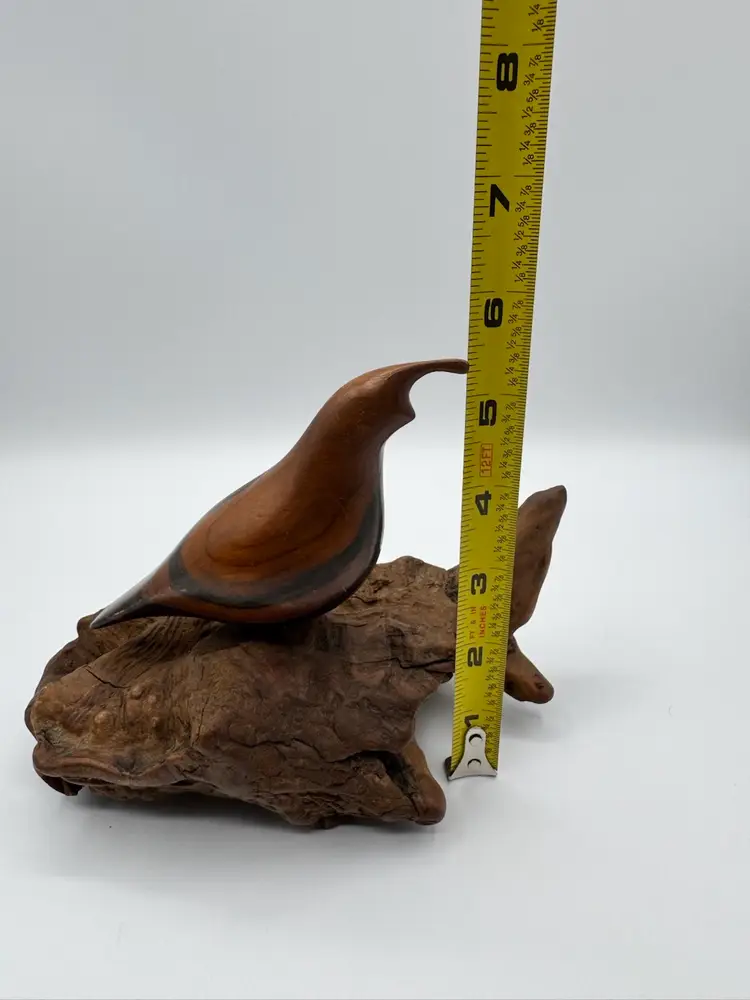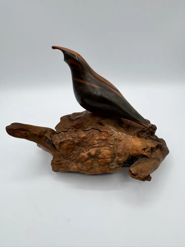 Item: Hand carved wood sculpture featuring a smooth Quail form mounted on a rugged natural burl or driftwood base.