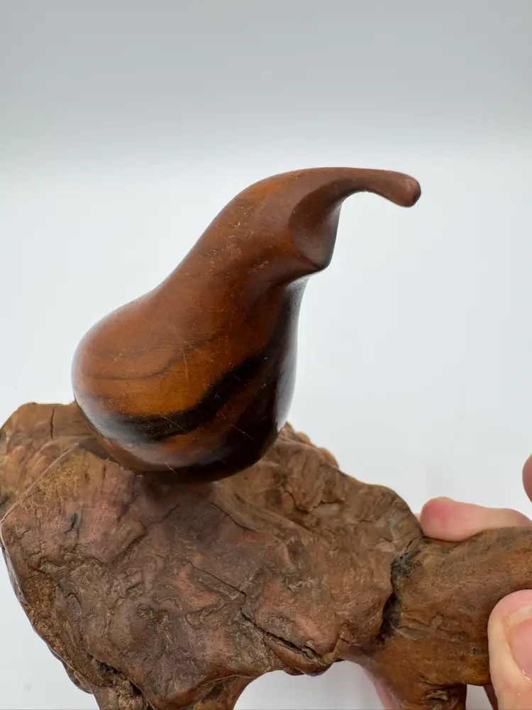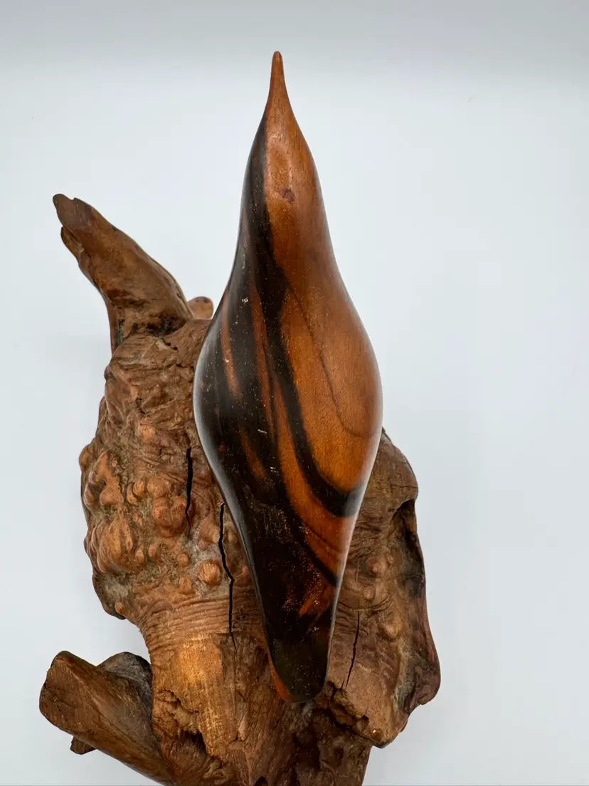 Material: Solid wood with contrasting grain tones; the carved piece has a smooth satin finish while the base retains a rustic, textured surface.