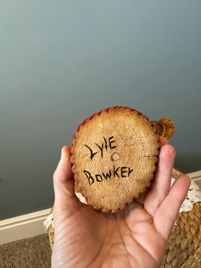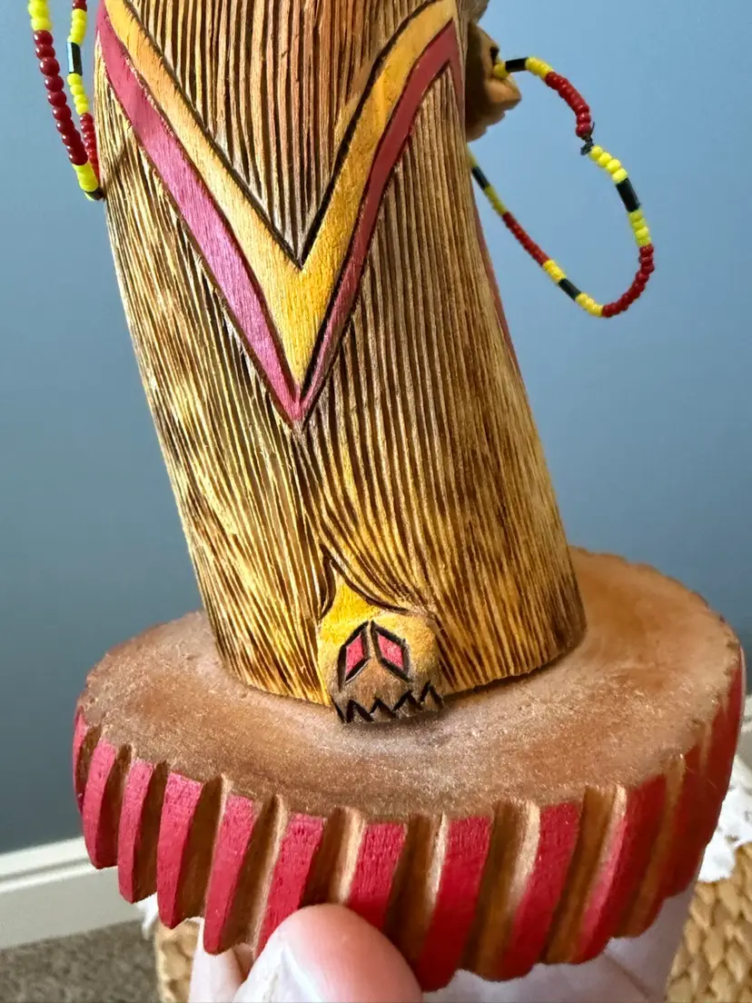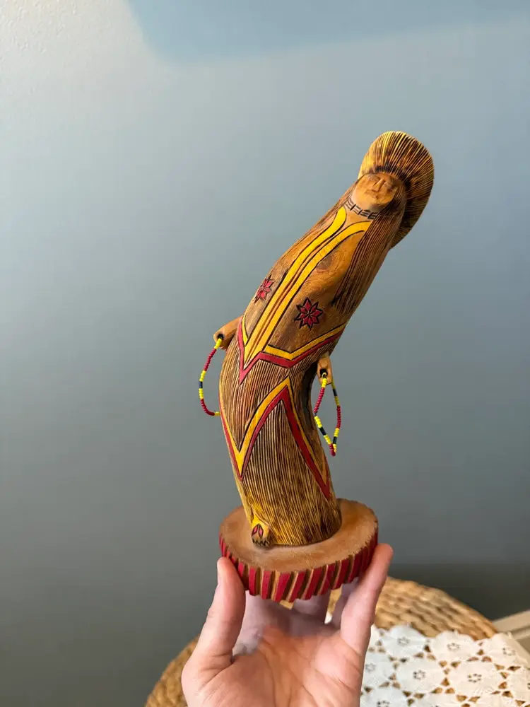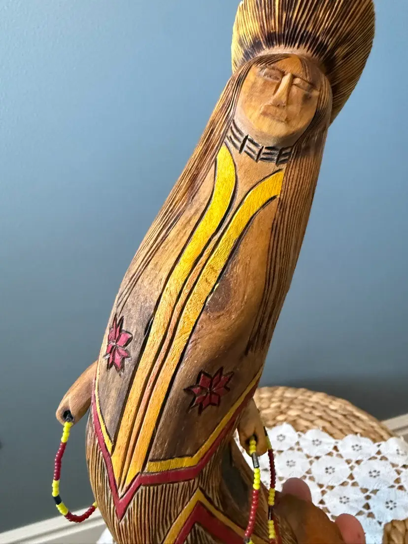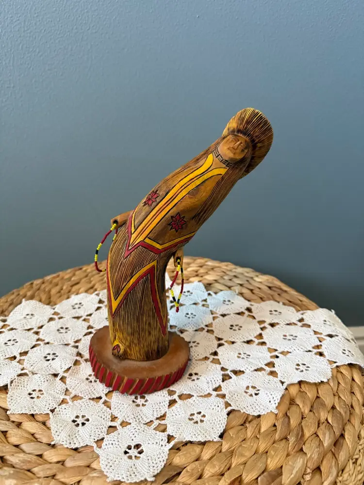 Hand-carved wooden folk art sculpture signed Lyle Bowkey on the base. This expressive piece depicts a stylized female dancer in motion, featuring carved texture, hand-painted geometric details in red, yellow, and black, and beaded dancing hoops held in each hand. The forward-leaning posture and elongated form emphasize movement and rhythm. Carved from solid wood with a warm, natural patina, this piece shows visible tool marks that highlight its hand-crafted nature. A striking, one-of-a-kind sculpture for collectors of folk art, contemporary Indigenous-inspired art, or Southwestern décor.