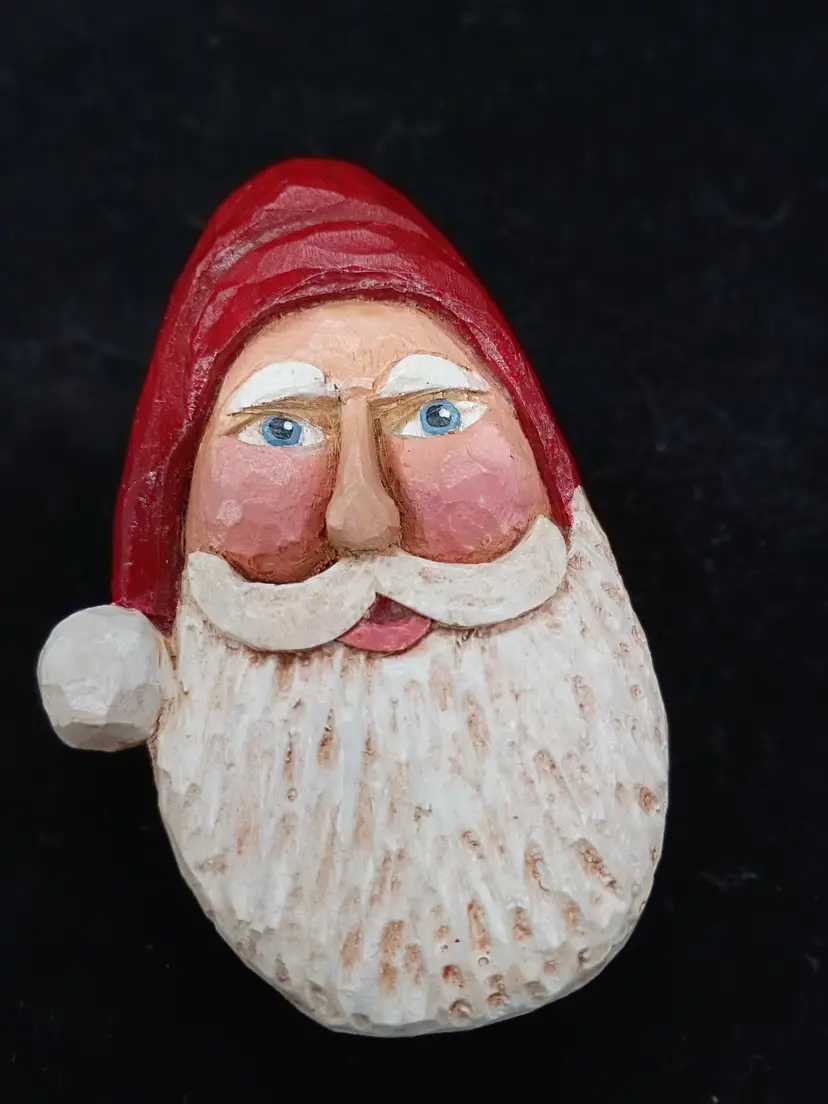 Hand Carved Wooden Folk Art Primitive Santa Head Brooch Pin Signed Vintage. This is 3.5 inches top to bottom and 2.25 inches side to side. This is preowned, no chips cracks paint intact, pin back is secure and functions normally. Circa early 1990's. Excellent condition. Ships USPS domestically and UPS/ USPS International Shipping globally