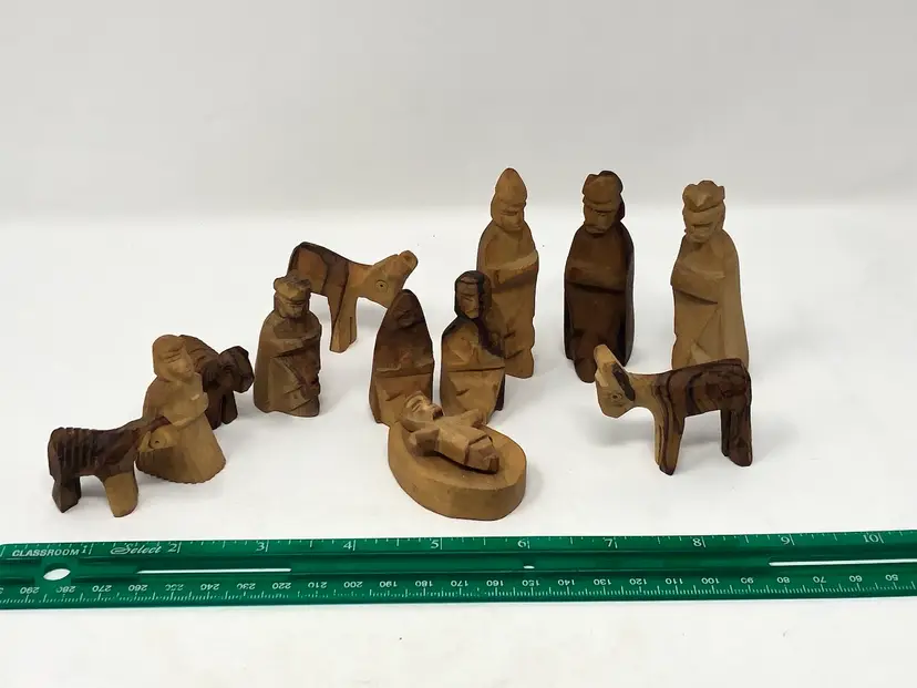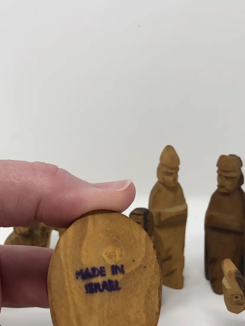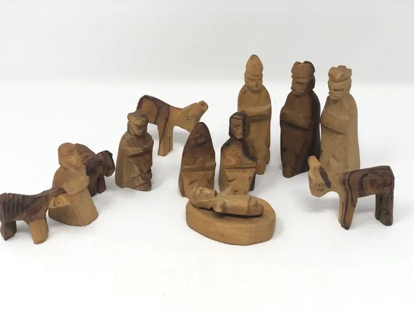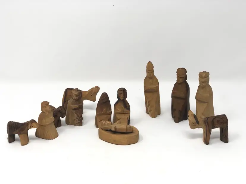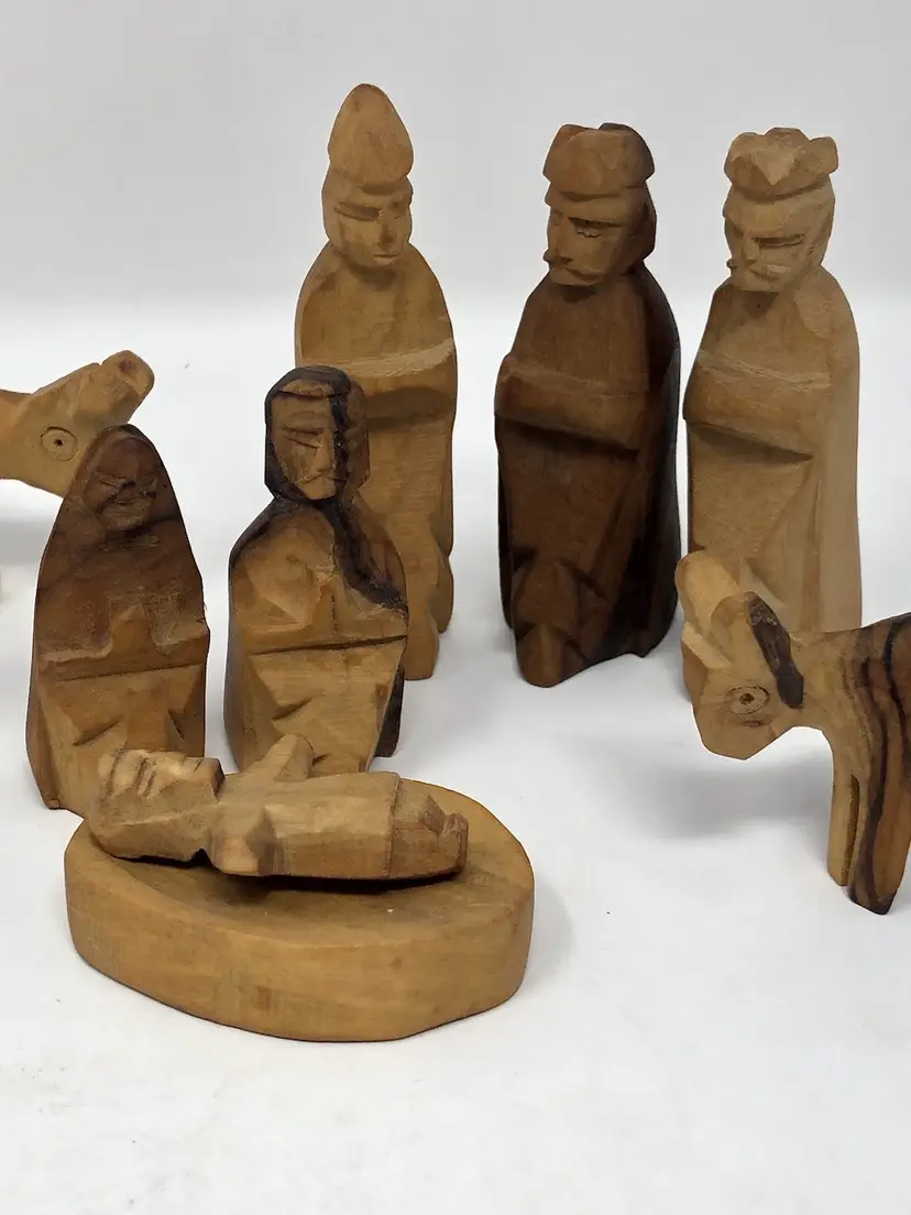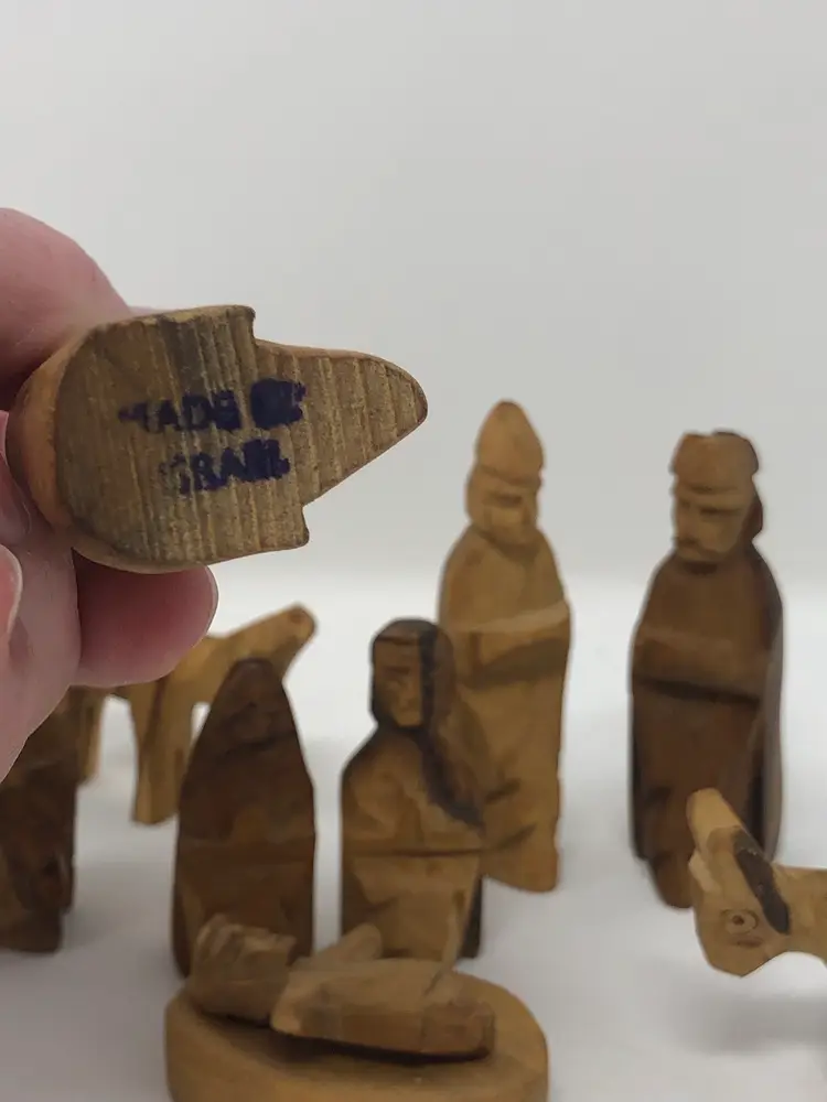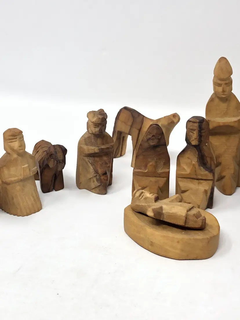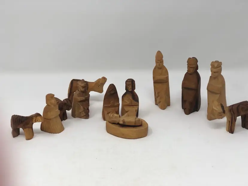 13 piece set of hand carved wooden figures stamped Made in Israel. Varying shades of light and dark wood. Figures include wise men, shepherds, animals and Holy Family, the tallest, just under 3"