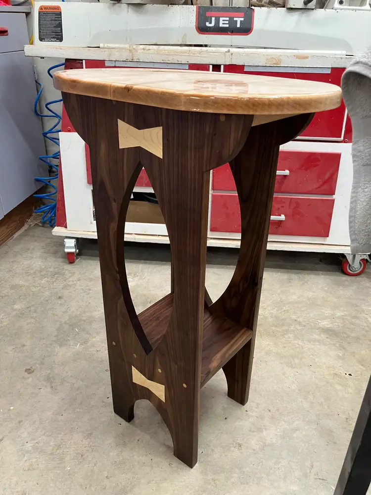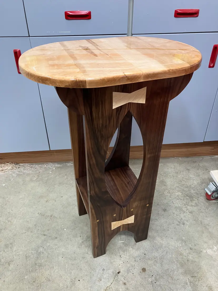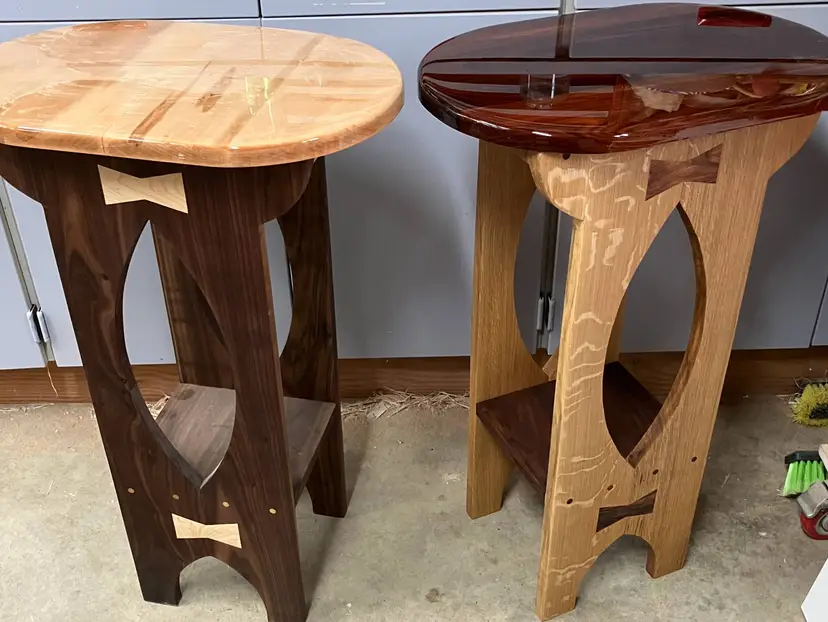 Dimensionally Matched Hand Crafted Pair Of Hardwood Tables. Bolivian Rosewood and Limba , Walnut And Birds Eye Maple Complement Each Other. The Wood is Easily Maintained With Howard's Feed And Wax. The Tops are Rock Hard Epoxy.