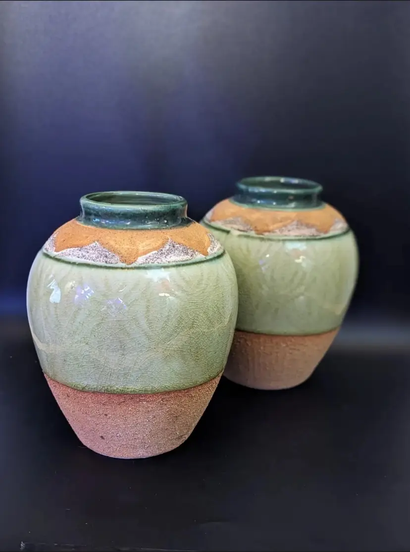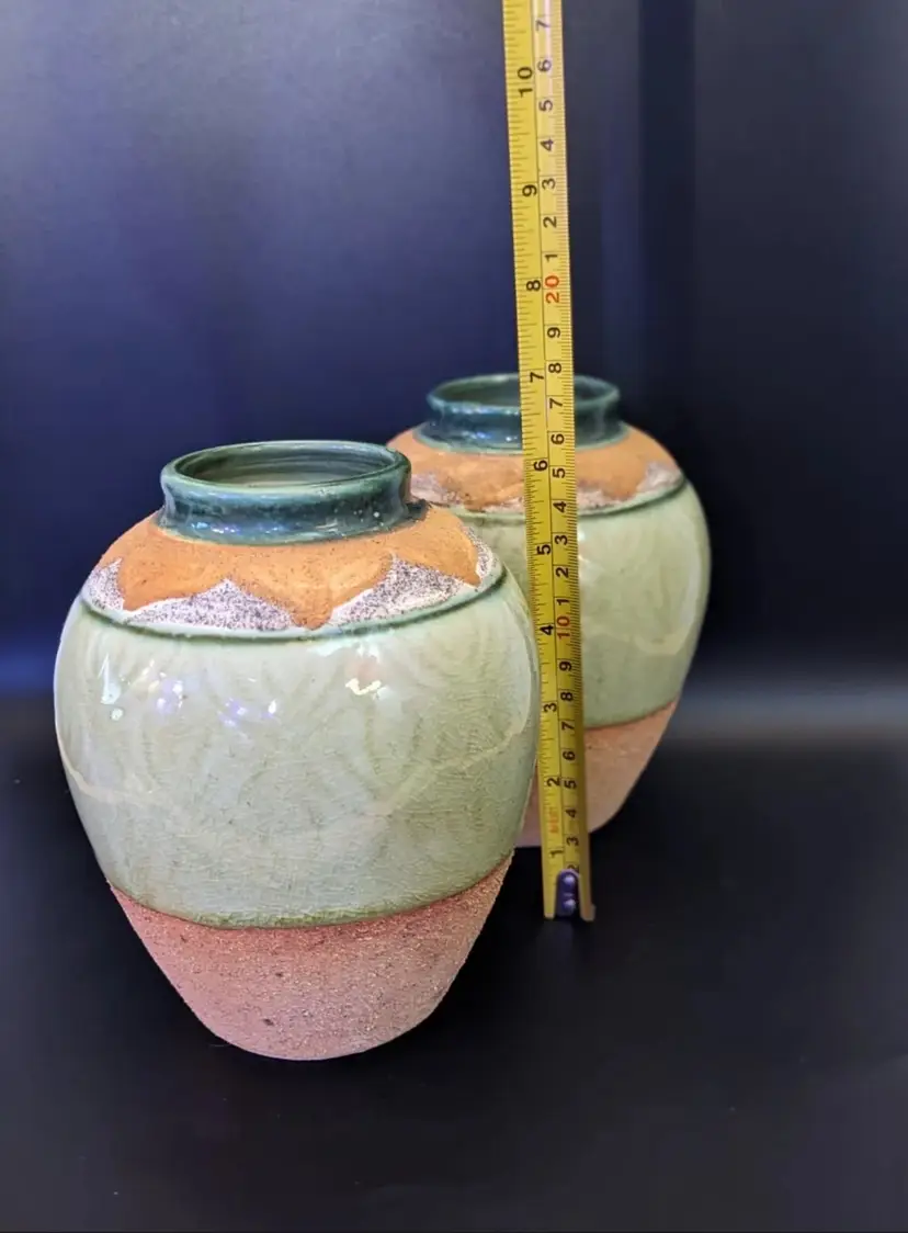 This beautiful set of two handcrafted ceramic vases is a stunning addition to any home decor. The abstract pattern and textured features make for a unique and eye-catching design. The vases come in a beautiful green and peach color, adding a pop of color to any room. These vases were made in Vietnam. The brand is not specified, but the quality craftsmanship and attention to detail are evident in each vase. These vases are perfect for anyone who loves art deco style and is looking for a one-of-a-kind piece for their home.