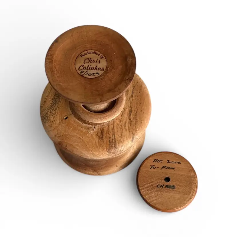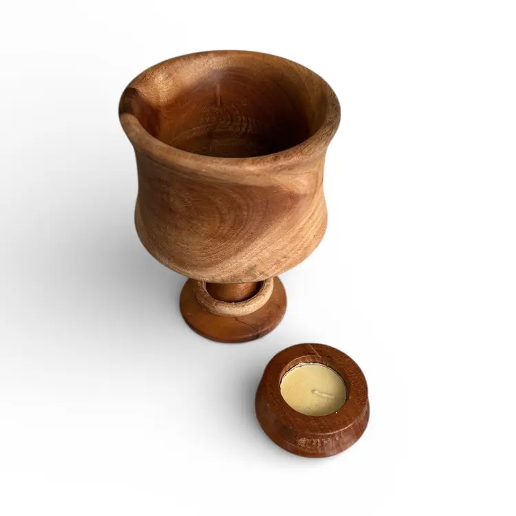 Elevate your table setting with this beautifully handcrafted wooden goblet candle holder. Perfect as a unique decorative piece. Size: 4.5” x 6”