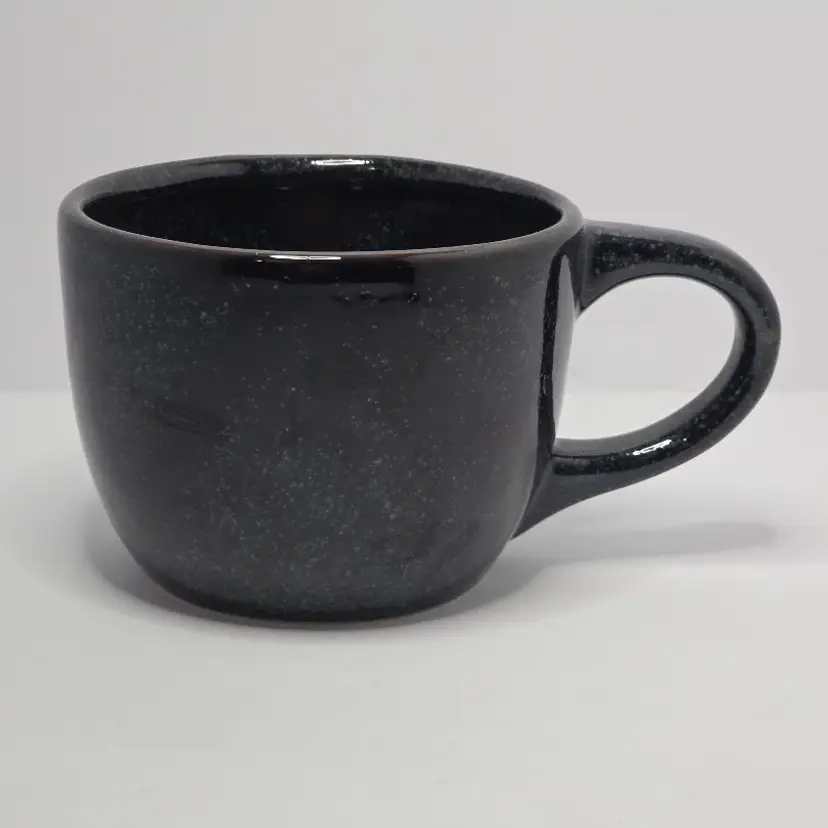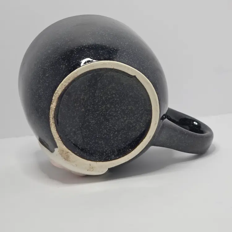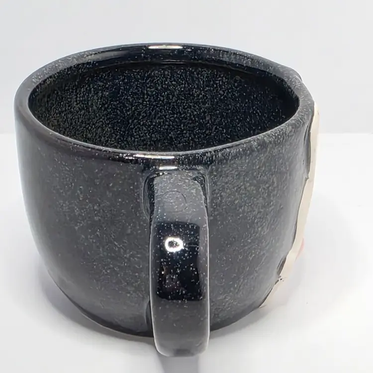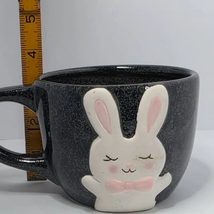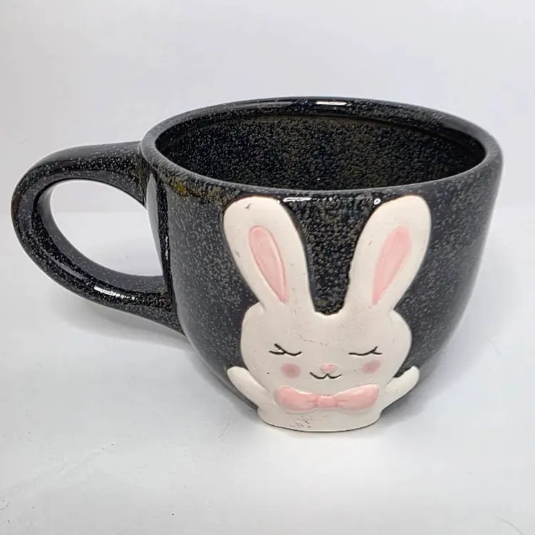 Charming black ceramic mug featuring a cute bunny with a pink bow. Perfect for adding a touch of whimsy to your morning coffee routine or as a delightful gift for bunny lovers.