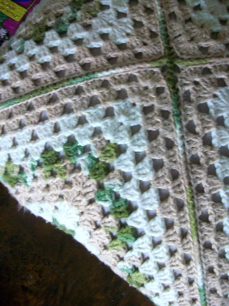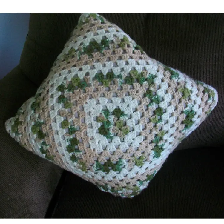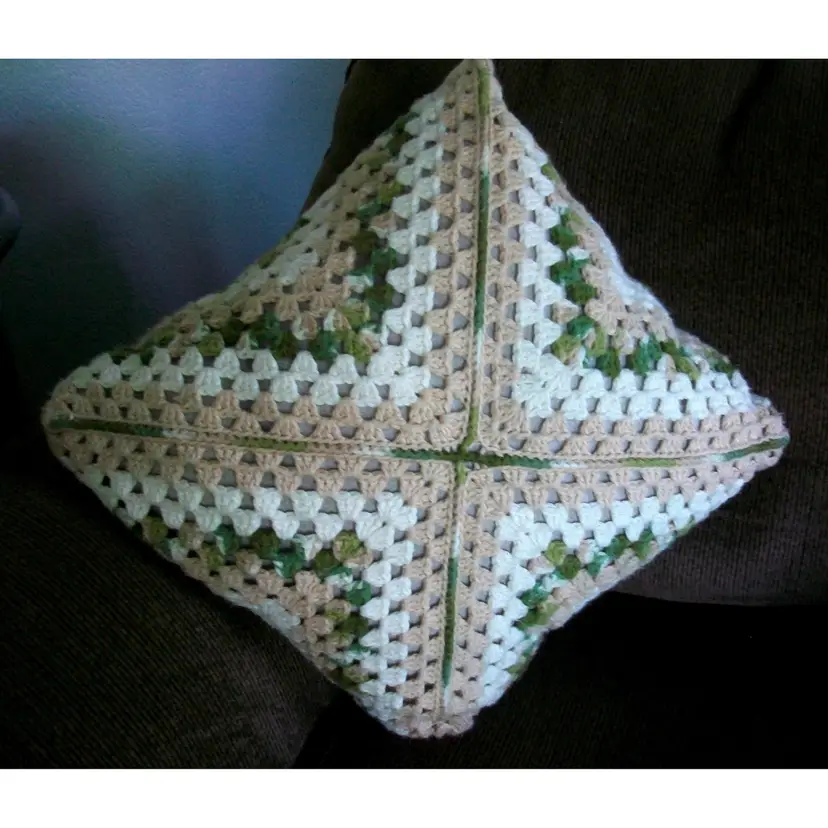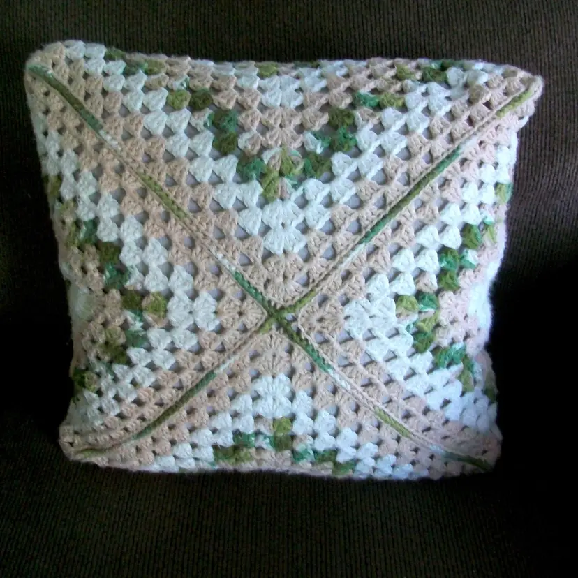 A large crochet granny square Mix of green, beige, creamy white cotton yarn. Size 16" x 16" machine washable, cold water, tumble dry low perfect for adding a pop of color and texture to your living space. Great for couches, chairs, beds.