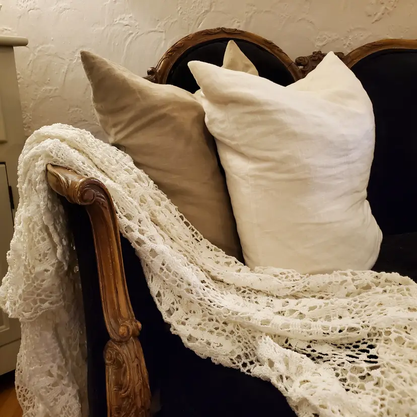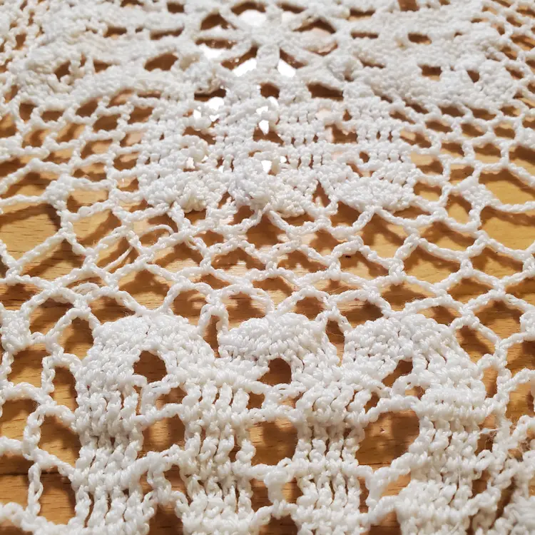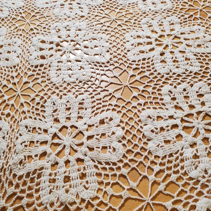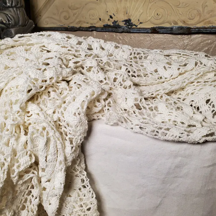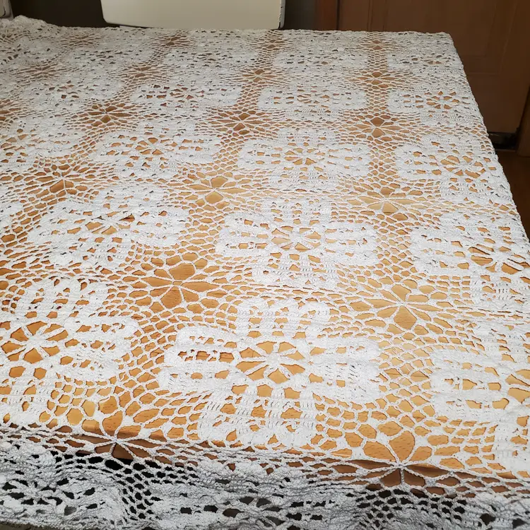 This is a gorgeous hand crocheted tablecloth or throw for a sofa or bed. No holes. Various tied off threads that can be trimmed. 56" x 84"
