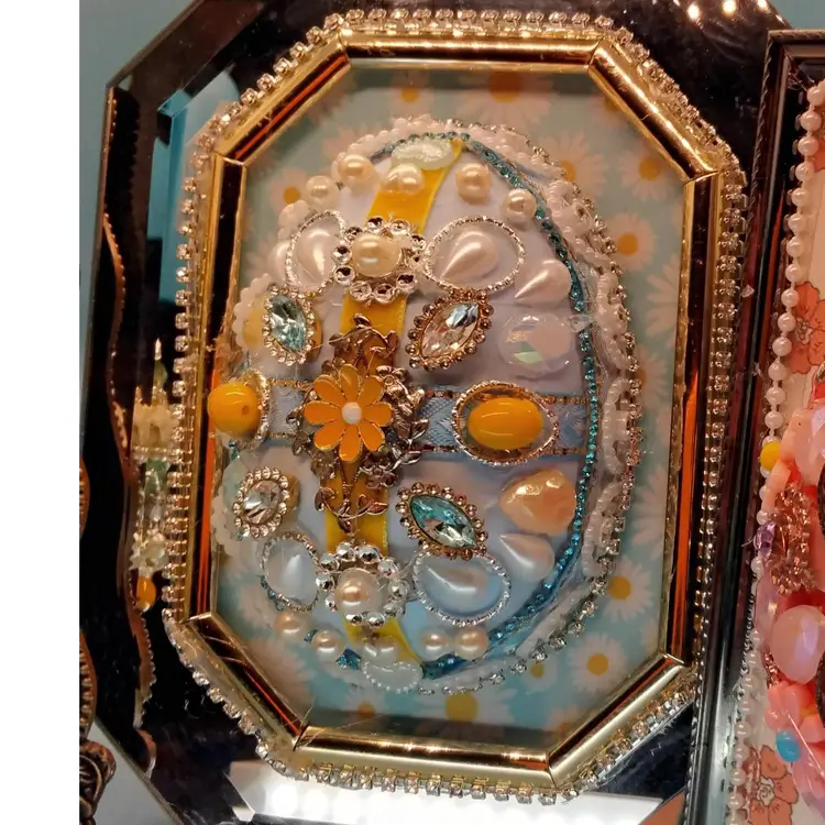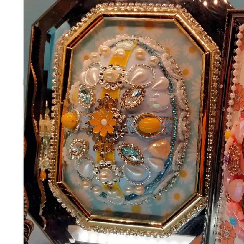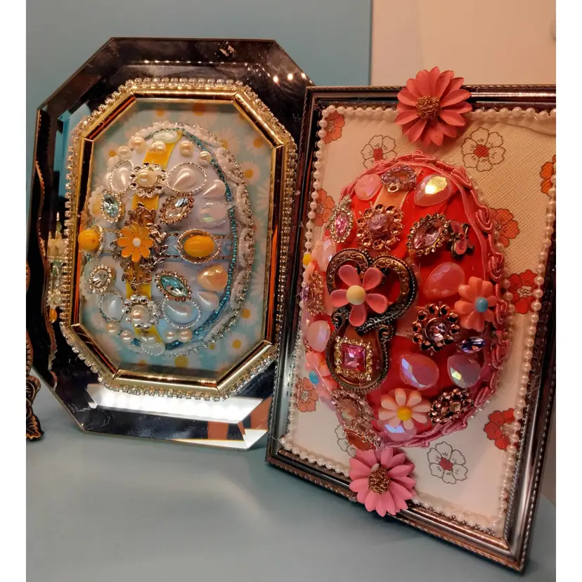 These Easter Eggs Are hand decorated in foam fabrics, then adorned with color co-ordinated jewels, vintage jewelry. And trinkets. Mounted in Ornate frames, they are perfect for displaying on table tops.