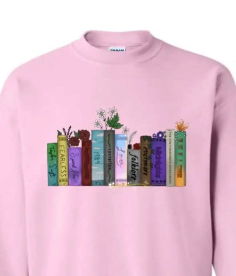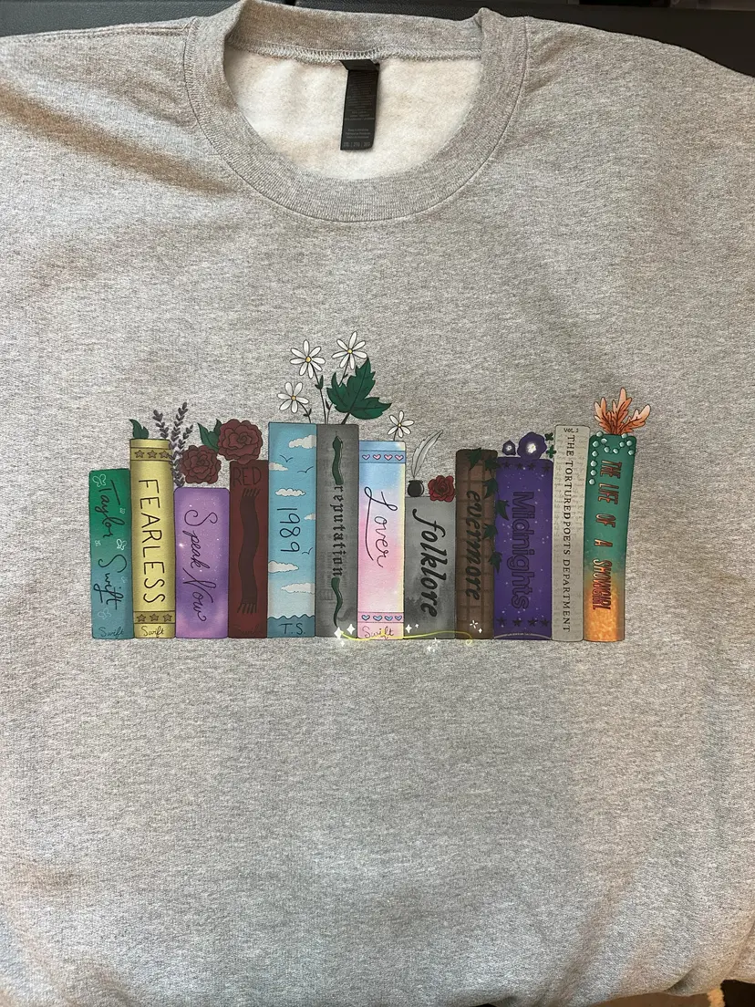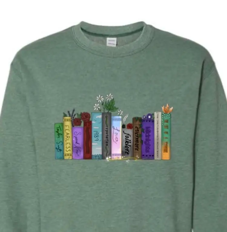 Celebrate your love of music and art with this one-of-a-kind crewneck sweatshirt featuring a hand-drawn bookshelf of Taylor albums. Every detail was created by an independent artist (not AI).