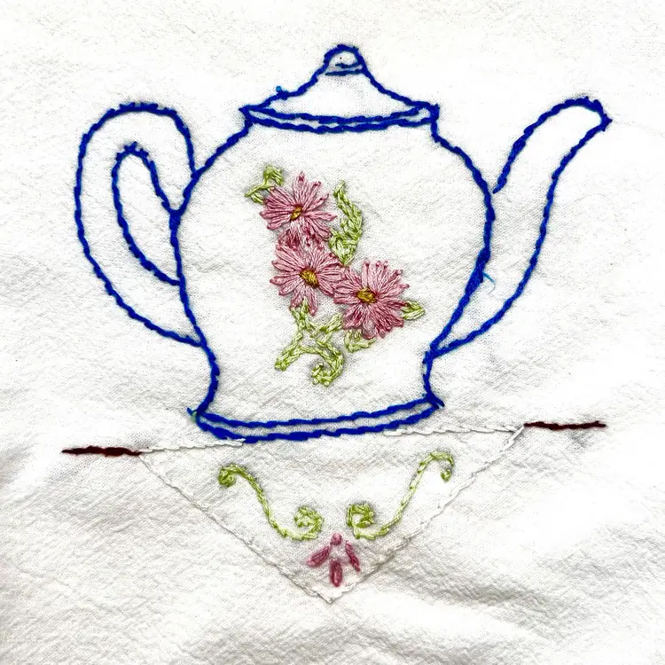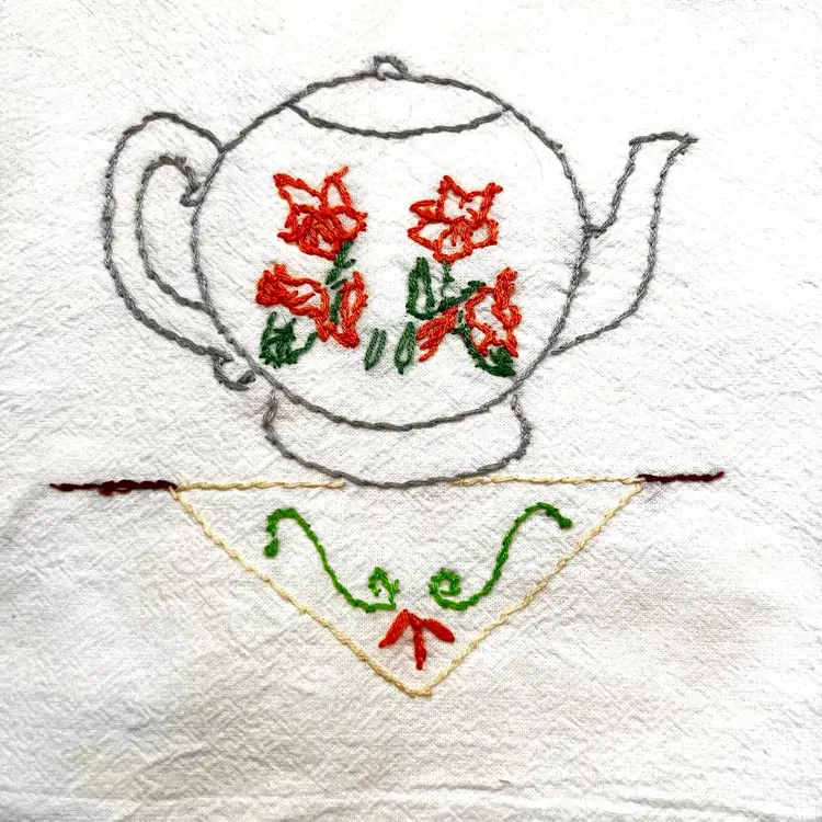 Charming hand-embroidered floral tea pots. Embroidery is approximately 6x6 inches. Tea towels are standard weight and size.