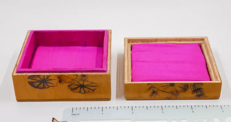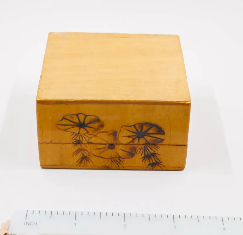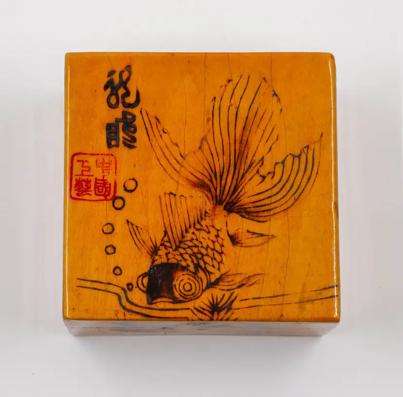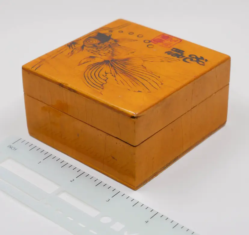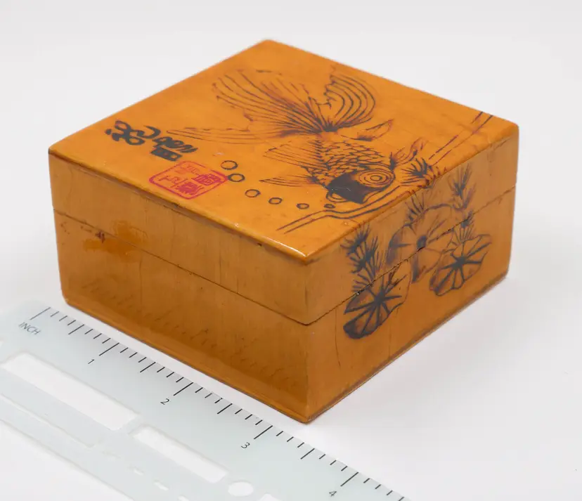 A small, 3.25" x 2", square wooden box with a lid. The exterior is etched with a design of a goldfish swimming among lily pads, with etched lines representing water. The lid features a square red seal and hand-etched Chinese characters, both in a style often seen in mid-20th-century Asian art exports. The interior is lined with a vibrant, fuchsia-colored silk fabric. The goldfish is a symbol of good luck and prosperity in Chinese culture, while the lotus or lily pads represent purity and rebirth. In good condition, but note there is a small flea bite on the edge corner of the lid, not within the design (can be seen on 4th photo). The finish shows crazing due to age but does not effect function of the box.