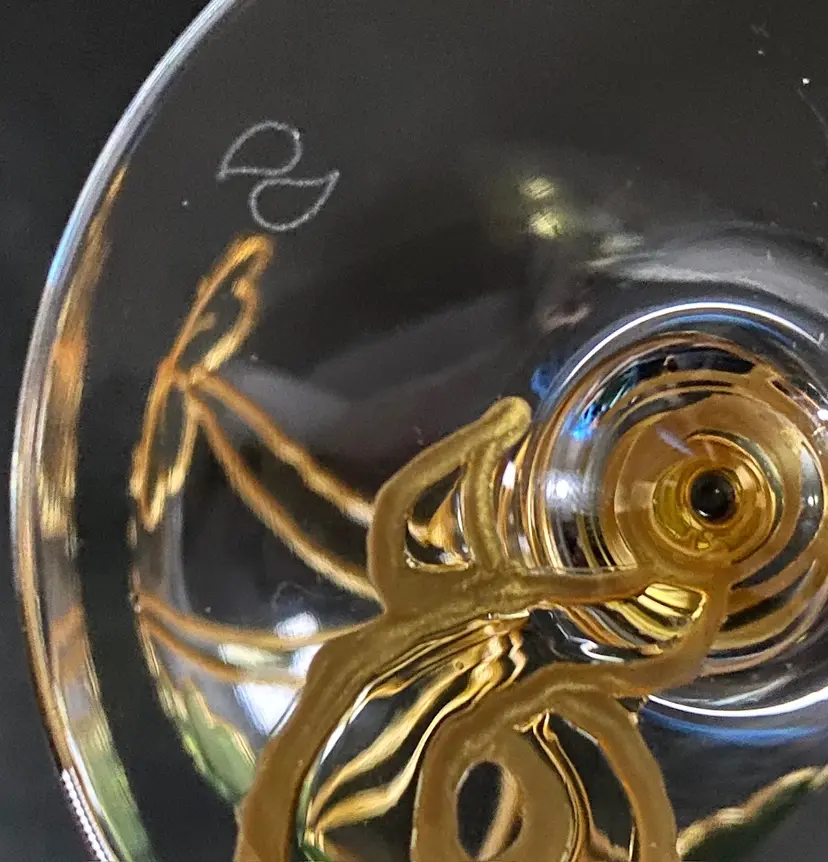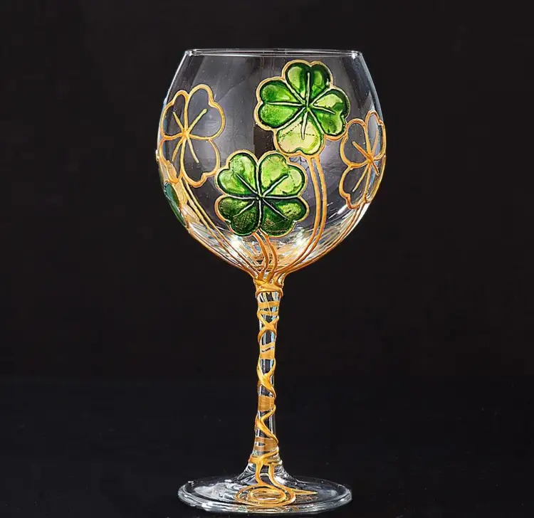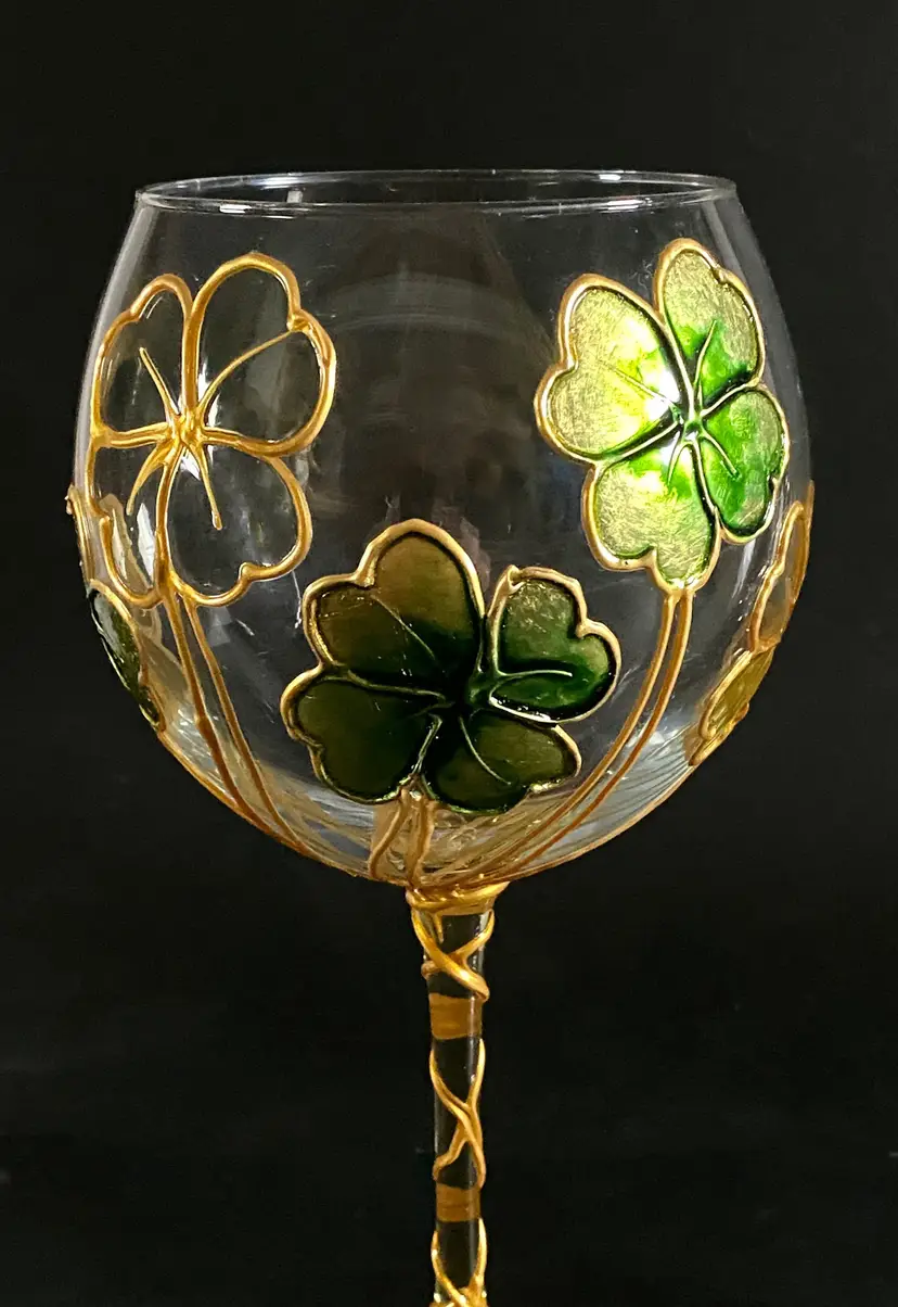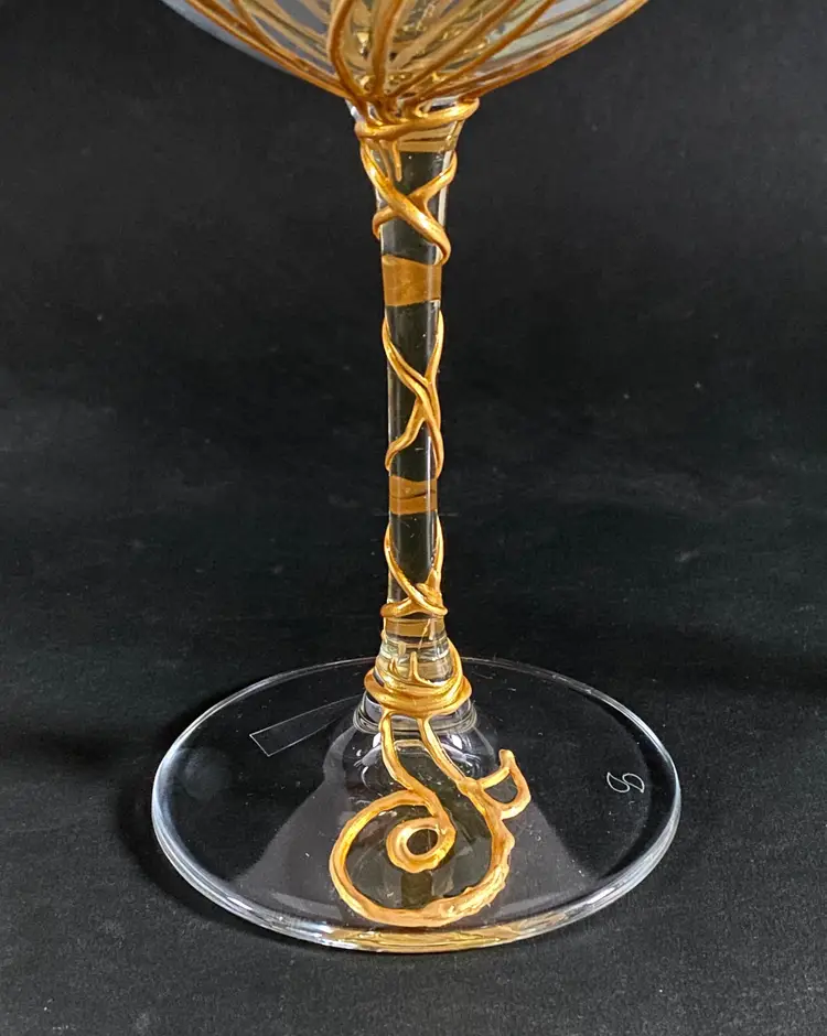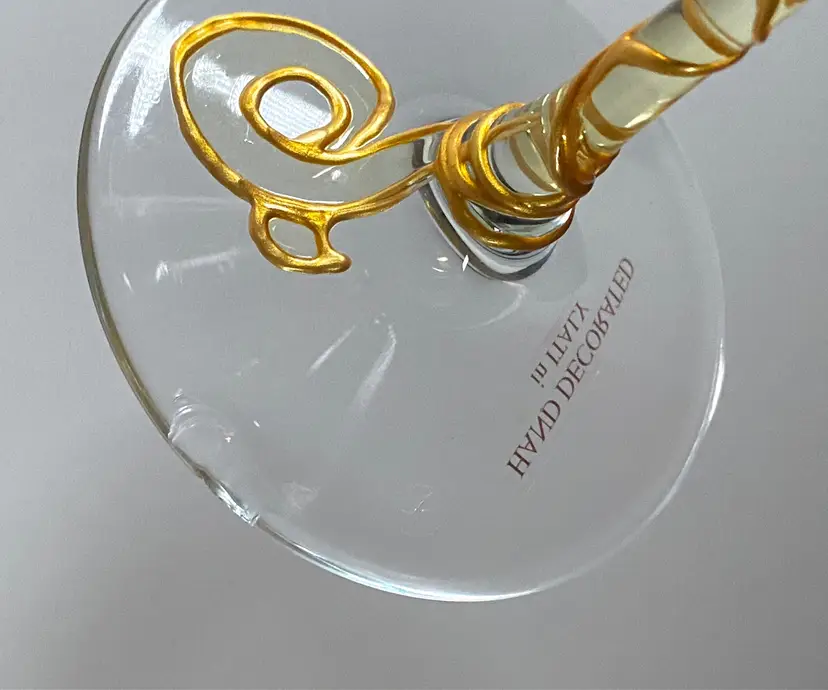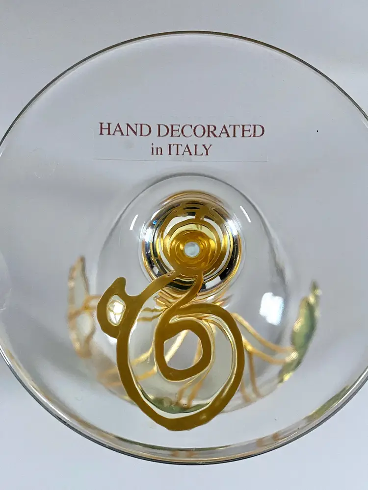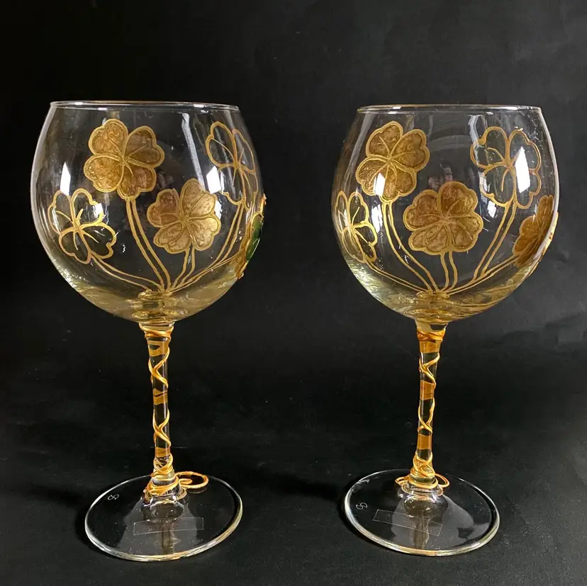 Beautifully handcrafted for Uno Alla Volta and hand decorated in Verona, Italy by Amedeo, each glass is applied with stucco shamrocks, then a layer of color and gold leaf is added by hand. Once dry, each is hand-polished to a gleaming luster. Overall, these glasses are in good pre-owned condition, with the exception of a small ding on the base of one of the glasses (please view the provided picture). Dimensions: 8.5" tall, 20 oz. capacity. Set of 2